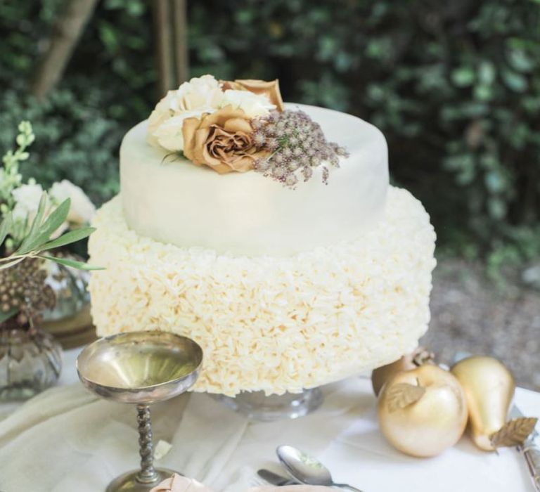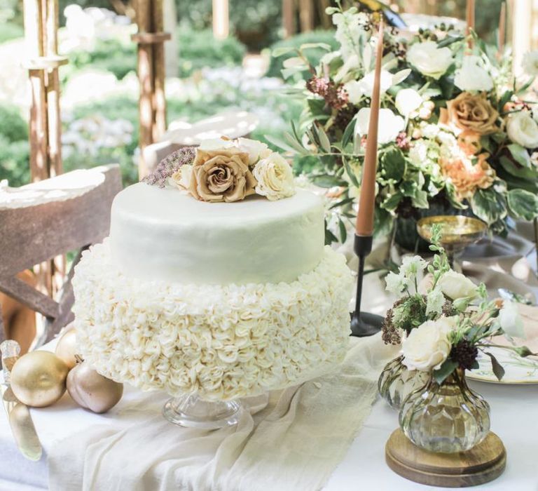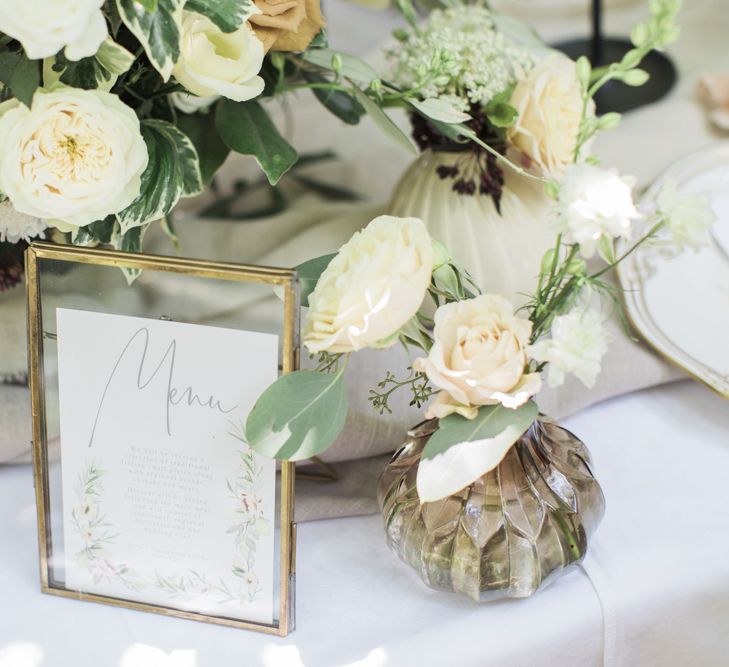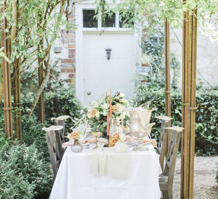 Moving around the gardens (lovingly maintained by the owners, including water features, statues, topiary and a rose walk), the photographer was spoilt for choice for pictures. Whether it was the impressive gold-topped gates leading to the secret garden or the pergola under which the elegant table was staged. Laden with delicate linens, glassware and crockery - upon which sat calligraphy scribed place cards (inviting guests to sit down to the sumptuous wedding breakfast), the goblets are waiting for champagne to be poured whilst the mouth-watering cake was calling out to be cut by the happy couple.