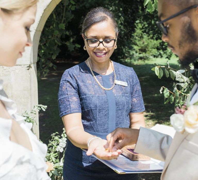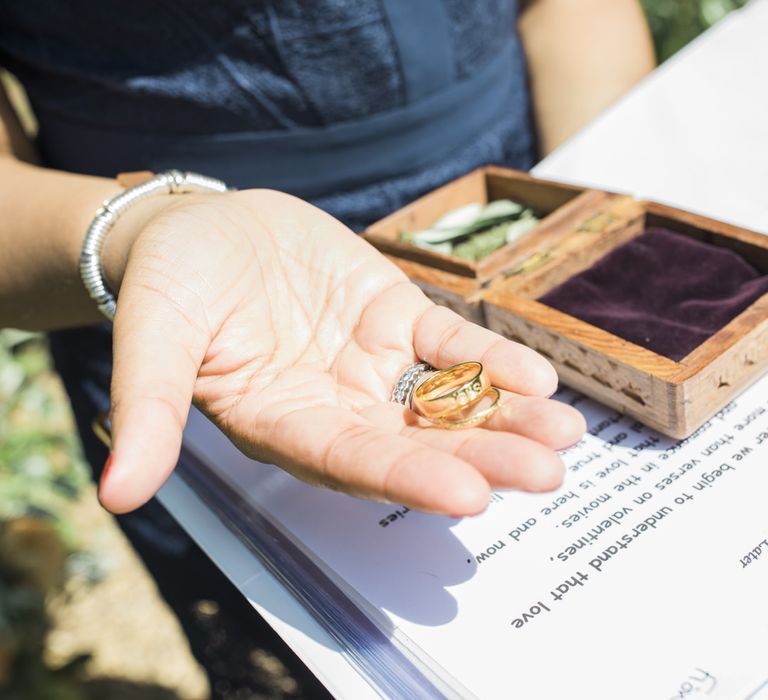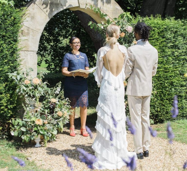 Vows are said at the top of a lavender lined aisle where the romantic wedding celebration ceremony takes place from under an arbour. Before rings are exchanged the Celebrant holds them out to guests who are asked to send their love, silent wishes and support for the couple. When the rings are then slipped onto the couple’s fingers they will then hold all the loving hopes, dreams and joy for the future from their loved ones.