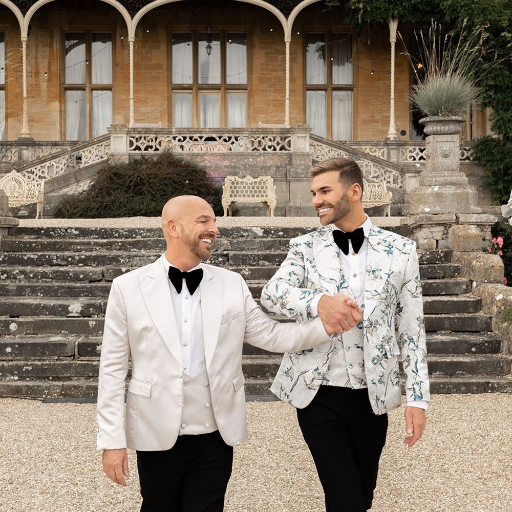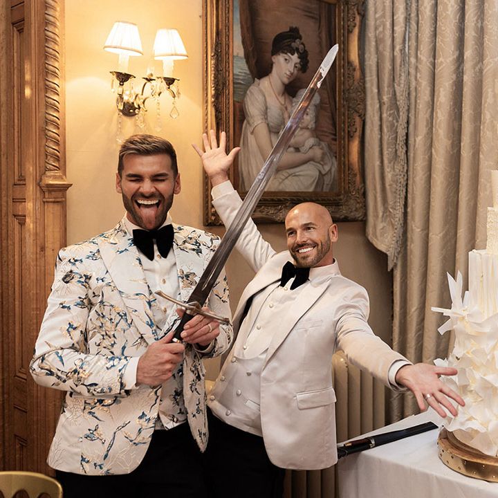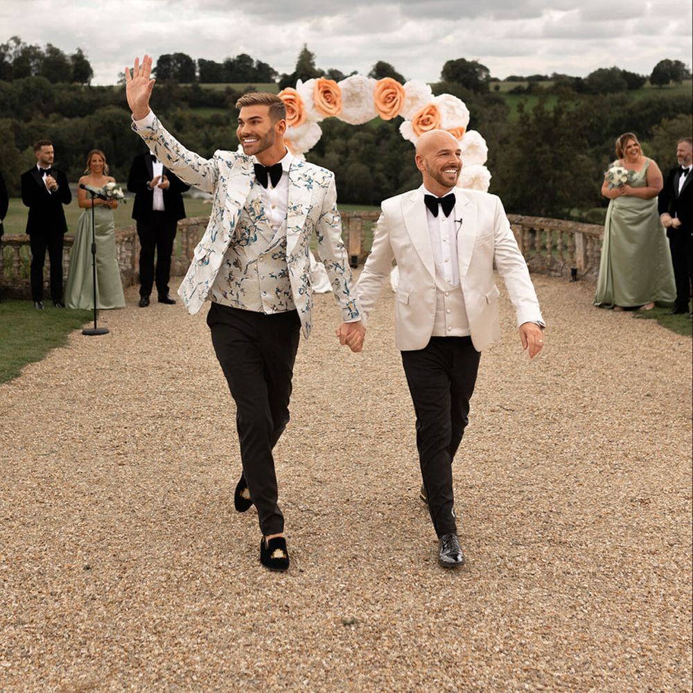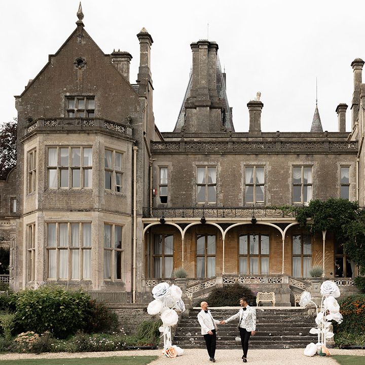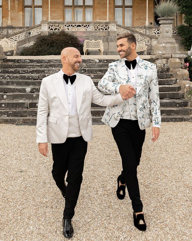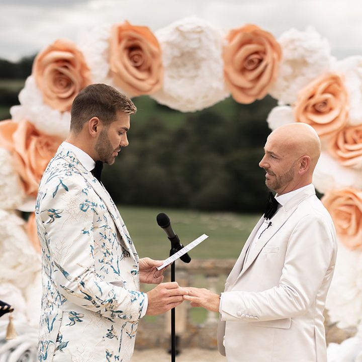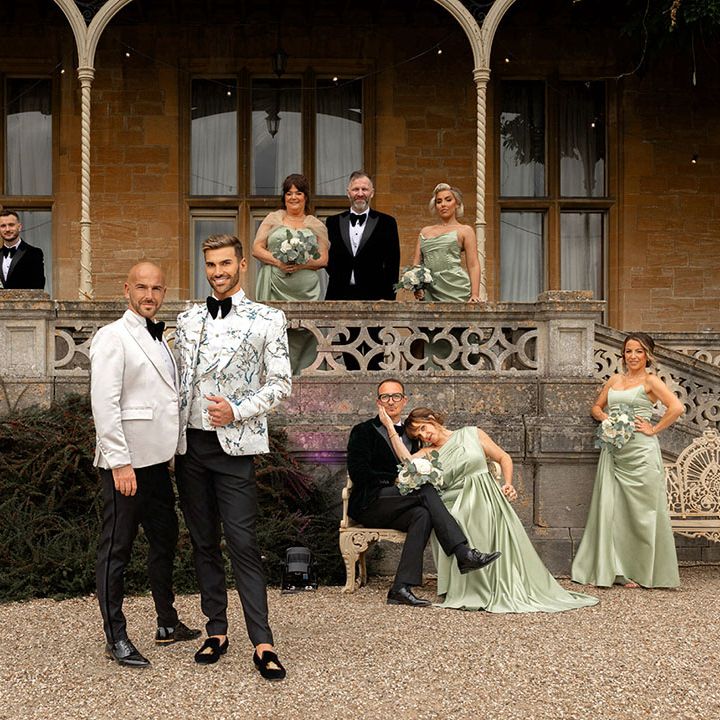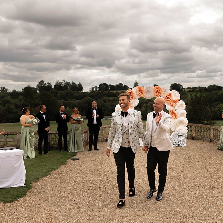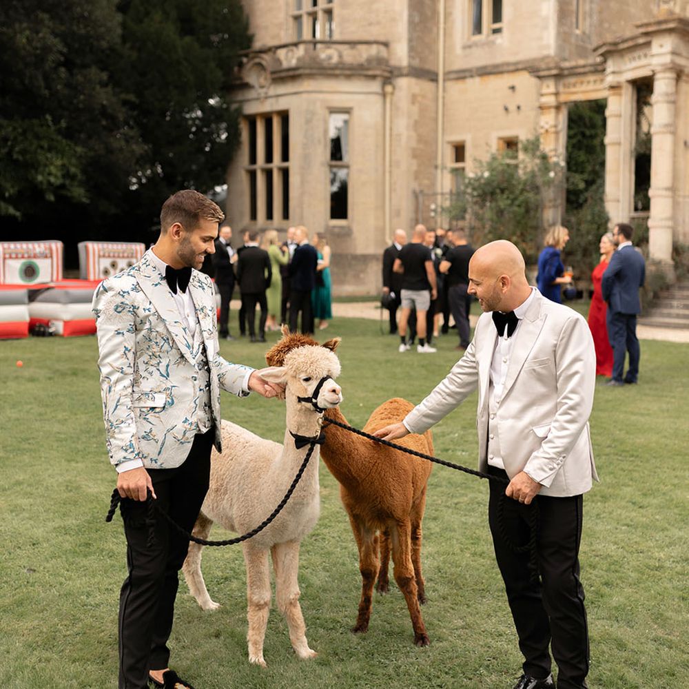 Jamie & Nathan put their own touch on Orchardleigh Estate and transformed the Gothic country house wedding venue into something modern and luxe. The couple had a high-tech lighting design around the whole venue so it was perfect for pics! They made their grand entrance arriving on a helicopter! What a movie moment! For entertainment, they had alpacas roaming around (so cute!) and plenty of games to keep guests entertained during the in-between moments of the order of the day. Keeping with the glitz and glam vibes, Jamie & Nathan had an all-white seven-tier wedding cake that they cut together with a sword! For the altar backdrop, the grooms arranged for an arch to be made out of 6-foot-tall handmade Italian paper flowers. Wow! Each guest also received a personalised box with the couple’s wedding crest on for their favours. Of course, the day had to end with a bang…a seven-minute firework display to the couple’s favourite song, Barcelona by Freddie Mercury.