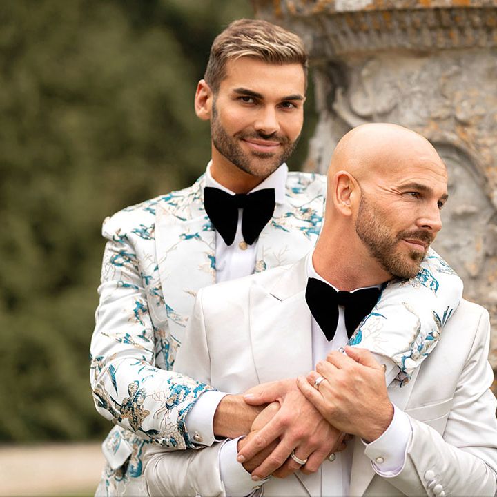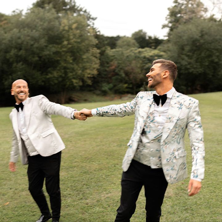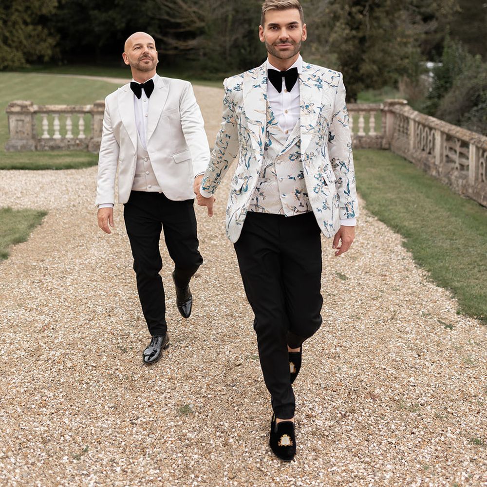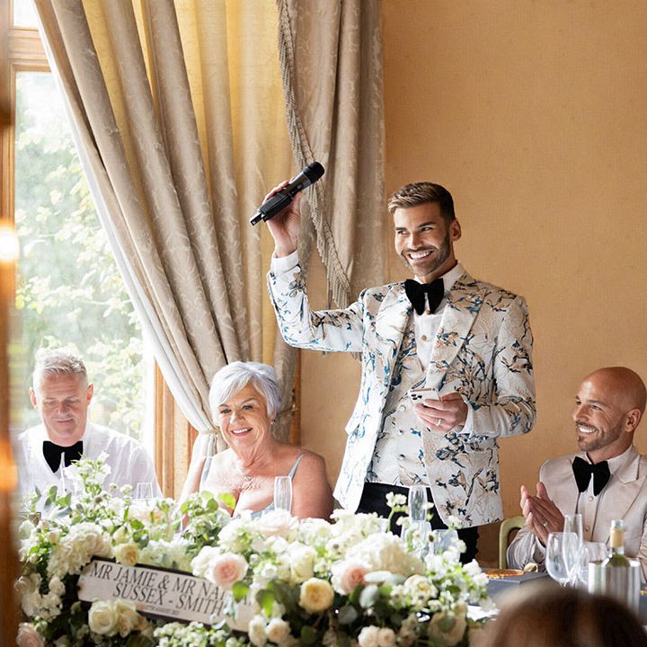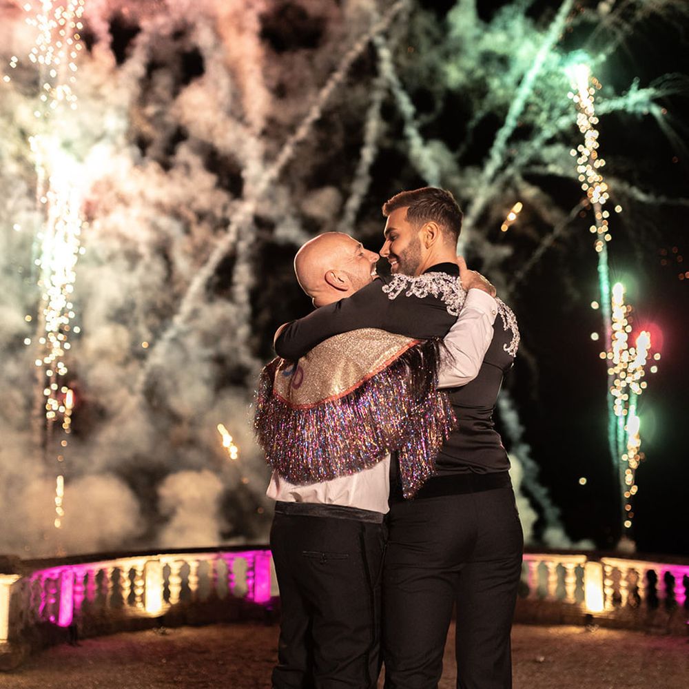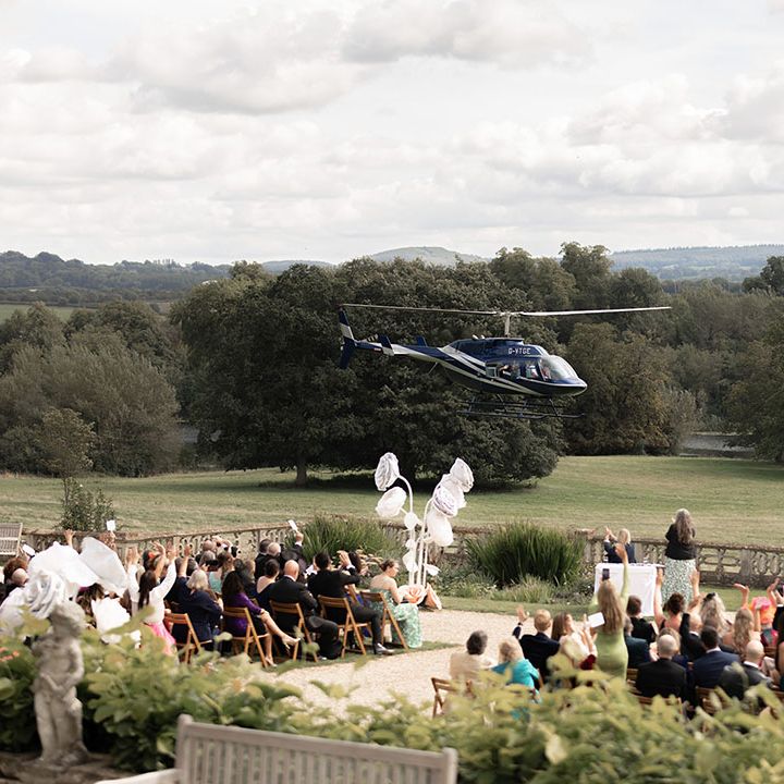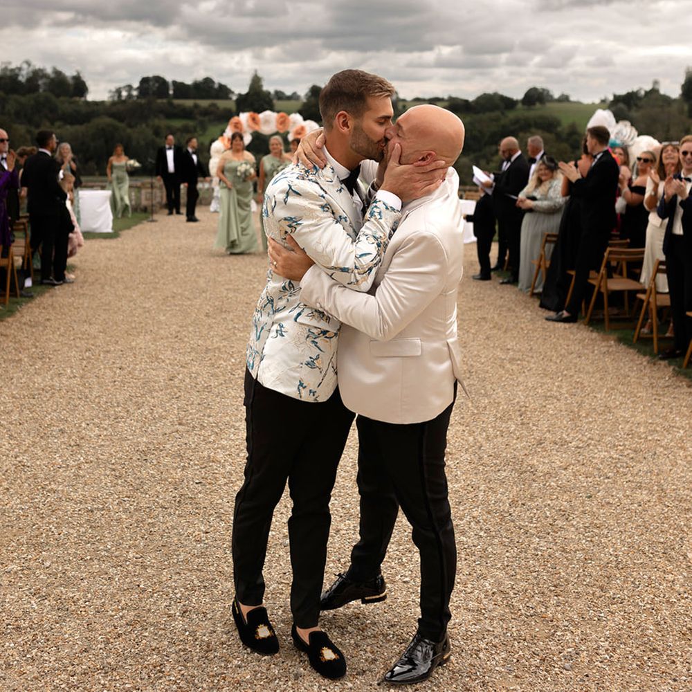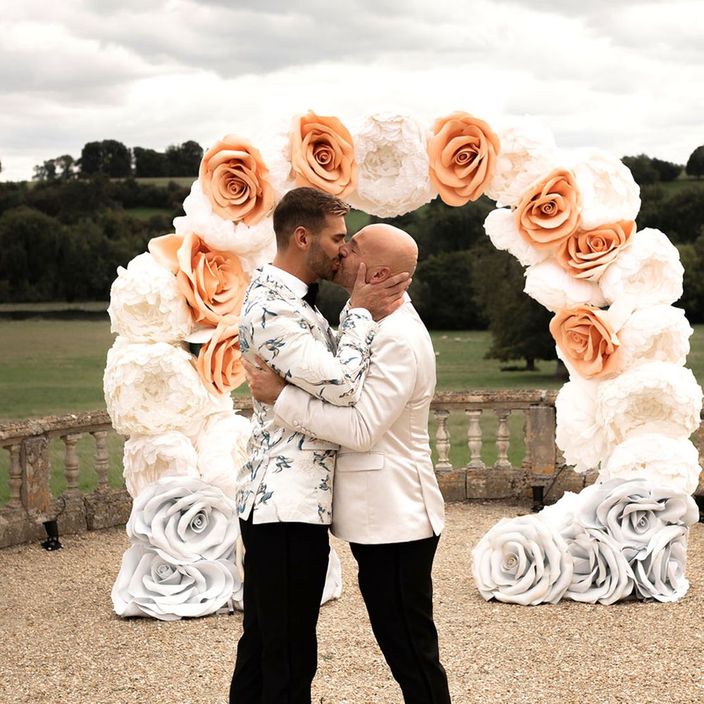 Jamie & Nathan put their own touch on Orchardleigh Estate and transformed the Gothic country house wedding venue into something modern and luxe. The couple had a high-tech lighting design around the whole venue so it was perfect for pics! They made their grand entrance arriving on a helicopter! What a movie moment! For entertainment, they had alpacas roaming around (so cute!) and plenty of games to keep guests entertained during the in-between moments of the order of the day. Keeping with the glitz and glam vibes, Jamie & Nathan had an all-white seven-tier wedding cake that they cut together with a sword! For the altar backdrop, the grooms arranged for an arch to be made out of 6-foot-tall handmade Italian paper flowers. Wow! Each guest also received a personalised box with the couple’s wedding crest on for their favours. Of course, the day had to end with a bang…a seven-minute firework display to the couple’s favourite song, Barcelona by Freddie Mercury.