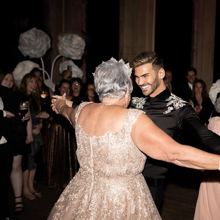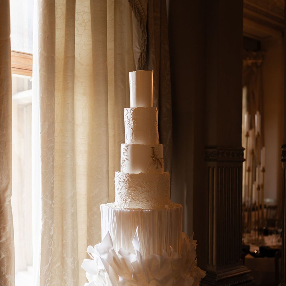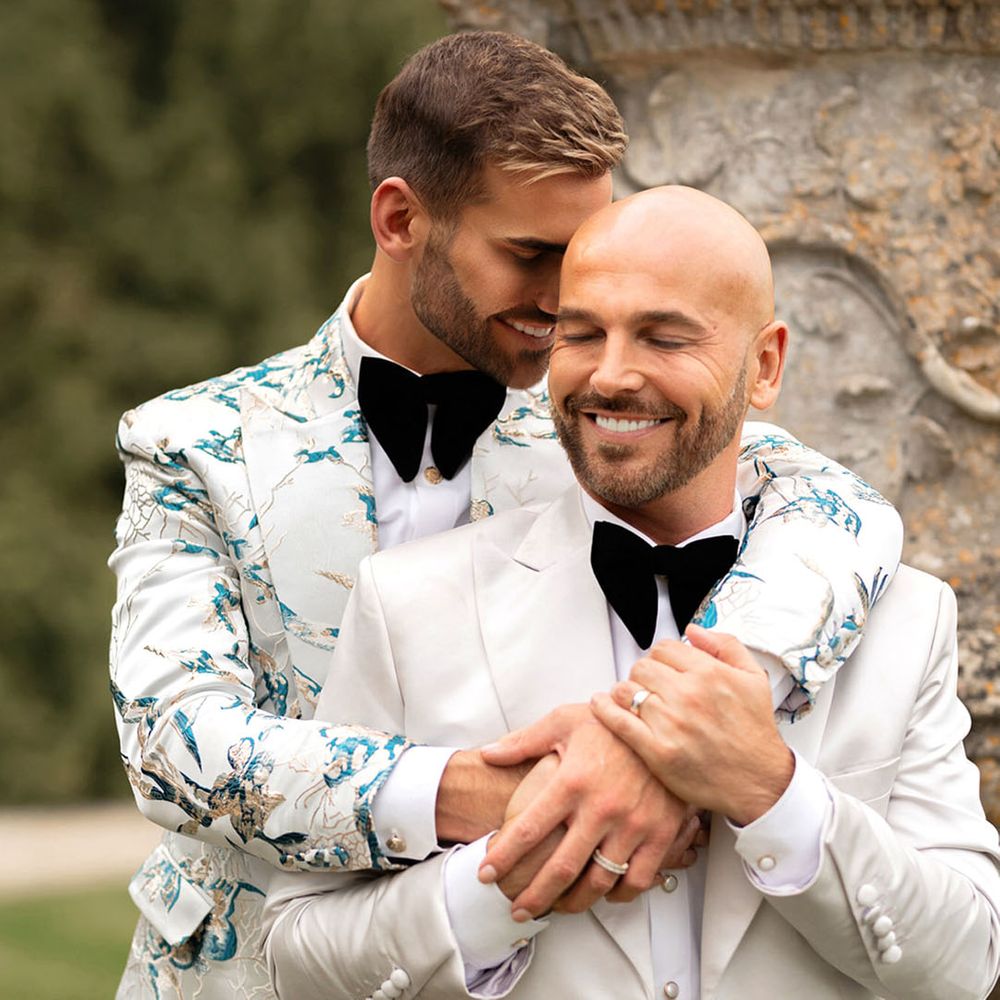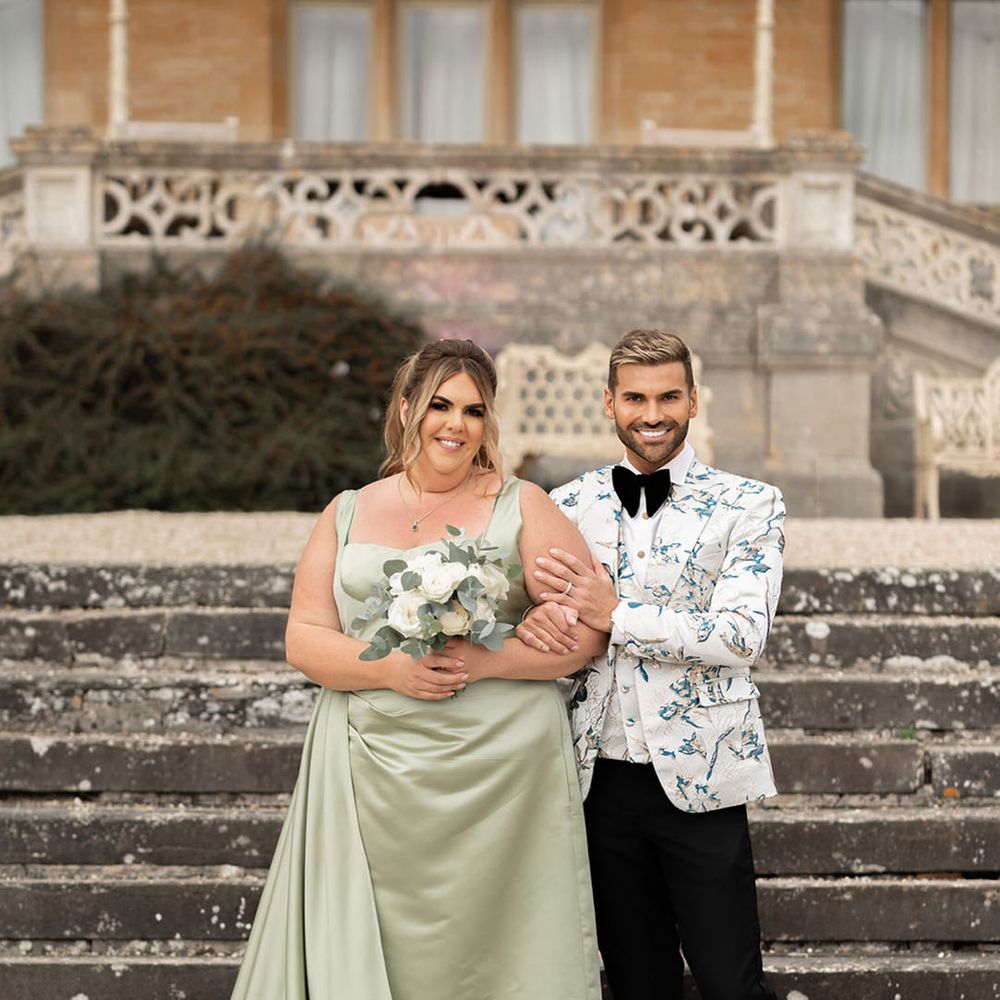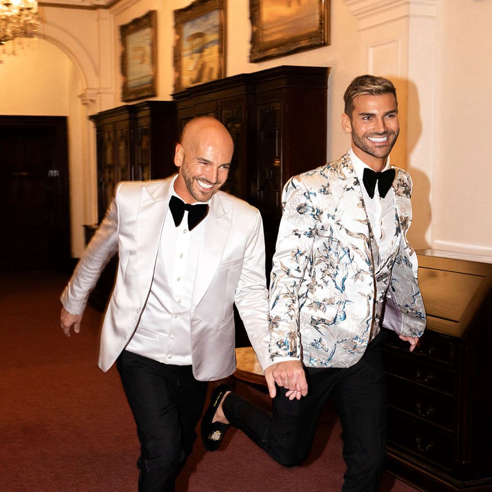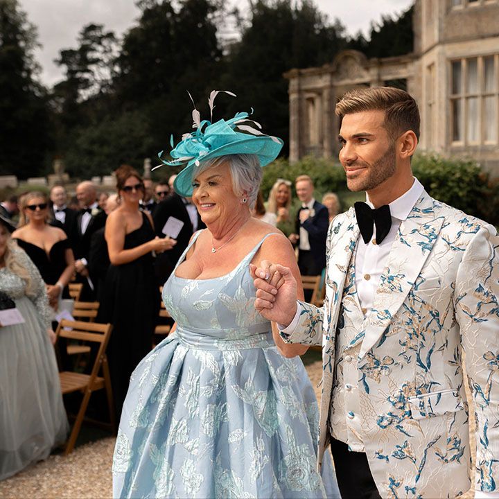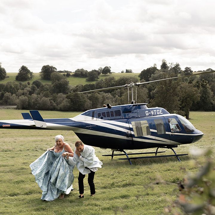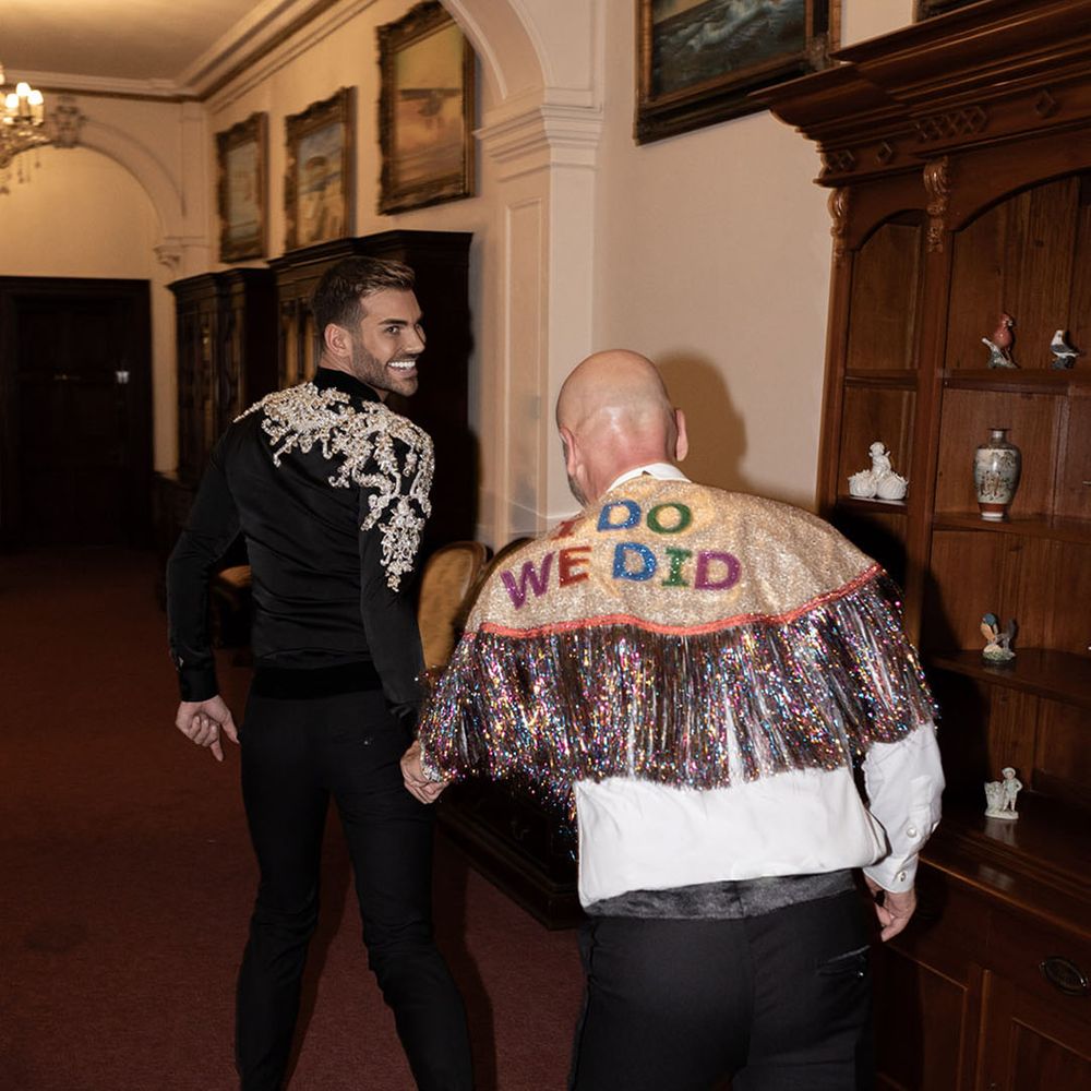 Jamie & Nathan put their own touch on Orchardleigh Estate and transformed the Gothic country house wedding venue into something modern and luxe. The couple had a high-tech lighting design around the whole venue so it was perfect for pics! They made their grand entrance arriving on a helicopter! What a movie moment! For entertainment, they had alpacas roaming around (so cute!) and plenty of games to keep guests entertained during the in-between moments of the order of the day. Keeping with the glitz and glam vibes, Jamie & Nathan had an all-white seven-tier wedding cake that they cut together with a sword! For the altar backdrop, the grooms arranged for an arch to be made out of 6-foot-tall handmade Italian paper flowers. Wow! Each guest also received a personalised box with the couple’s wedding crest on for their favours. Of course, the day had to end with a bang…a seven-minute firework display to the couple’s favourite song, Barcelona by Freddie Mercury.