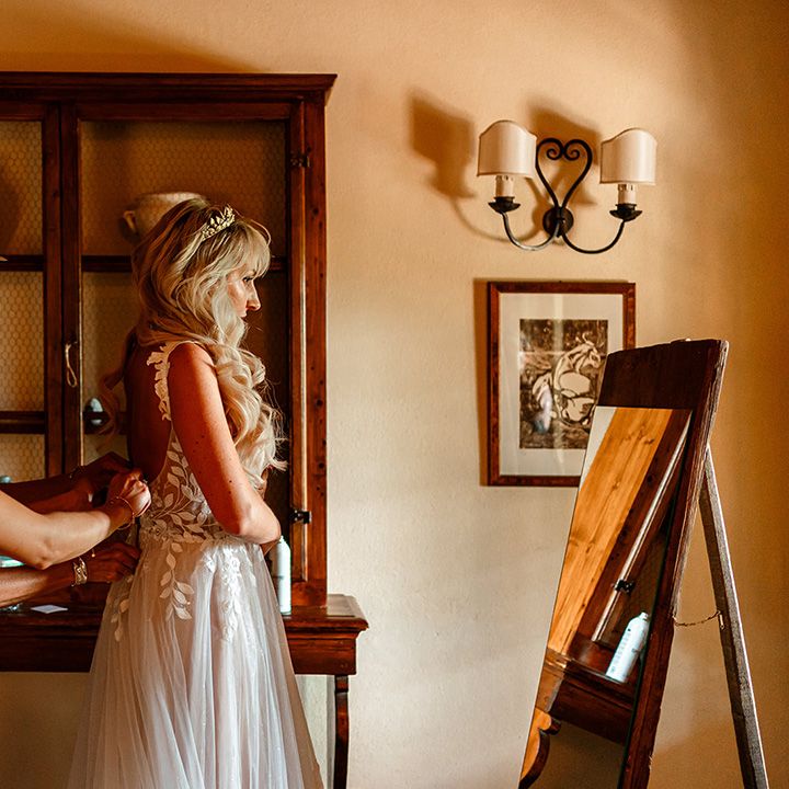 "Make the most of the morning before your ceremony. It might not be the part that you put on your mood board, but it's such a gorgeous part of the day that goes by so fast. We were lucky in that one of our guests is a yoga teacher so she held a yoga class by the pool on the morning of our wedding and our other guests loved it. It was a great way for people to bond and get ready for the day ahead.