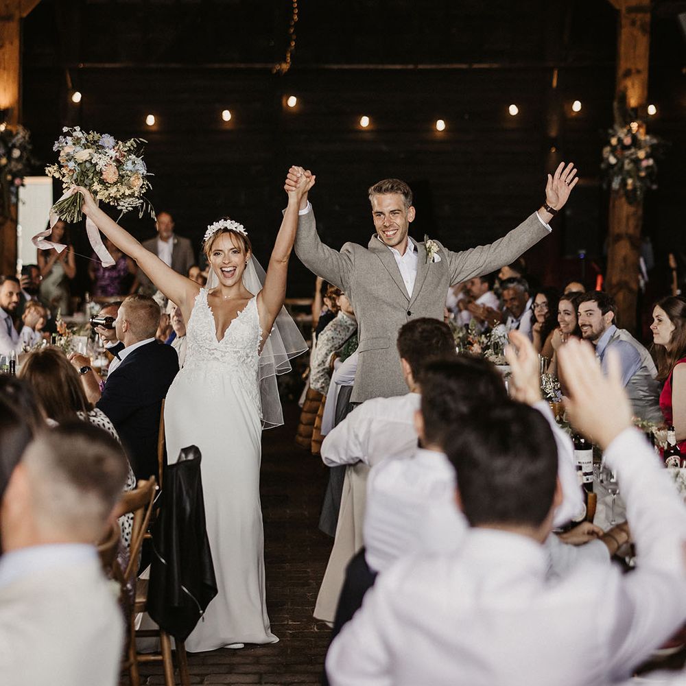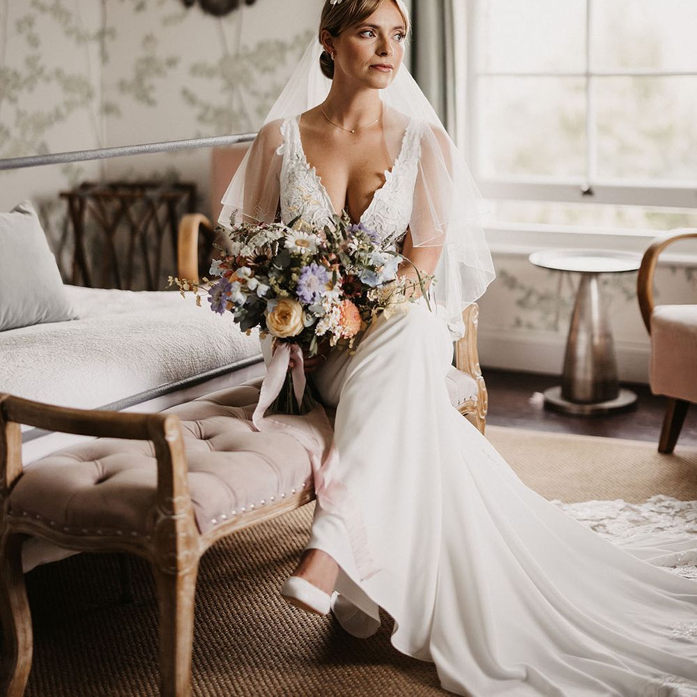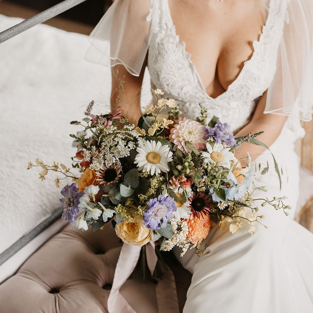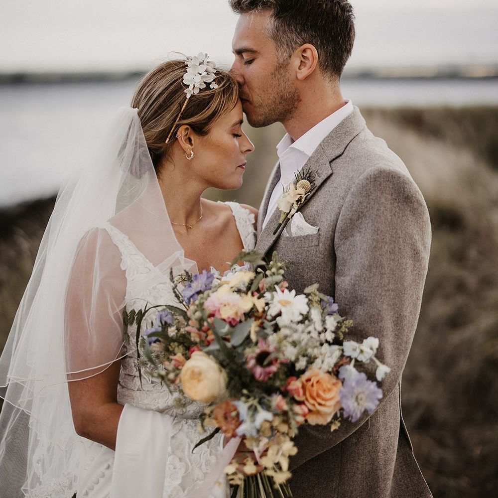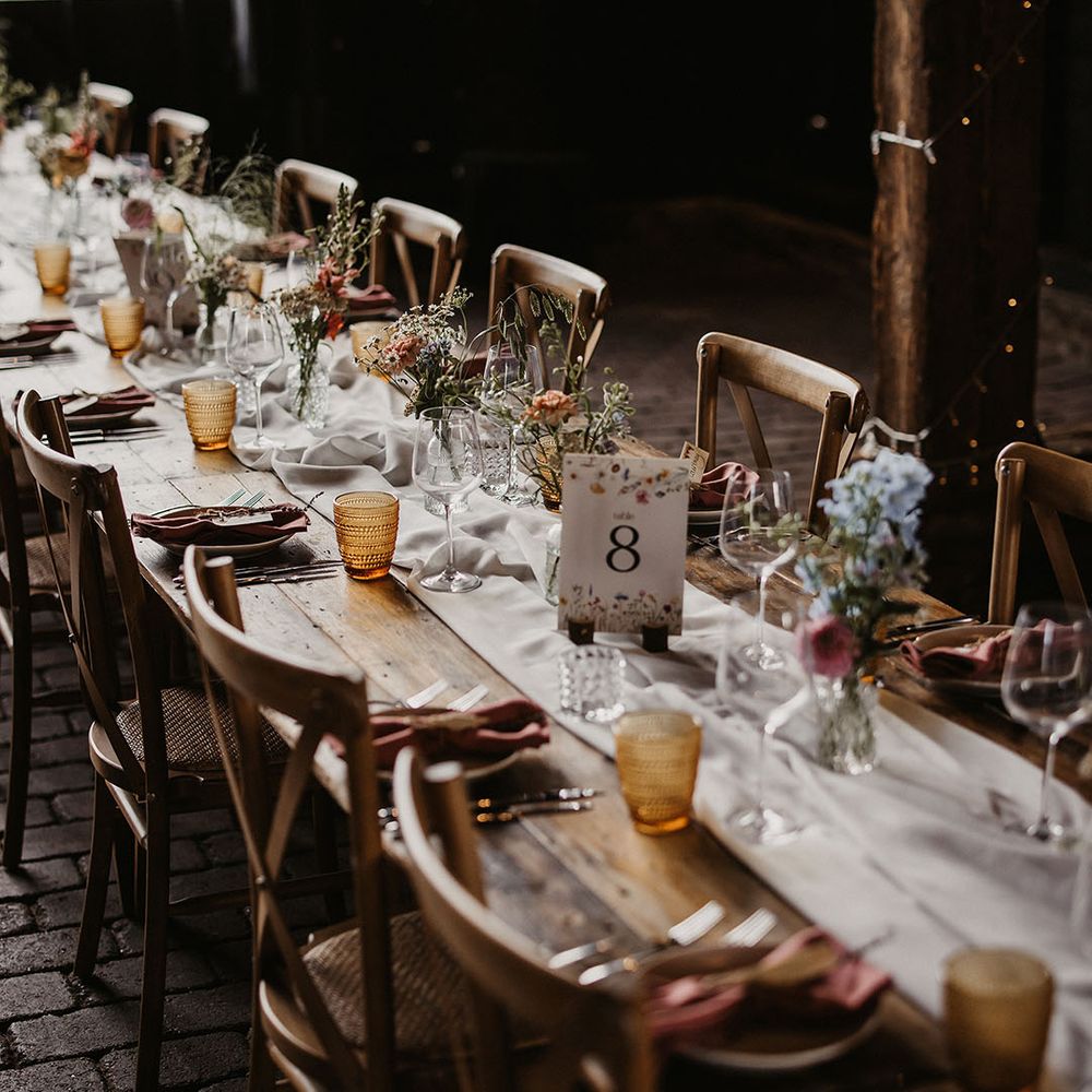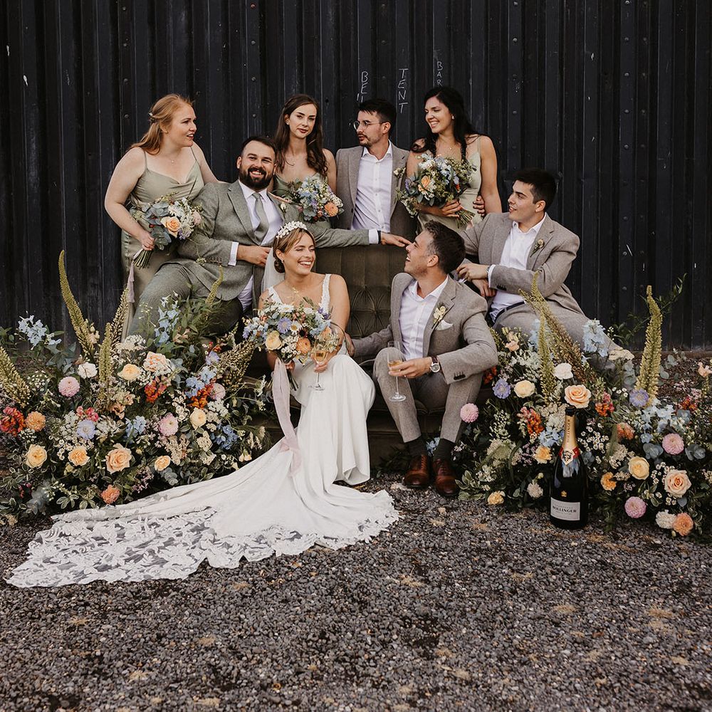 Lauren & Sam wanted their wedding to have a vibe that was a reflection of them, their interests and personalities. Their shared love of nature was a driving- force behind choosing the venue, with florals as the focal point of styling. The pastel blooms meant the rest of the decor was earthy with greens, amber and pinks. Sustainability-focused, Lauren & Sam ensured the blooms were reusable, moving them from ceremony to barn, bud vases for guests and pressing them post-wedding. Aisle flowers made perfect floor meadows at the end of each guest table and the ceremony meadows lined the front of the top table. Recommended Supplier, Moody Blooms, gave Lauren & Sam advice on how to press flowers from their arrangements to enjoy for years to come. Here’s what this fabulous florist has to say about wedding flowers.