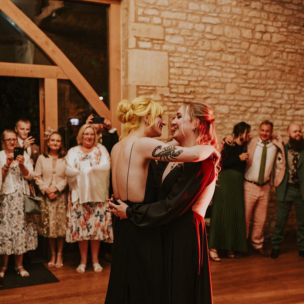 Our photographer, Ryan aka ShutterGoClick, orchestrated a beautiful first look: once all of the guests were inside the venue, I waited in the courtyard while Charlotte came out, and then we turned around to see each other in our dresses for the first time, with our bridespeople (and our dogs) watching. It was so moving, so emotional, and so special.