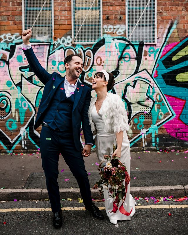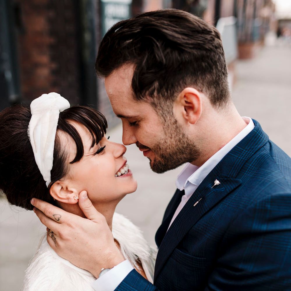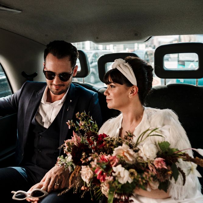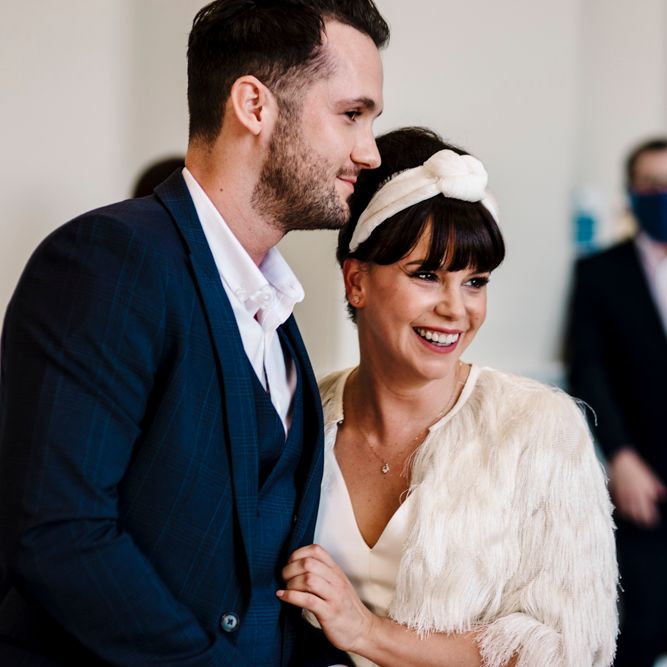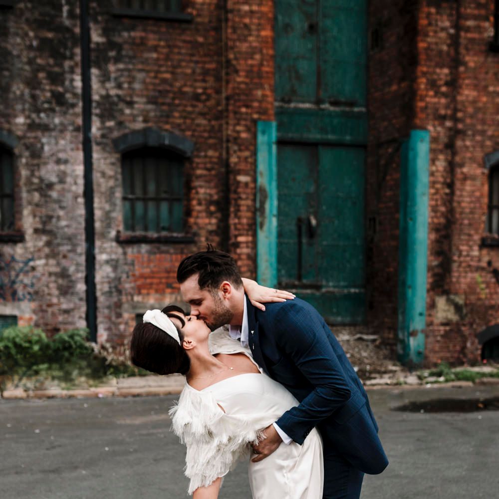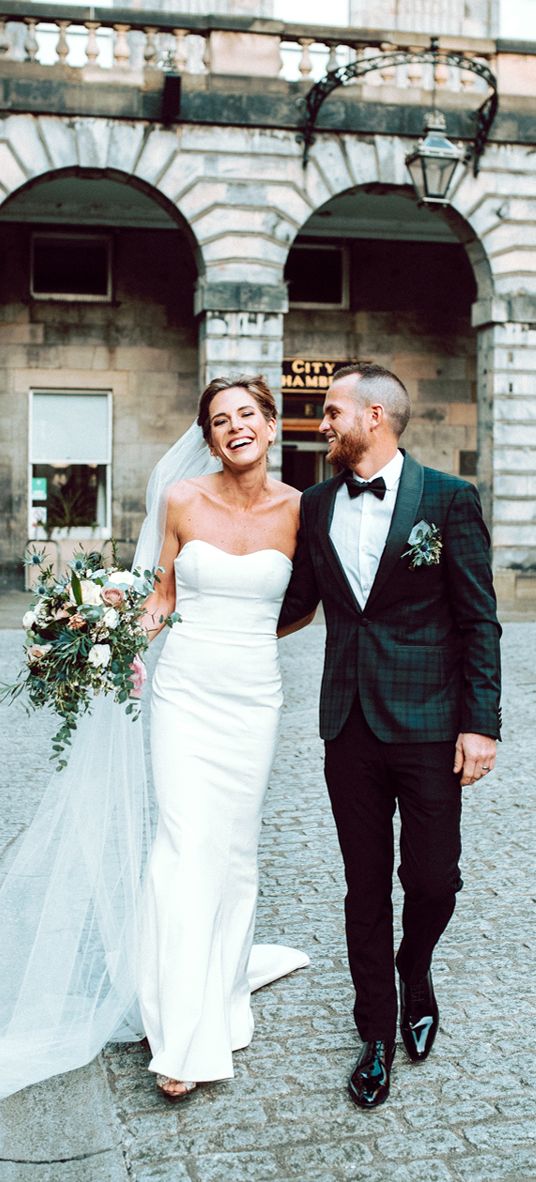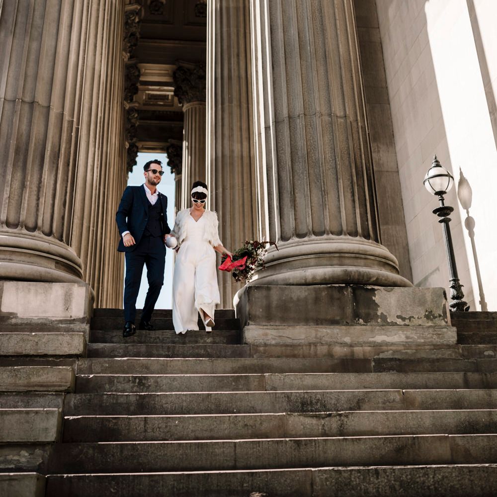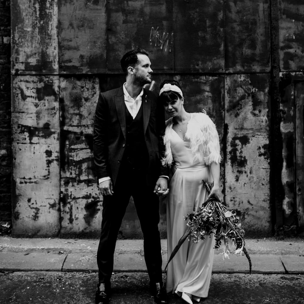 I’ve always tried to walk the line between modern and quirky but still classic. I was always going to have something on my head and I wanted an over the top bouquet. Due to all the restrictions, we had to think small. The day was very relaxed and intimate. After the ceremony, we sent our guests bowling while we ran around the city taking epic shots with the amazing Amy and were back to take part in the last game! We had an amazing dinner and were able to talk and spend time with our guests. It was very special.