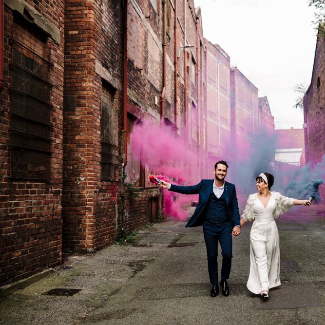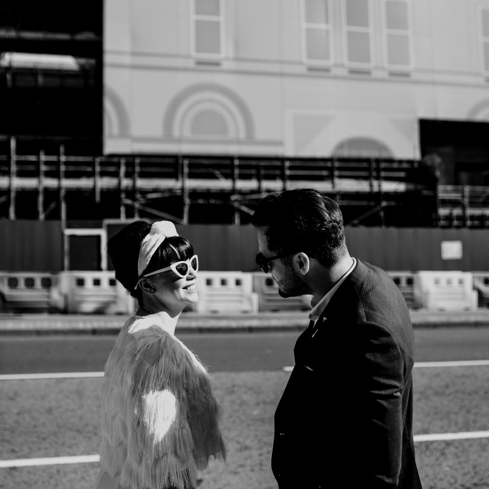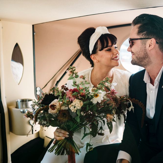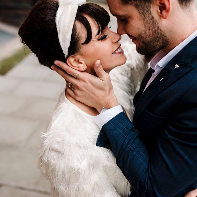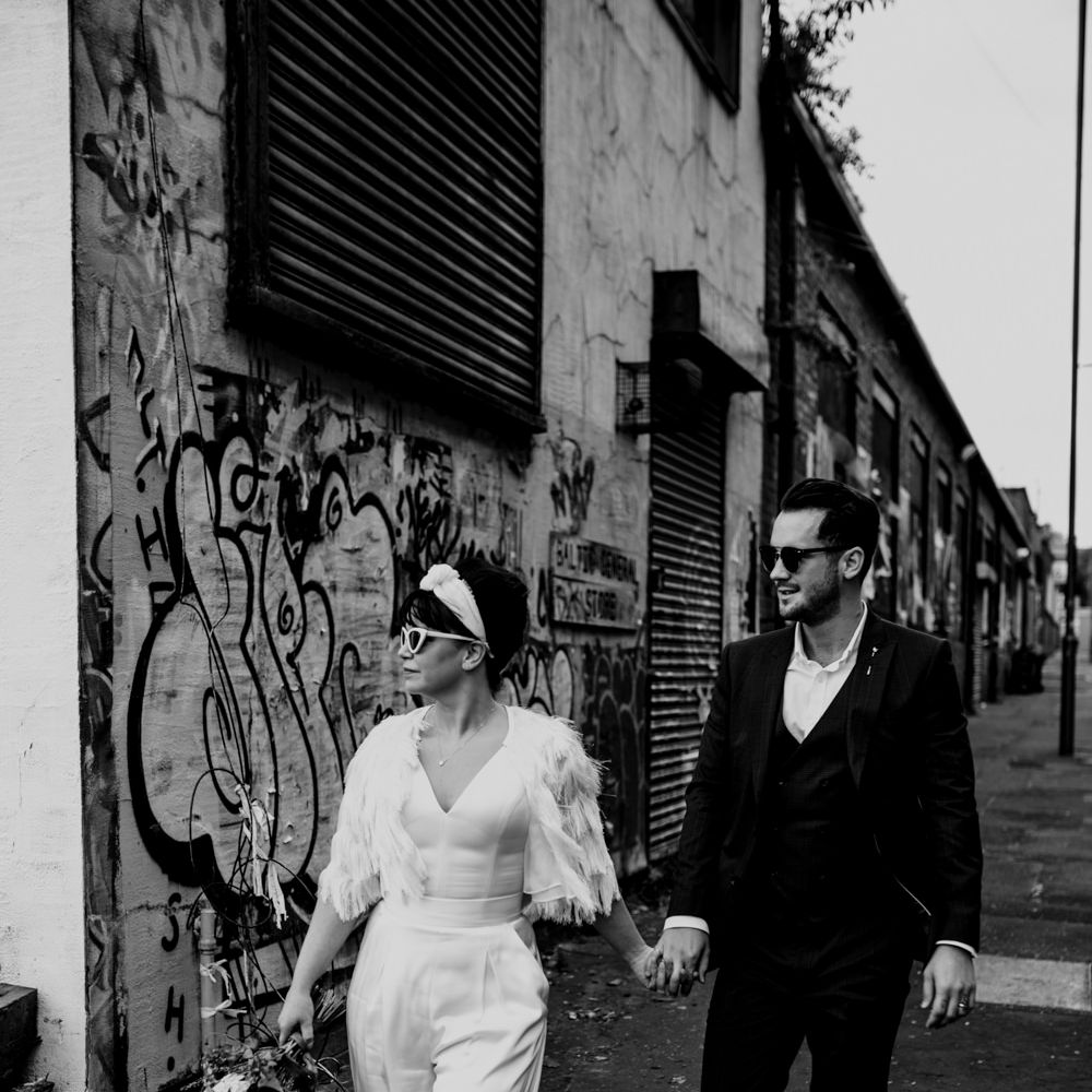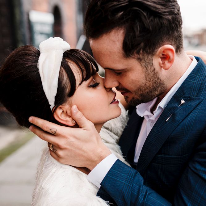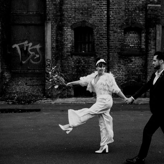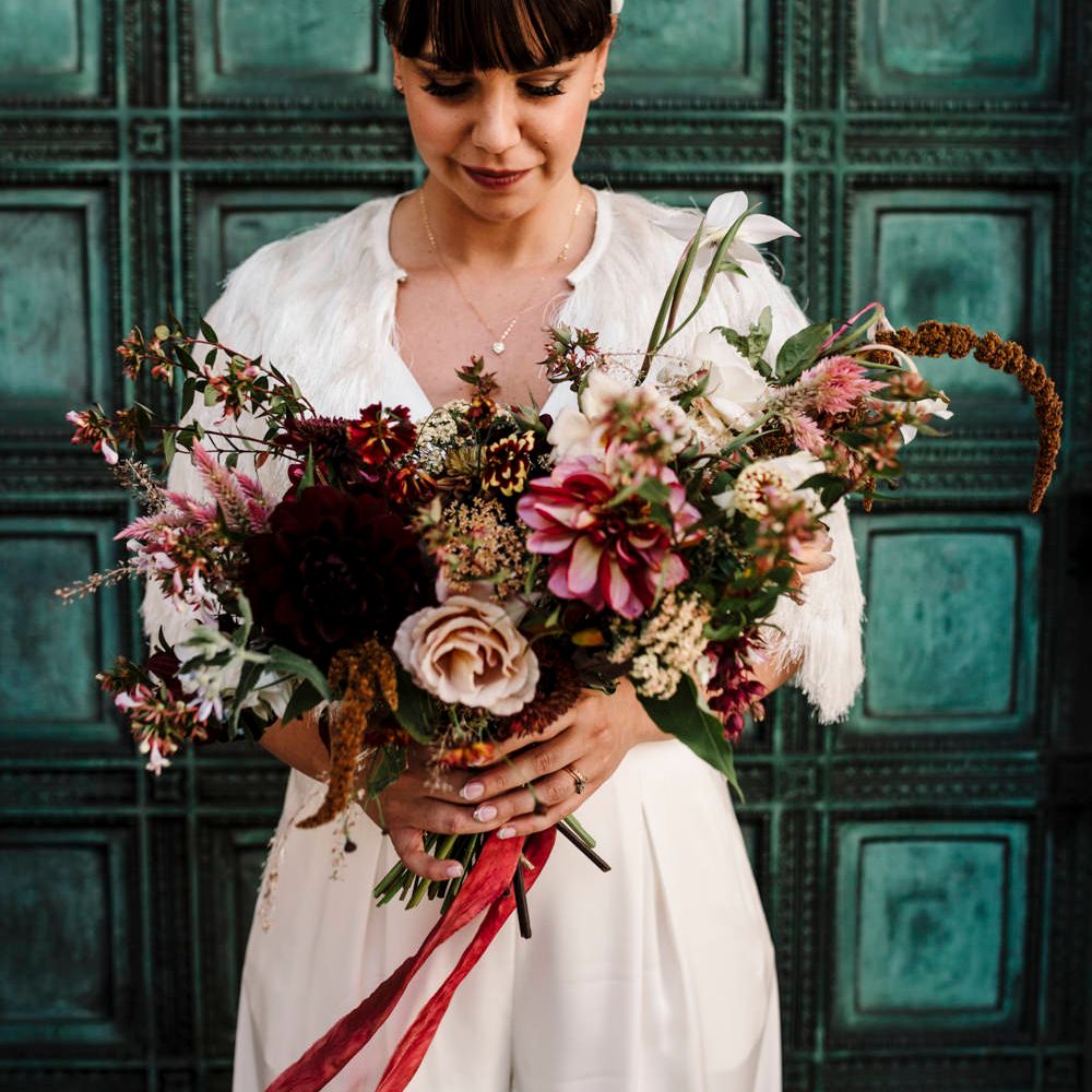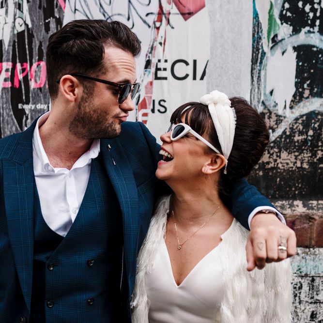I’ve always tried to walk the line between modern and quirky but still classic. I was always going to have something on my head and I wanted an over the top bouquet. Due to all the restrictions, we had to think small. The day was very relaxed and intimate. After the ceremony, we sent our guests bowling while we ran around the city taking epic shots with the amazing Amy and were back to take part in the last game! We had an amazing dinner and were able to talk and spend time with our guests. It was very special.