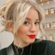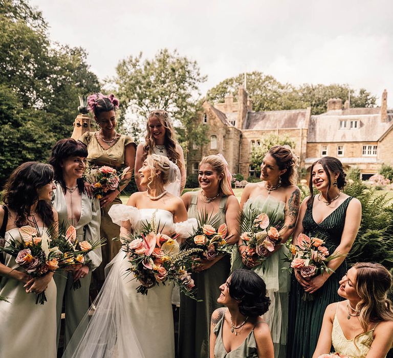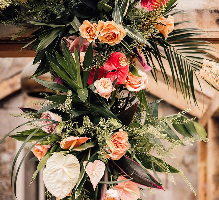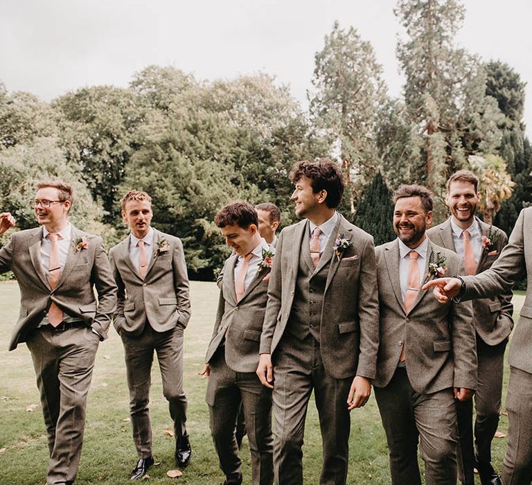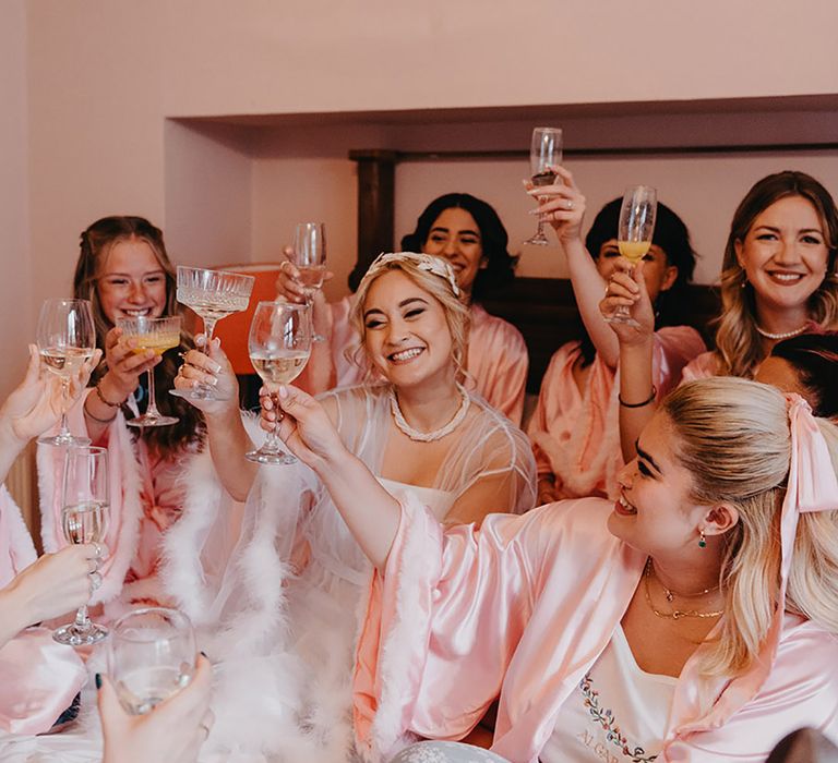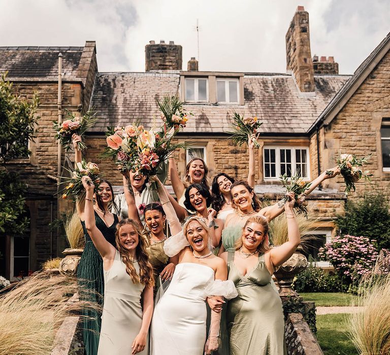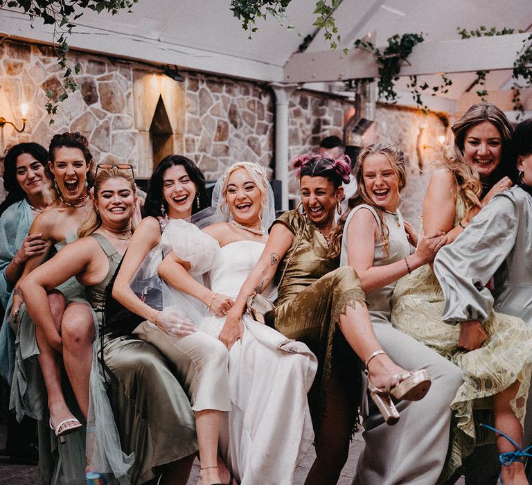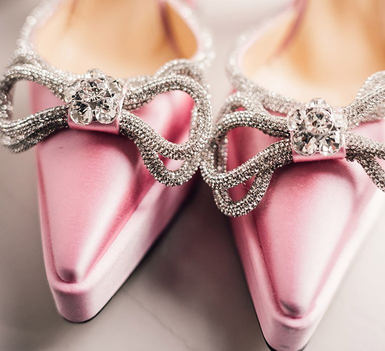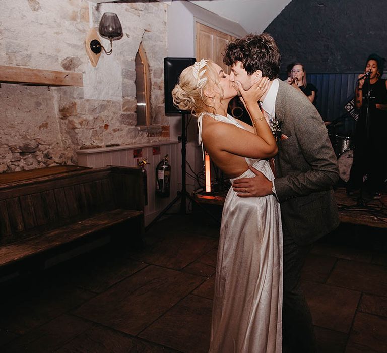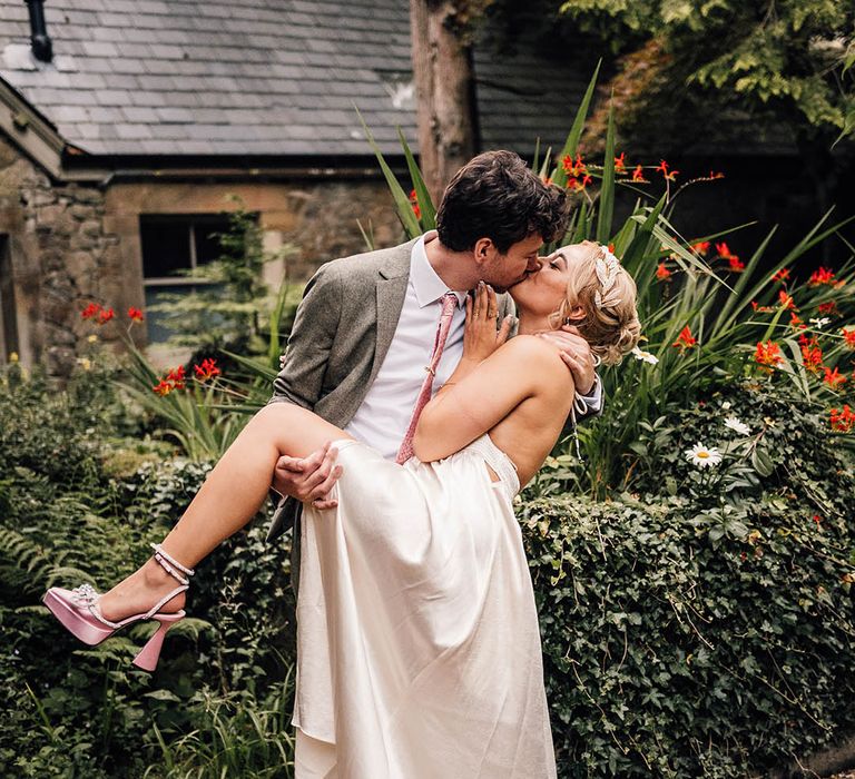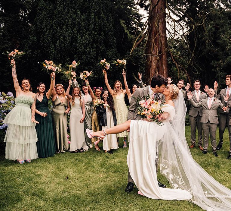 Groom dips bride in pink wedding shoes for a kiss with wedding party cheering in the background