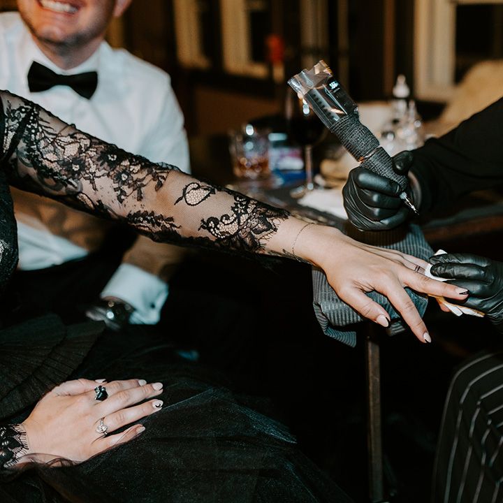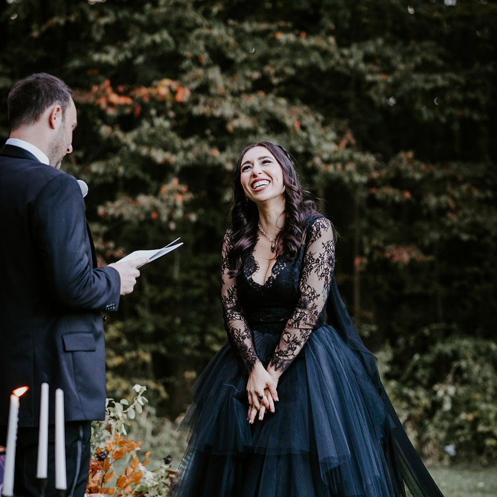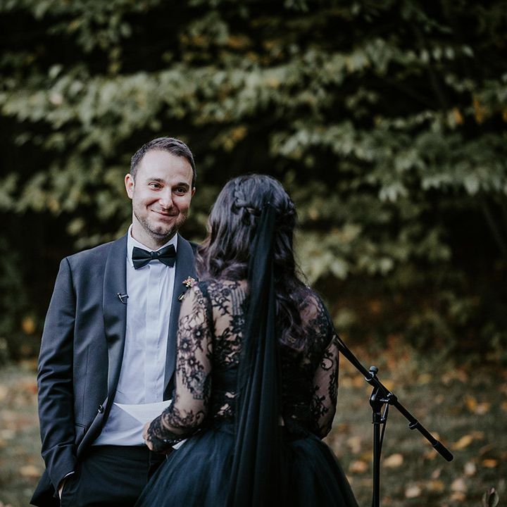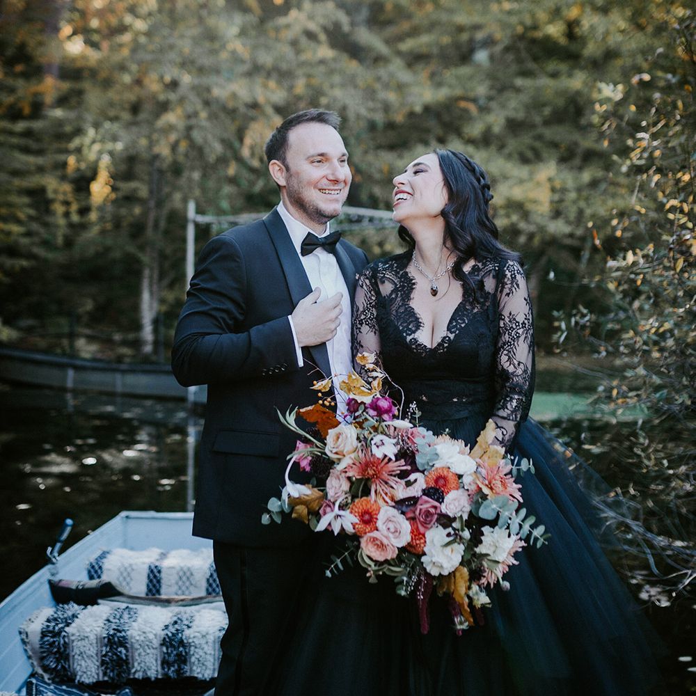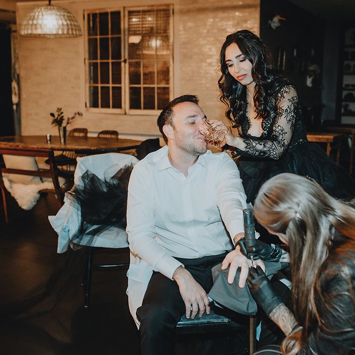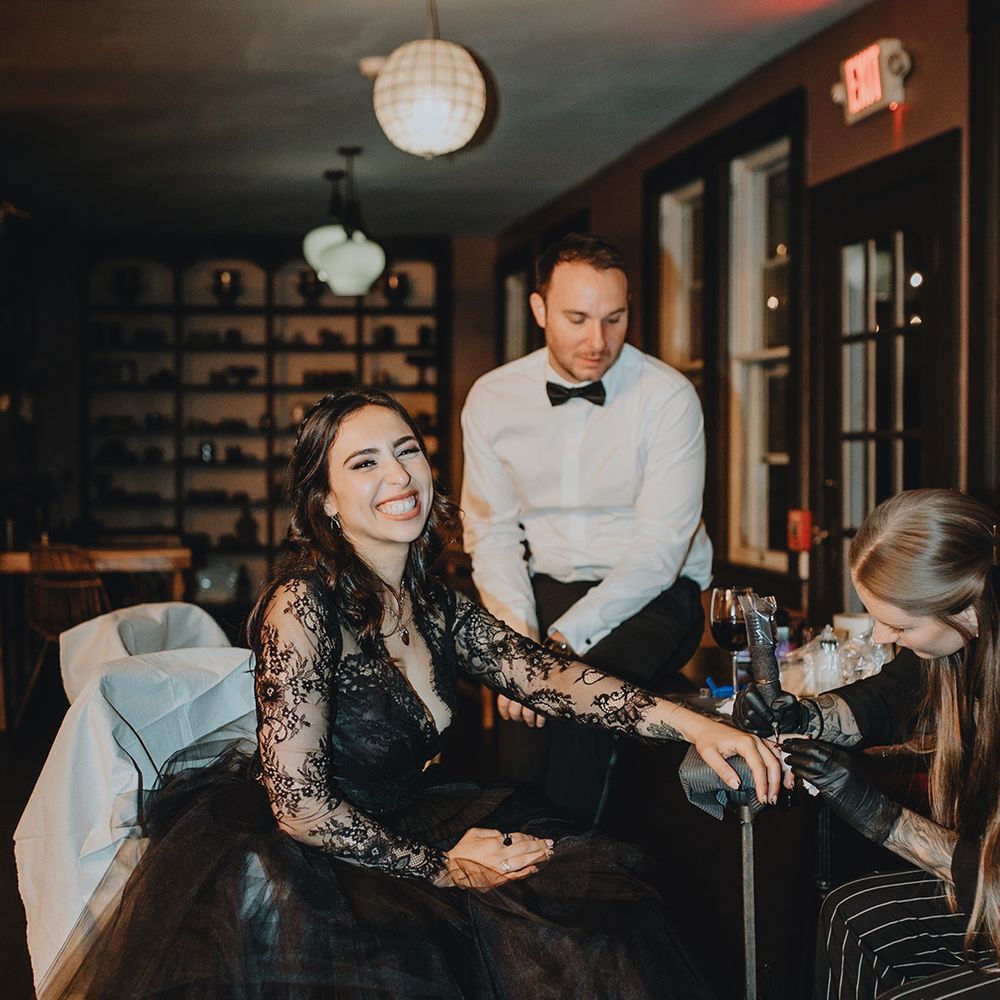 This fall wedding at Foxfire Mountain House transcended the ordinary, embracing the bride's witchy charm and love for Halloween. With her black wedding dress, their unconventional ring tattoos, and the warmth of the foliage at Foxfire Mountain House, everything was absolutely perfect. As a wedding photographer, capturing this enchanting love story, a real-life fairytale made of autumnal magic and everlasting commitment, was an absolute joy.