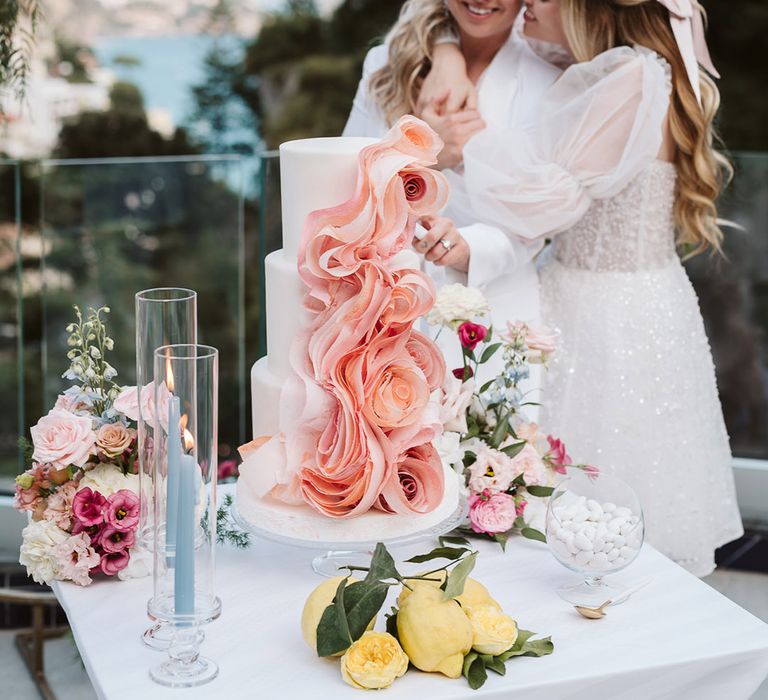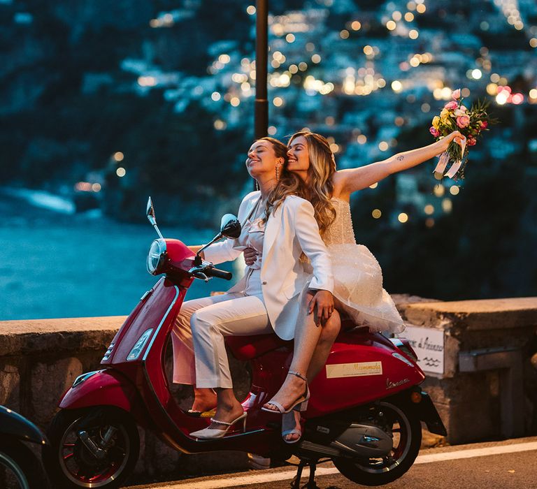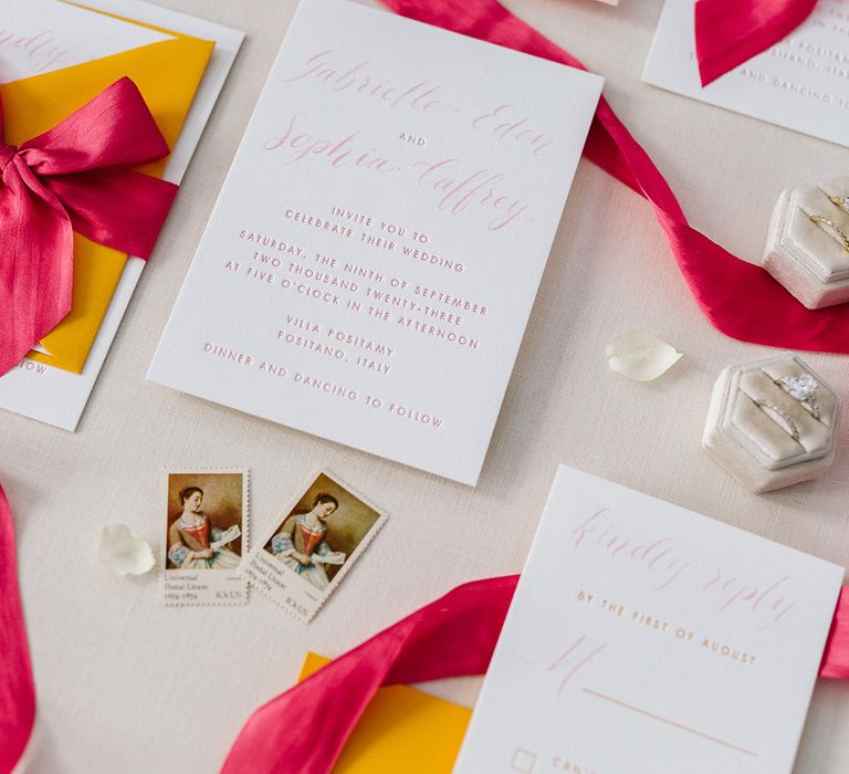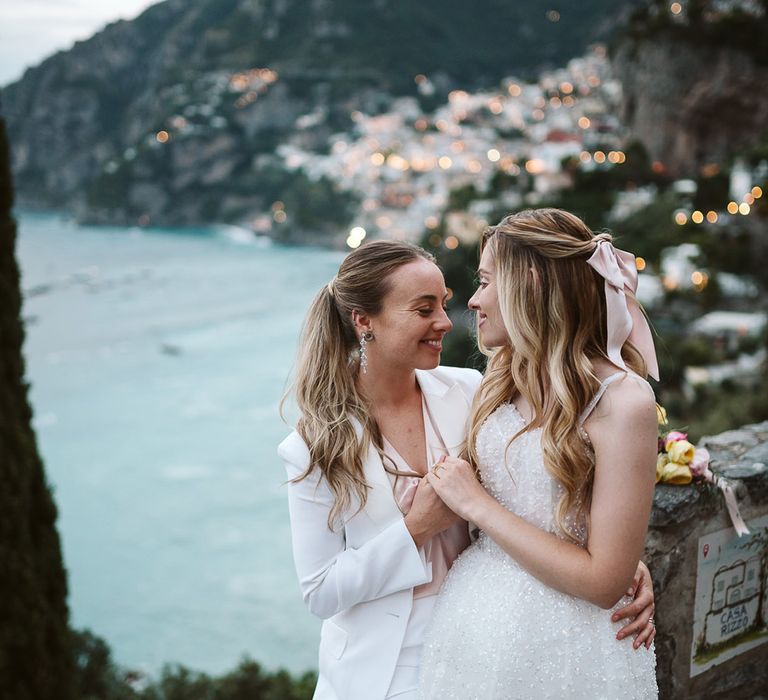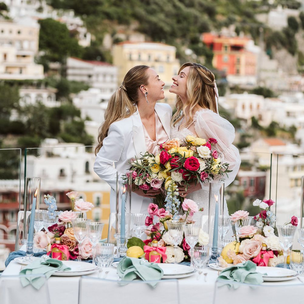 The inspiration was not only the Amalfi Coast itself but an opportunity to celebrate girl power, with a predominantly women-owned business vendor team. Almost all of our incredible vendors, from planning/design to stationery, to photography, to floral, to cake designer, to all dress/suit designers, to bridal accessories, to beauty, to the venue were women-owned businesses…