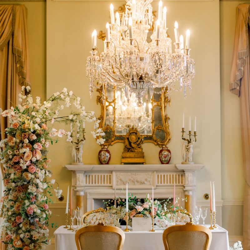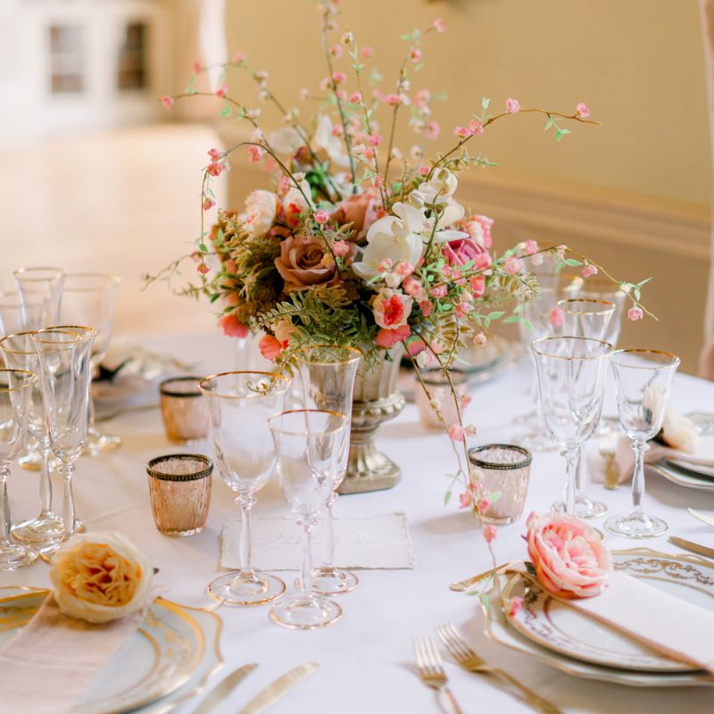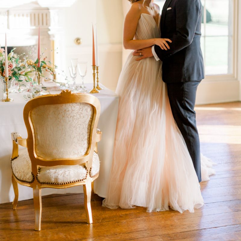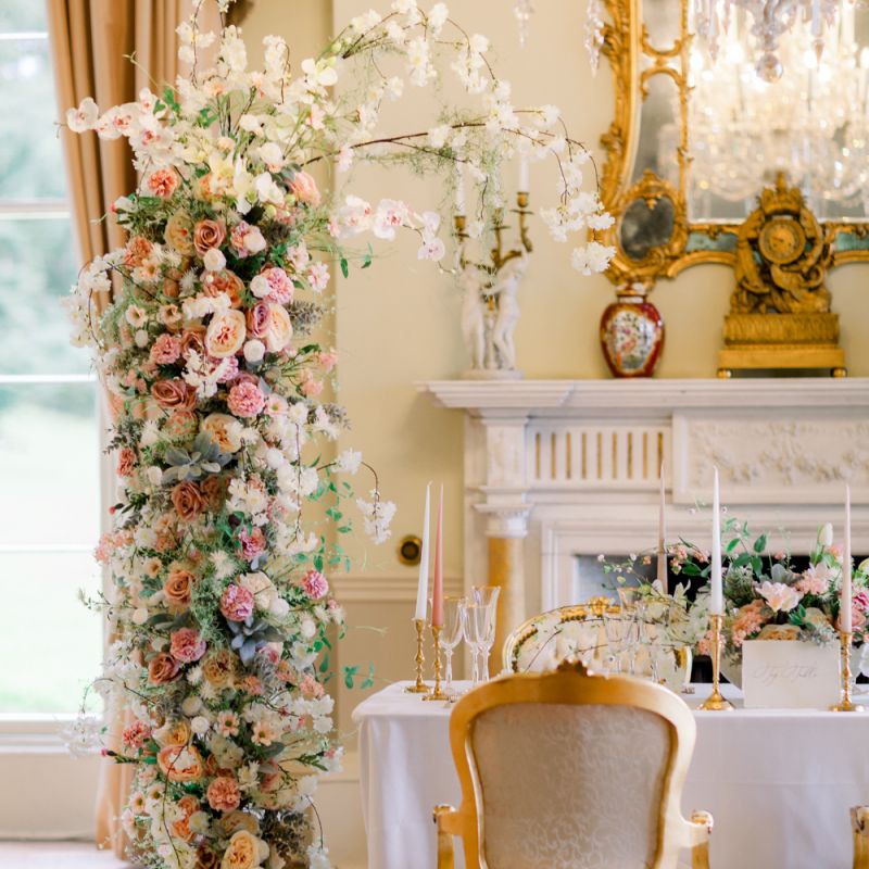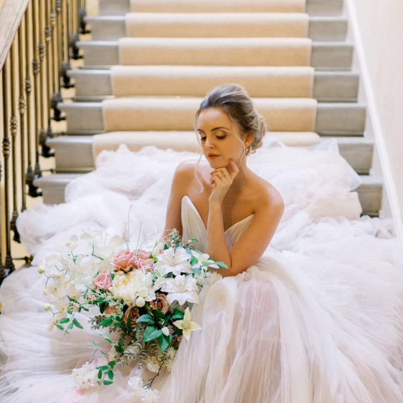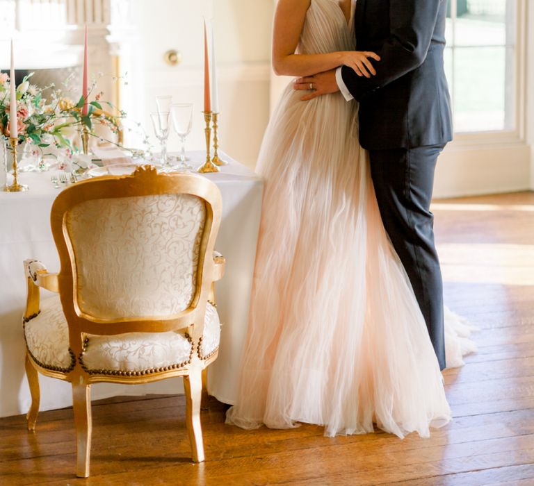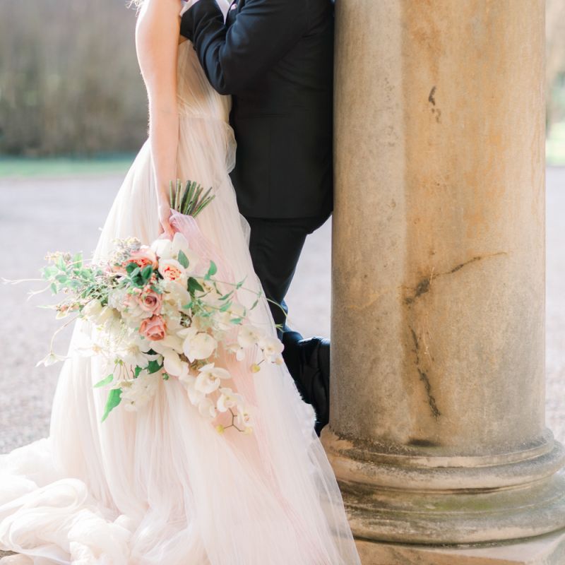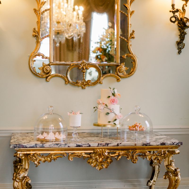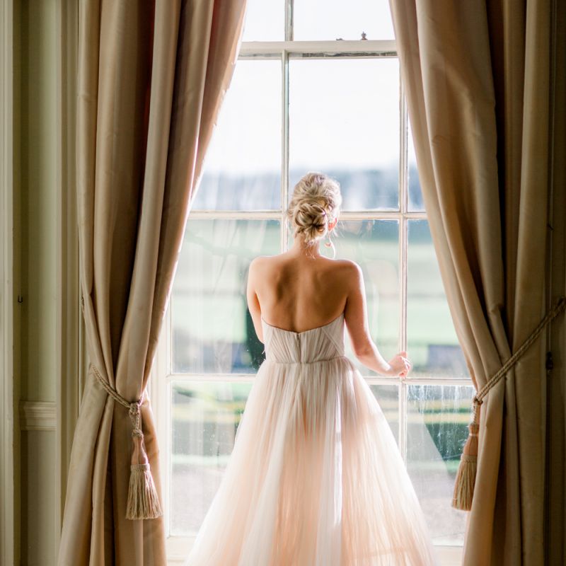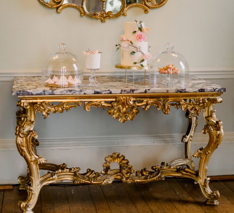 Prestwold Hall, a neoclassical style country house set in the heart of Leicestershire that offers exclusive hire weddings. Inspired by the beautiful interior spaces, a palette of peach, gold, pink and cream ran through the styling, flat lays, flowers, cakes and table settings to create a cohesive, fine art styled wedding shoot. In addition to the peach tones and luxurious styling, a beautiful
