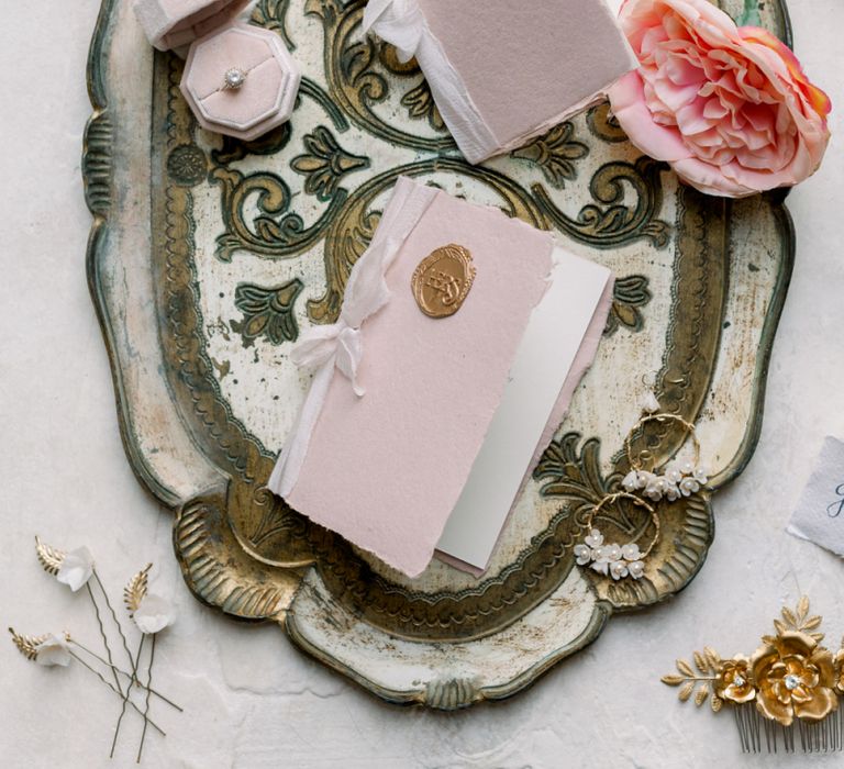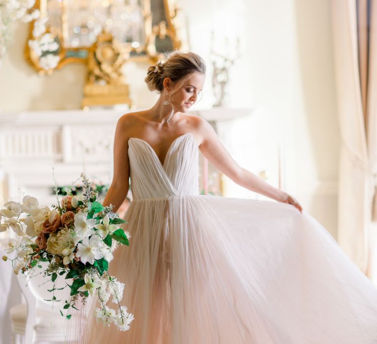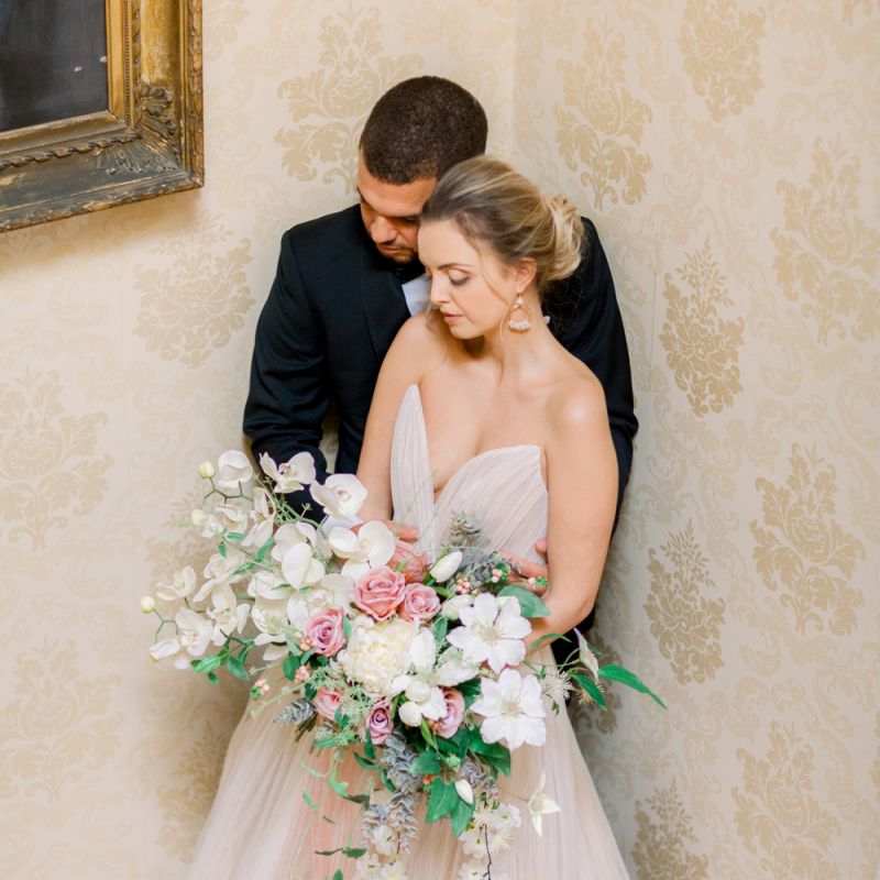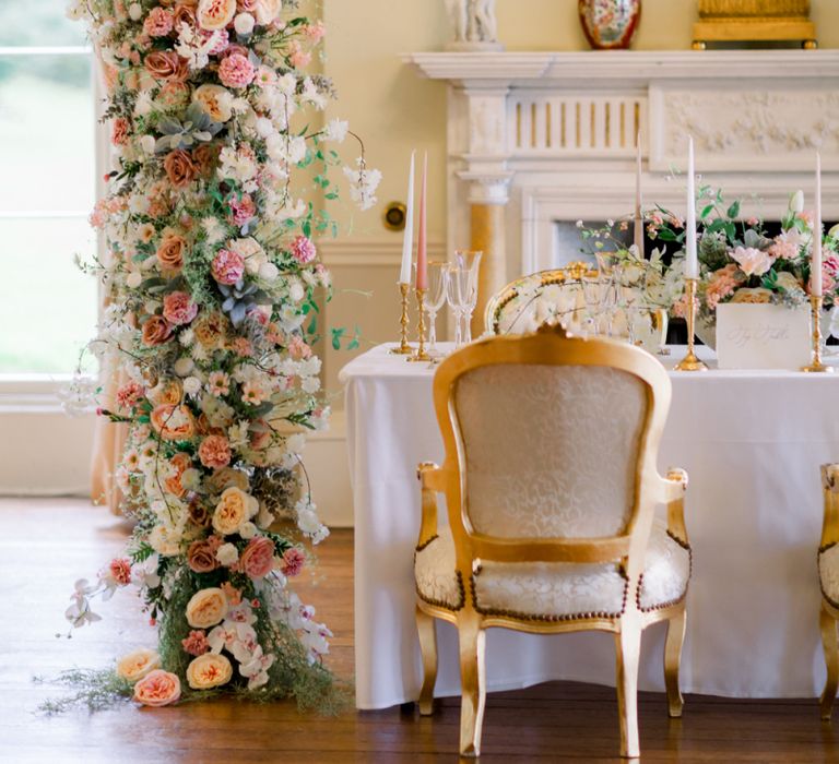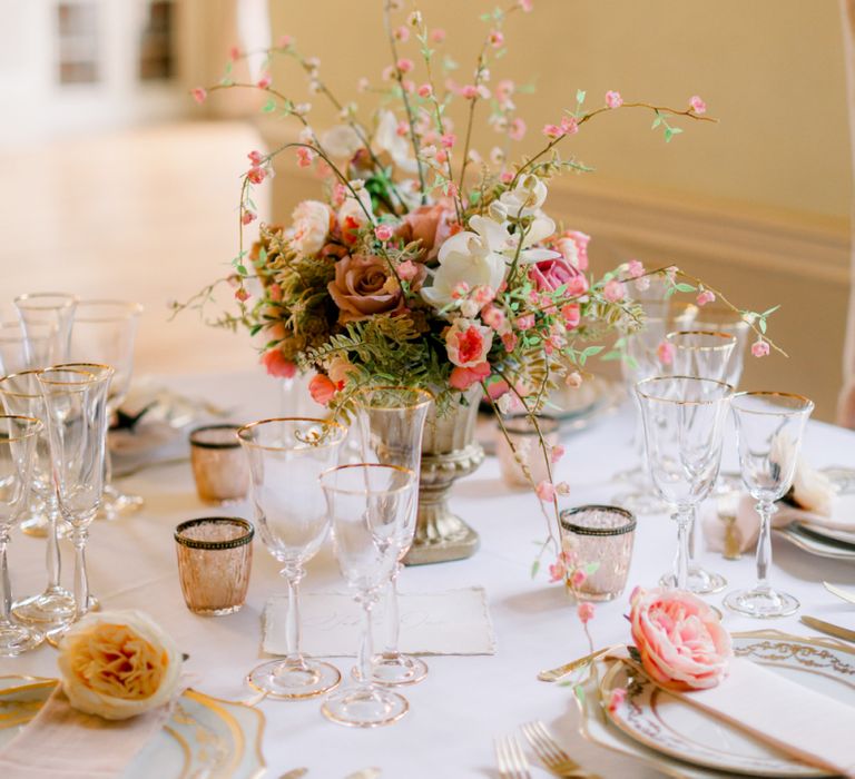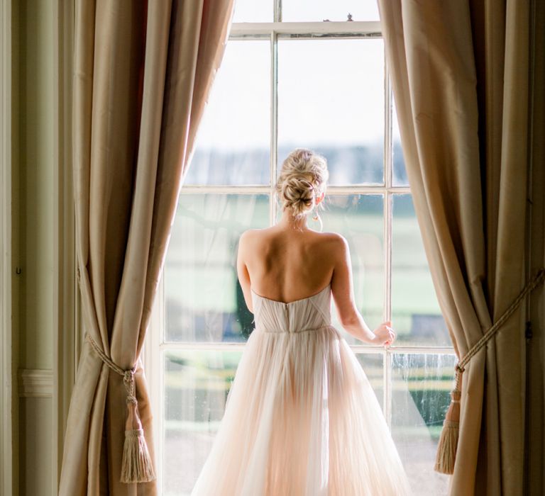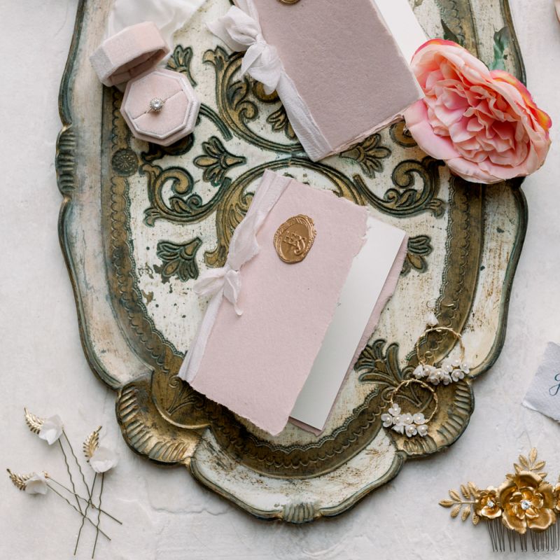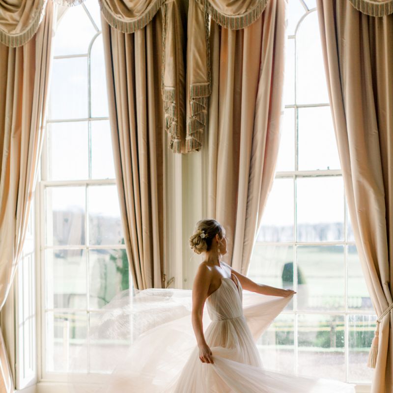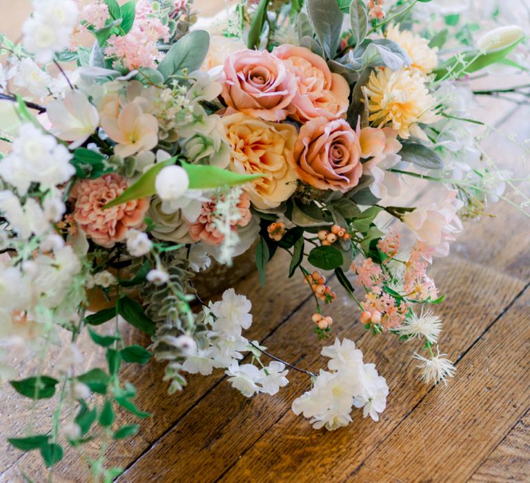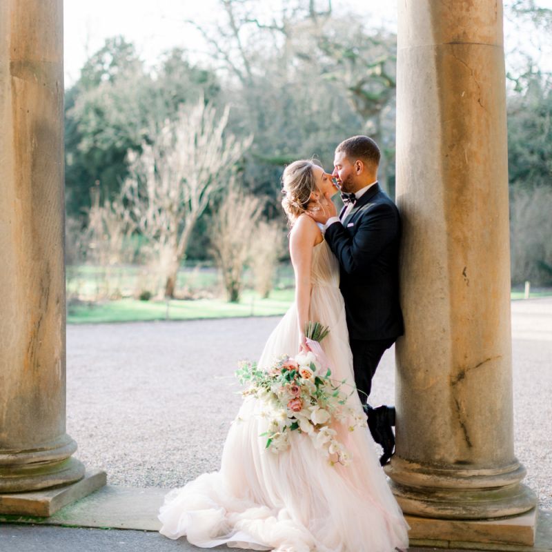 Prestwold Hall, a neoclassical style country house set in the heart of Leicestershire that offers exclusive hire weddings. Inspired by the beautiful interior spaces, a palette of peach, gold, pink and cream ran through the styling, flat lays, flowers, cakes and table settings to create a cohesive, fine art styled wedding shoot. In addition to the peach tones and luxurious styling, a beautiful