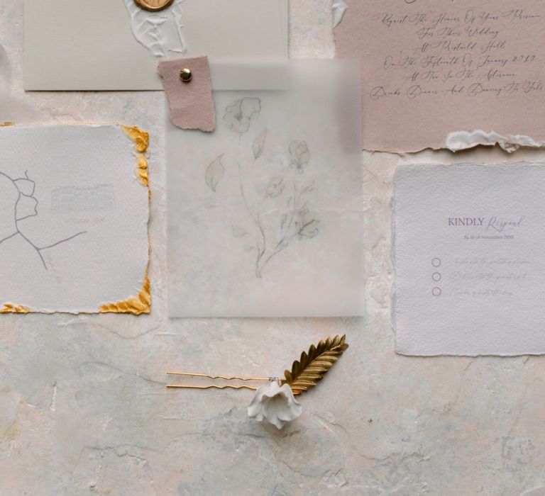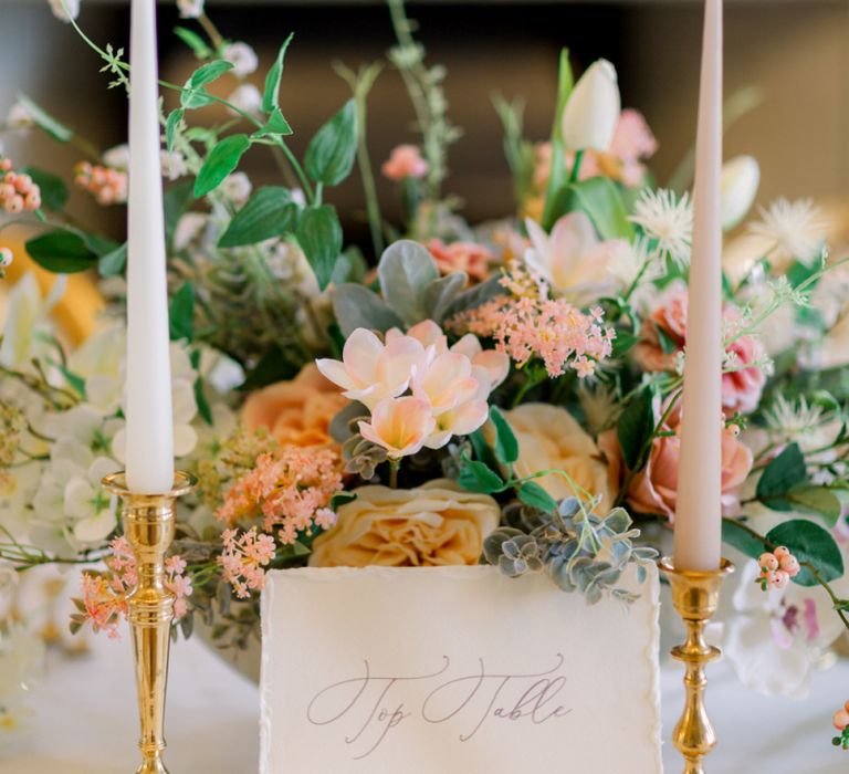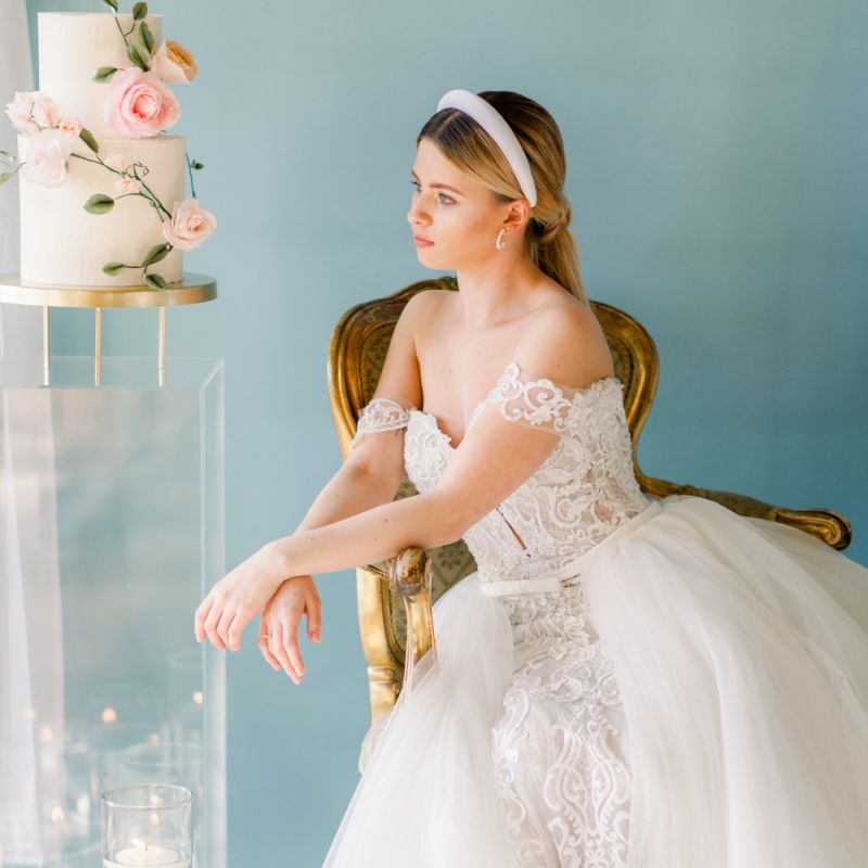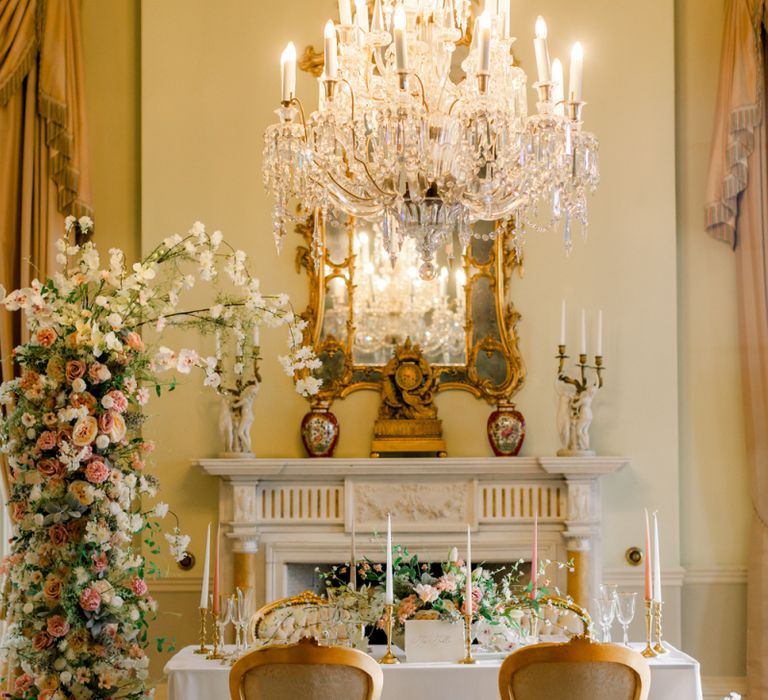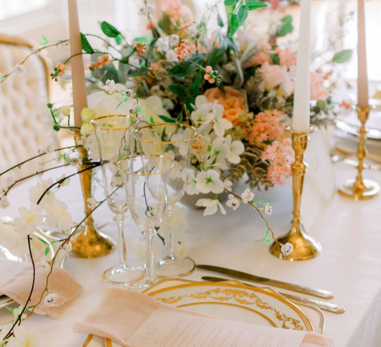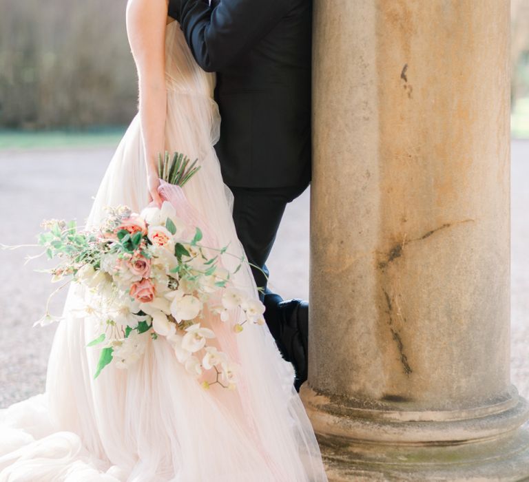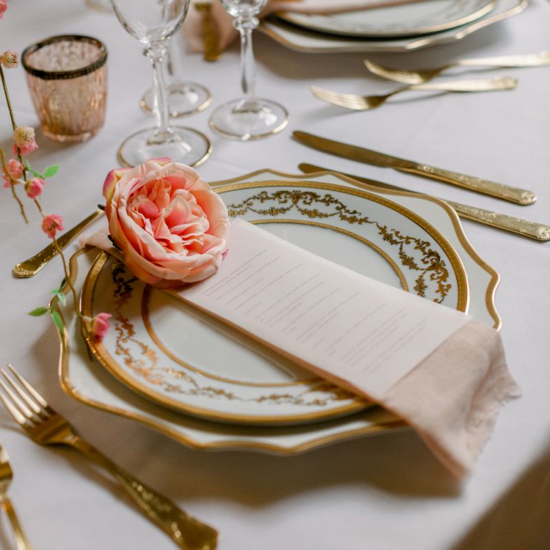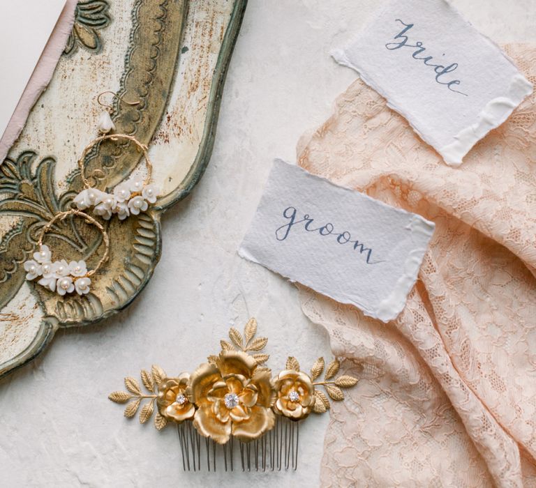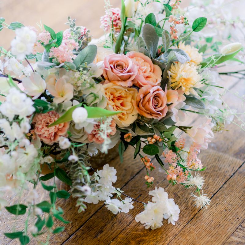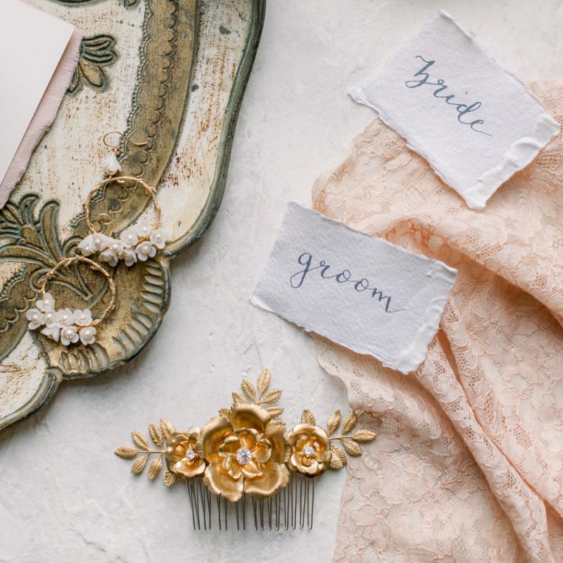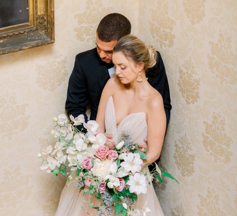Prestwold Hall, a neoclassical style country house set in the heart of Leicestershire that offers exclusive hire weddings. Inspired by the beautiful interior spaces, a palette of peach, gold, pink and cream ran through the styling, flat lays, flowers, cakes and table settings to create a cohesive, fine art styled wedding shoot. In addition to the peach tones and luxurious styling, a beautiful