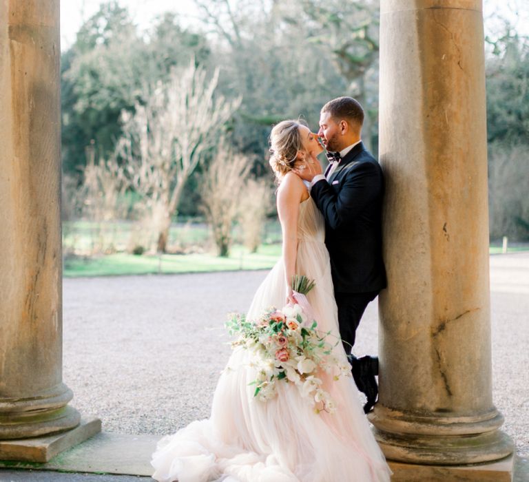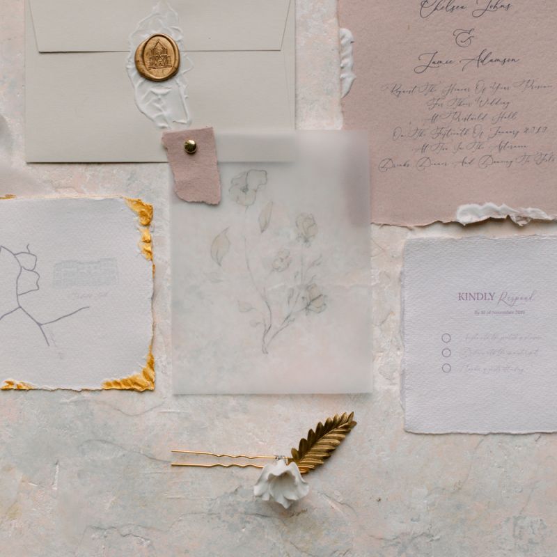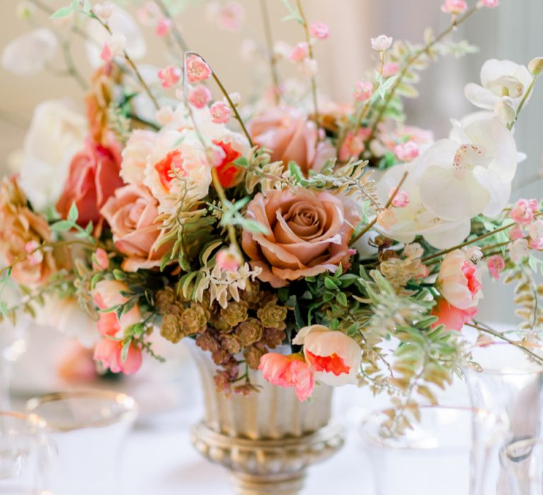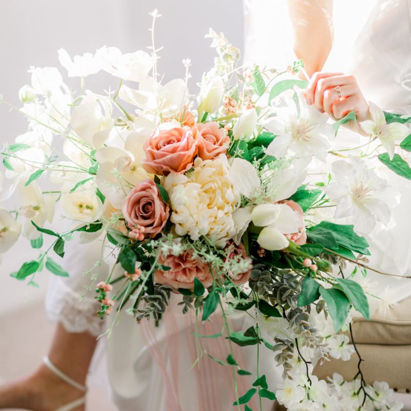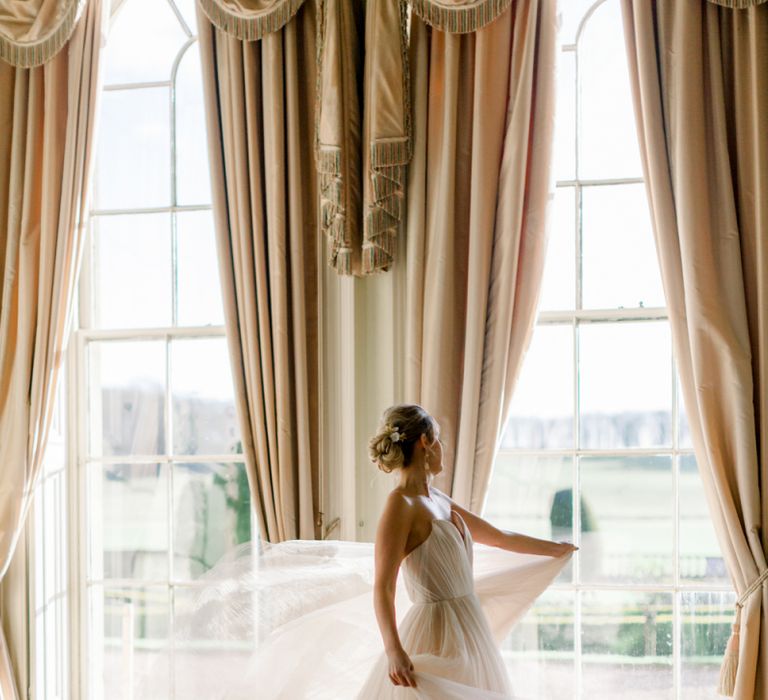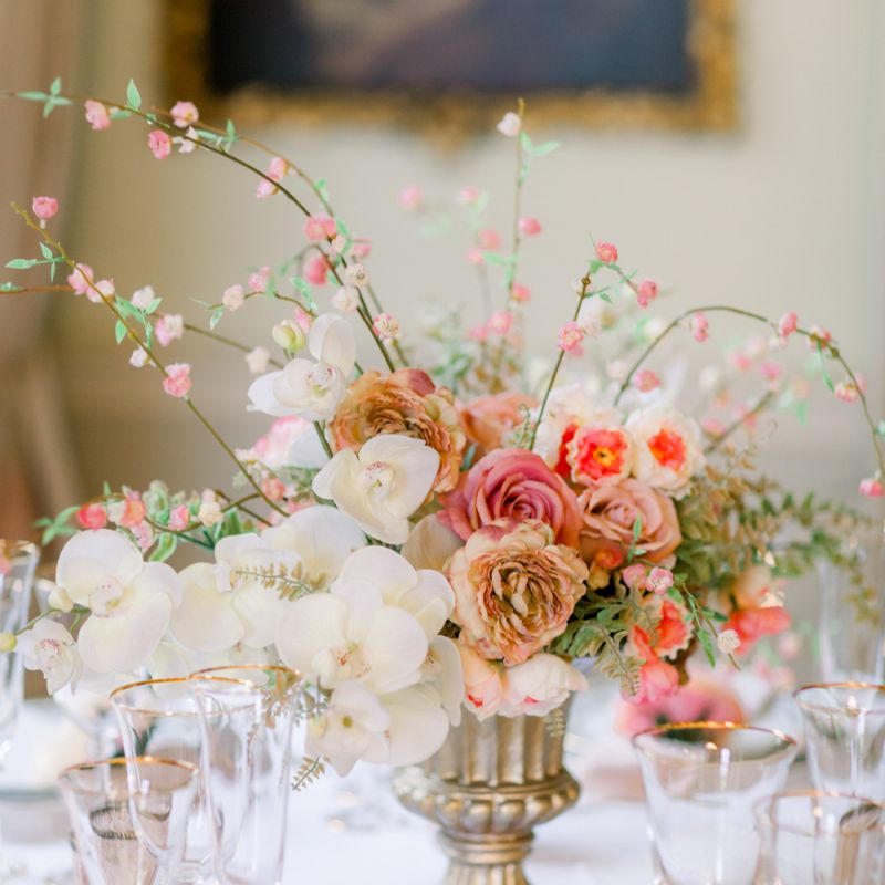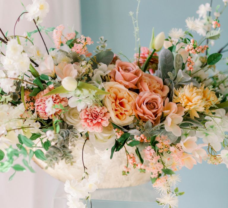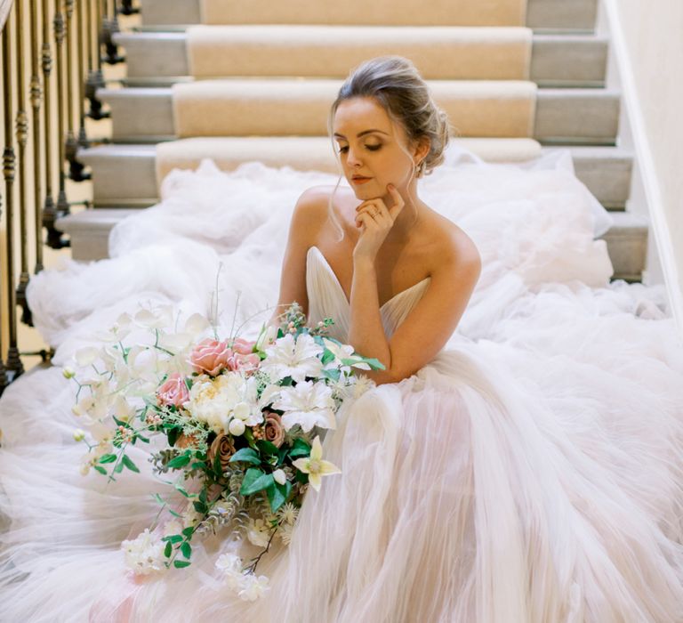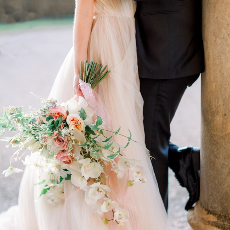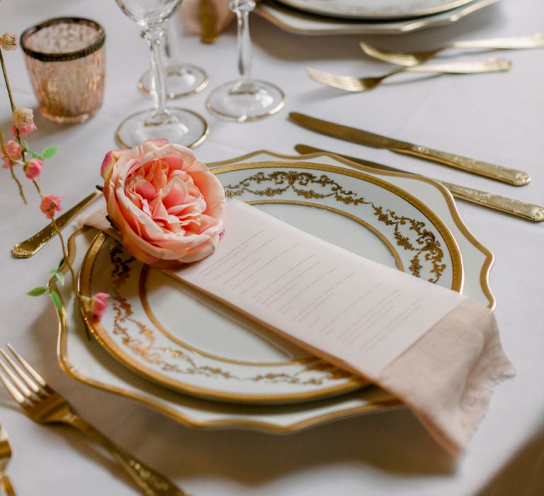 Prestwold Hall, a neoclassical style country house set in the heart of Leicestershire that offers exclusive hire weddings. Inspired by the beautiful interior spaces, a palette of peach, gold, pink and cream ran through the styling, flat lays, flowers, cakes and table settings to create a cohesive, fine art styled wedding shoot. In addition to the peach tones and luxurious styling, a beautiful