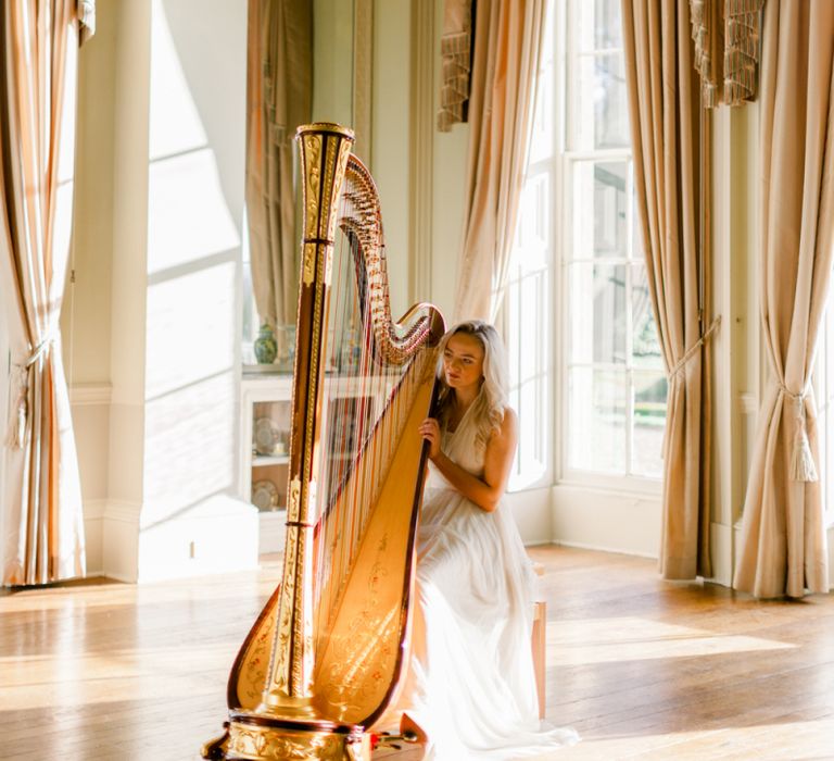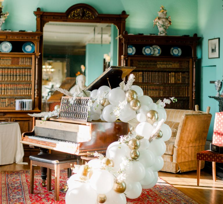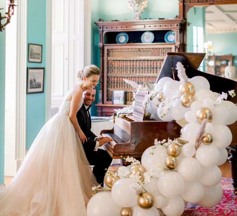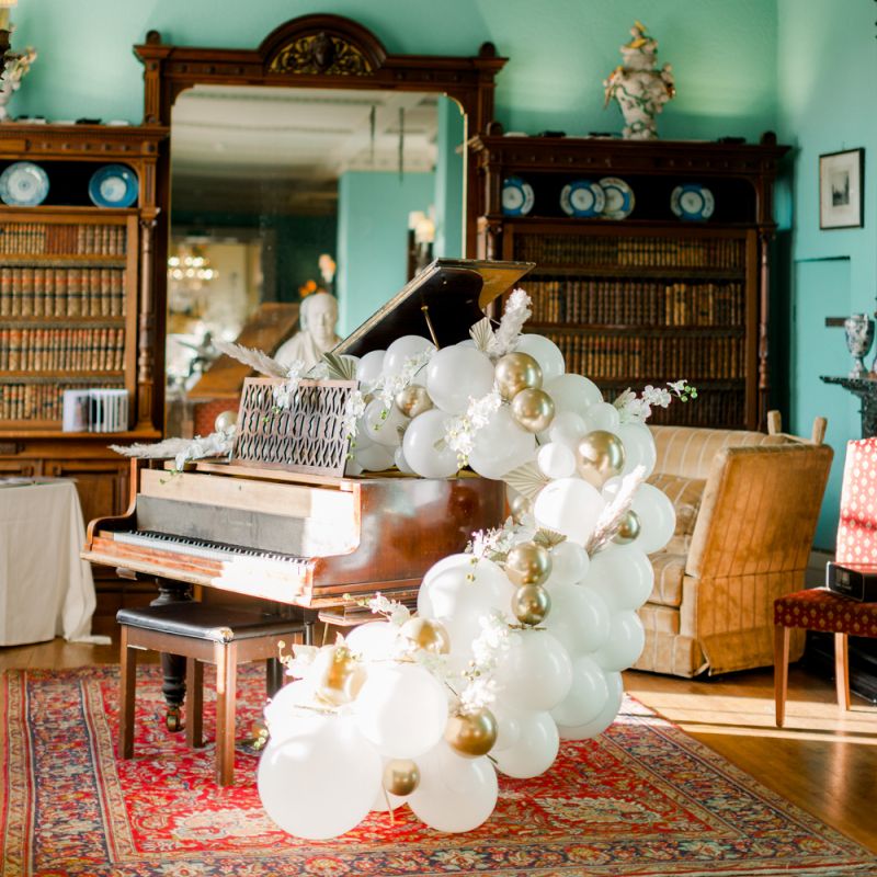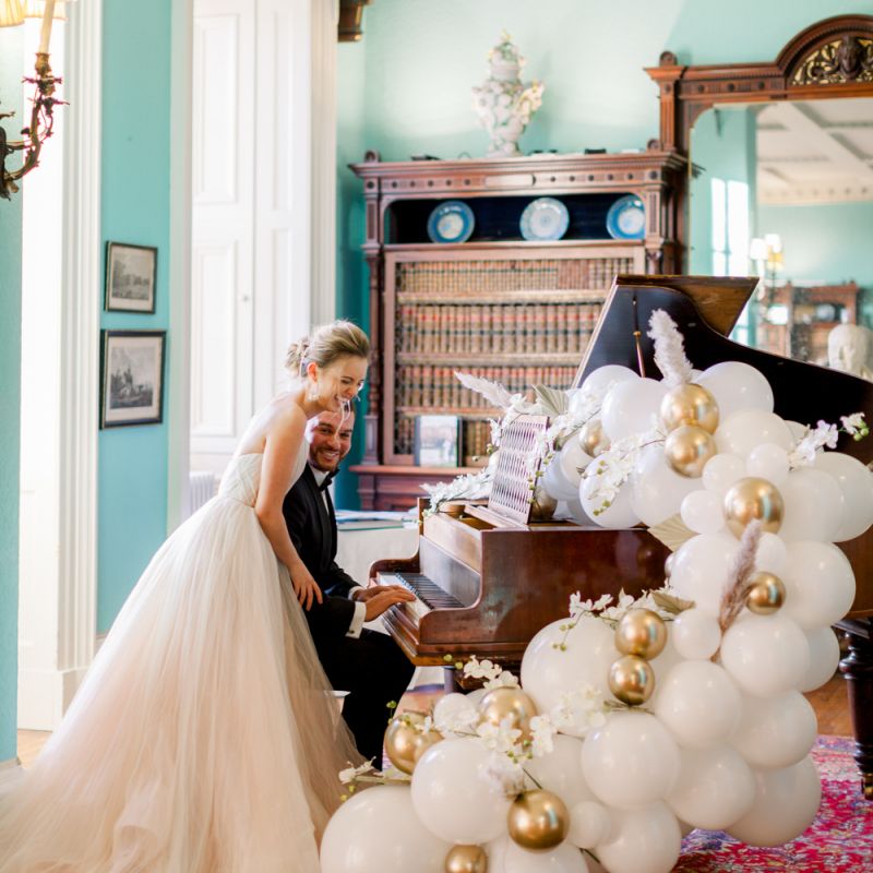 balloon arch of gold and white was created to surround the grand piano and create an incredible focal point to that part of the dining room. Two dresses were used on the shoot, one peach ethereal and floaty by