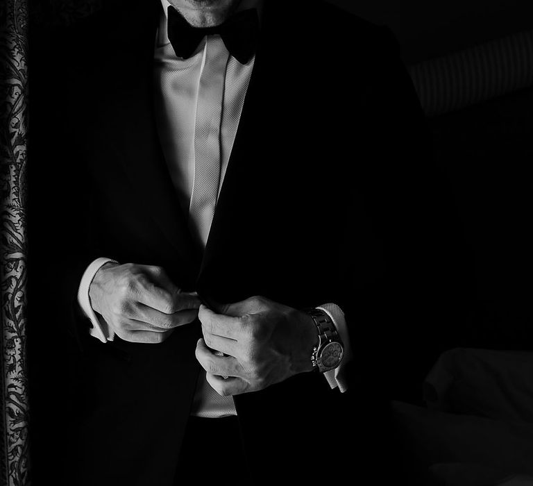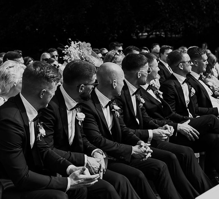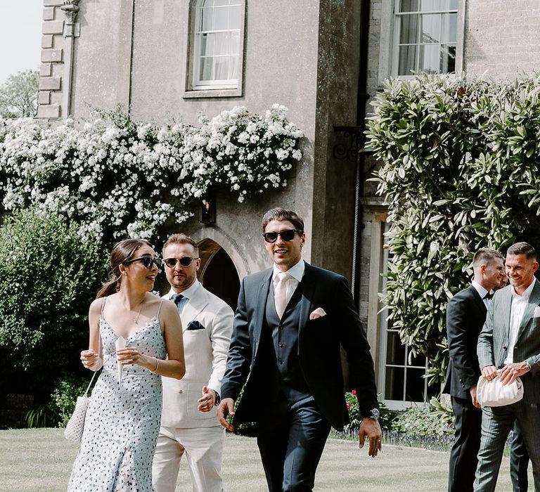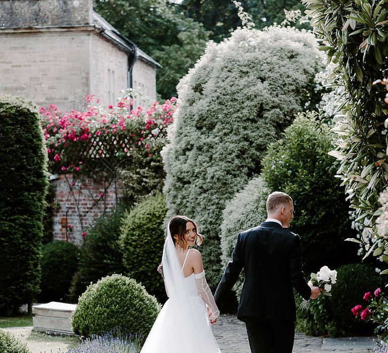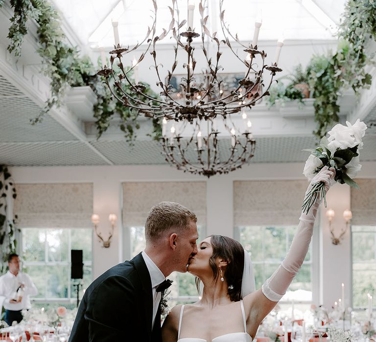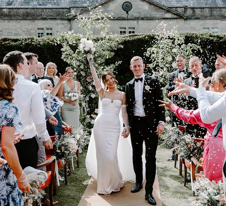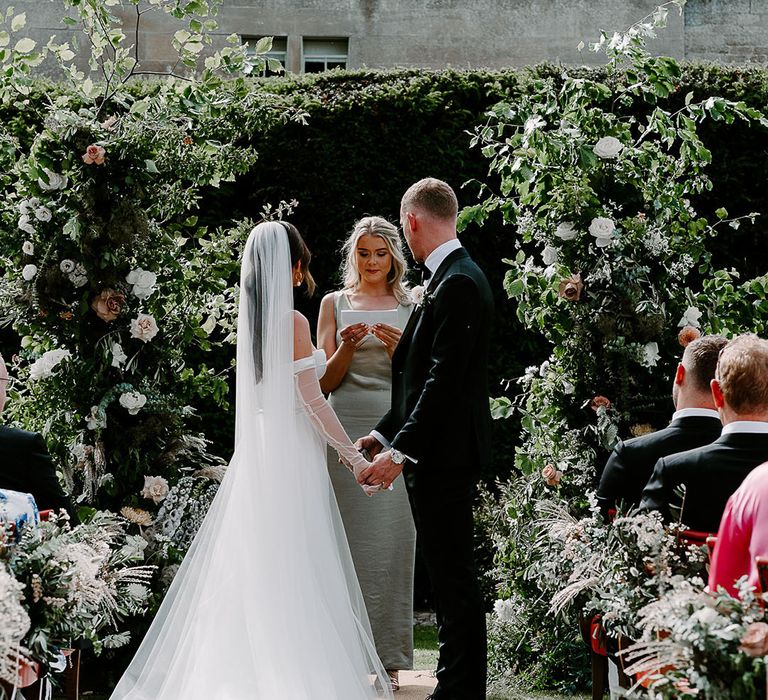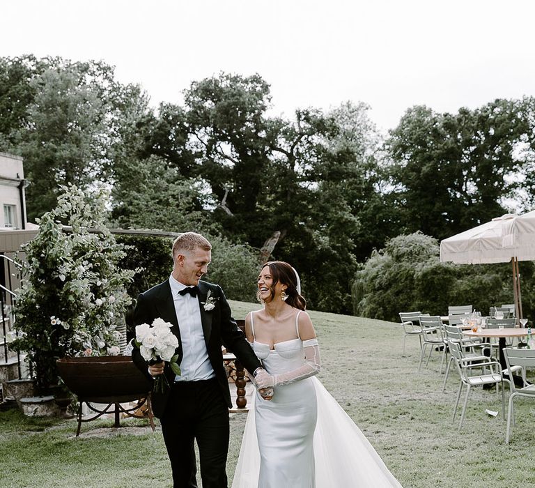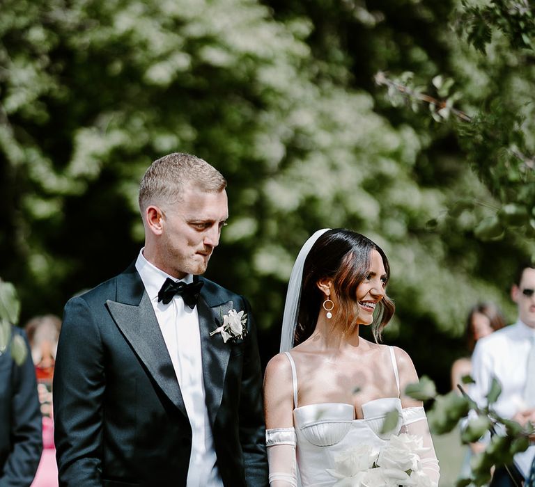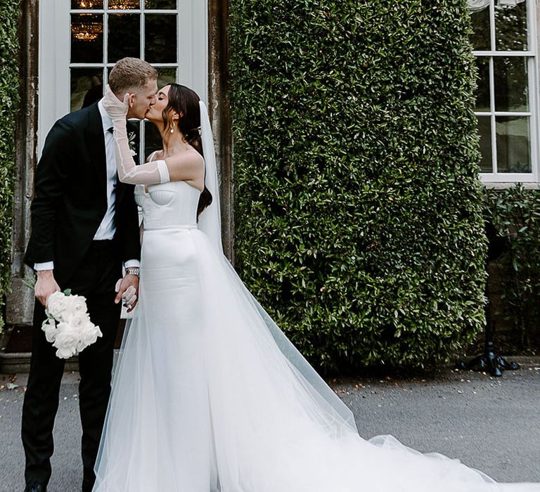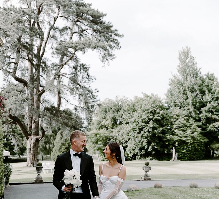 The backdrop of Rosie & George’s wedding was Babington House, a Grade II-listed manor built in 1705. Surrounded by 18 acres of English countryside in the heart of Somerset, the venue is beautiful. With exclusive use of the house and the grounds, the relaxed vibe Rosie & George wanted was easily achieved. Rosie’s bridal look took everyone's breath away when she appeared from Babington House wearing an Aleena Lena Monstera Gown with an addition of an overskirt, veil and iconic gloves. Rosie held a bouquet of long-stemmed white roses to add to the elegant vibe. The styling of the whole day was a black and white modern minimalist theme and it just screams editorial.
