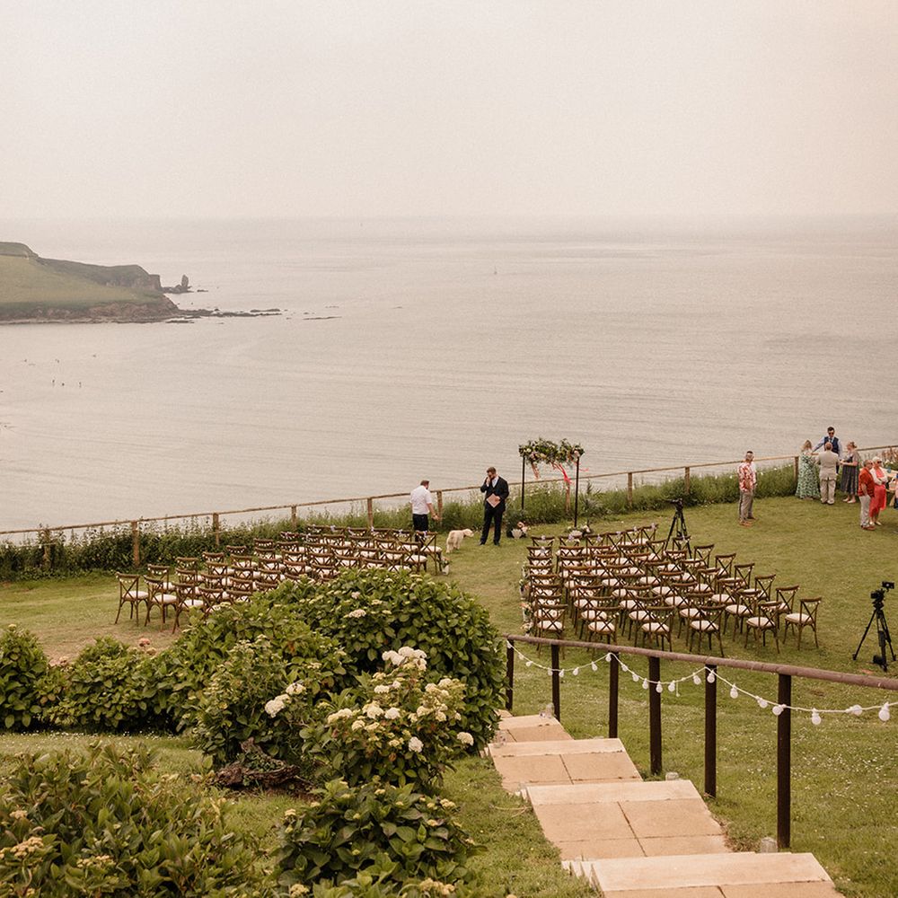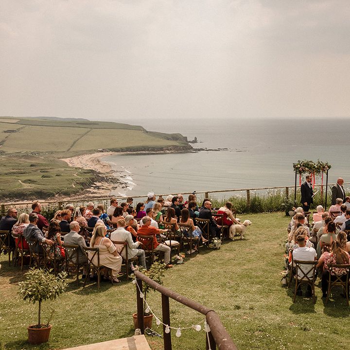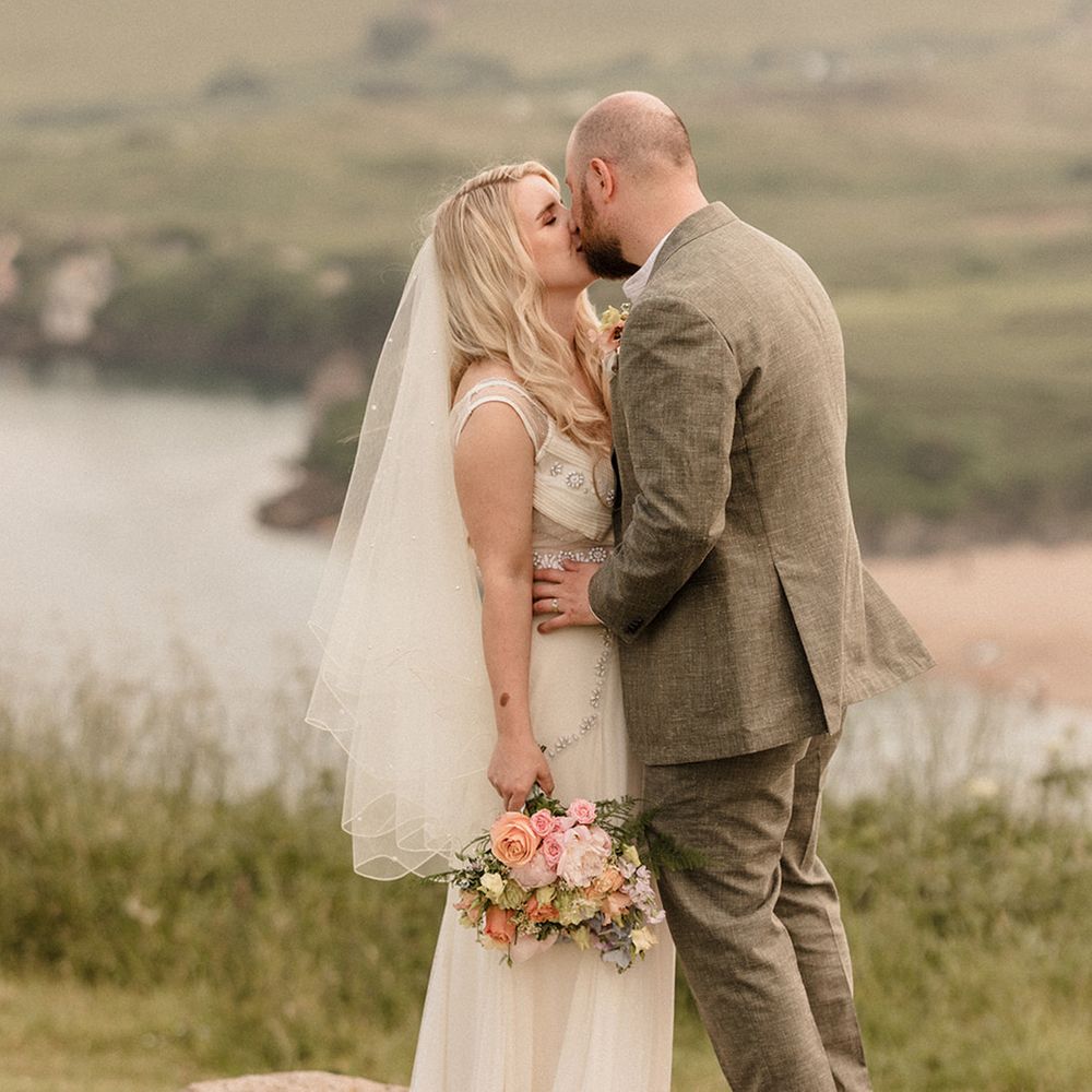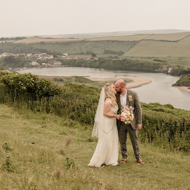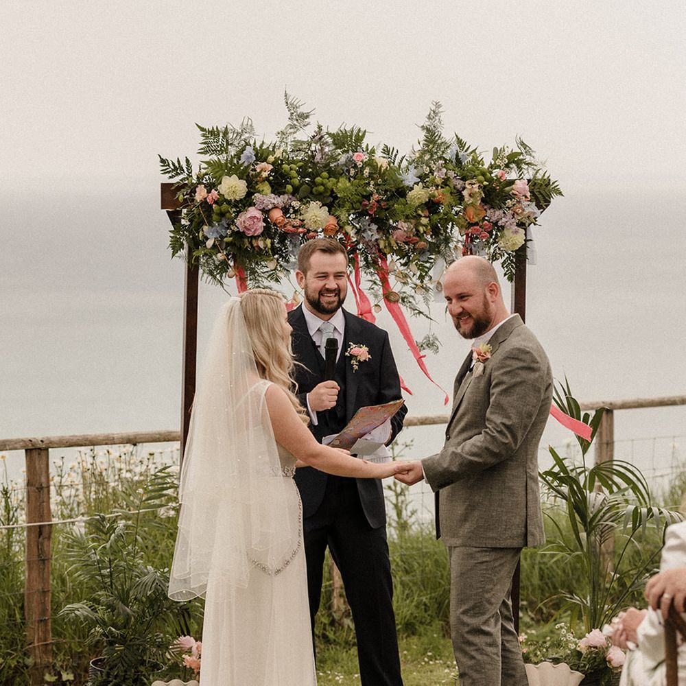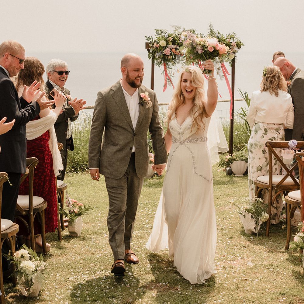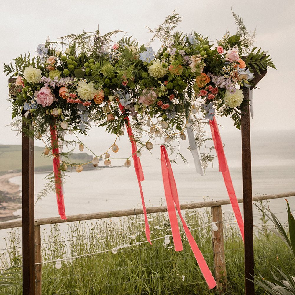 This laid-back clifftop wedding blends pastel palettes, marbled details, and personal touches. From shell garlands to a biscuit-loving dog ring bearer. A must-read for coastal wedding inspiration!