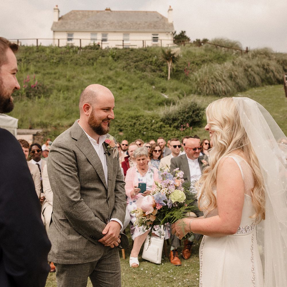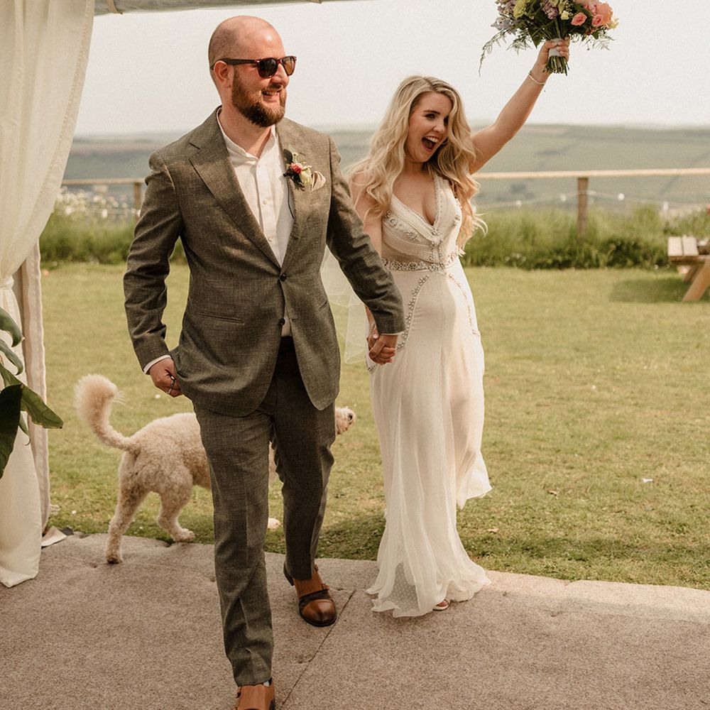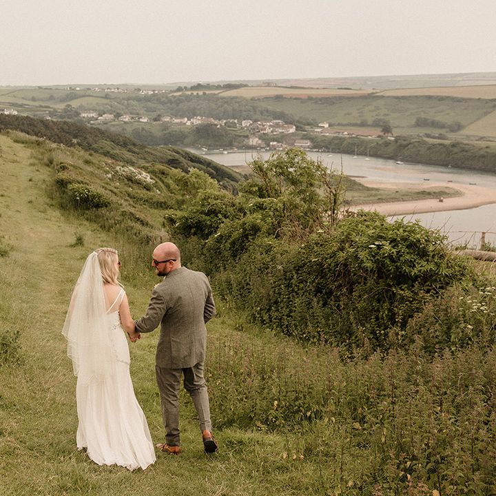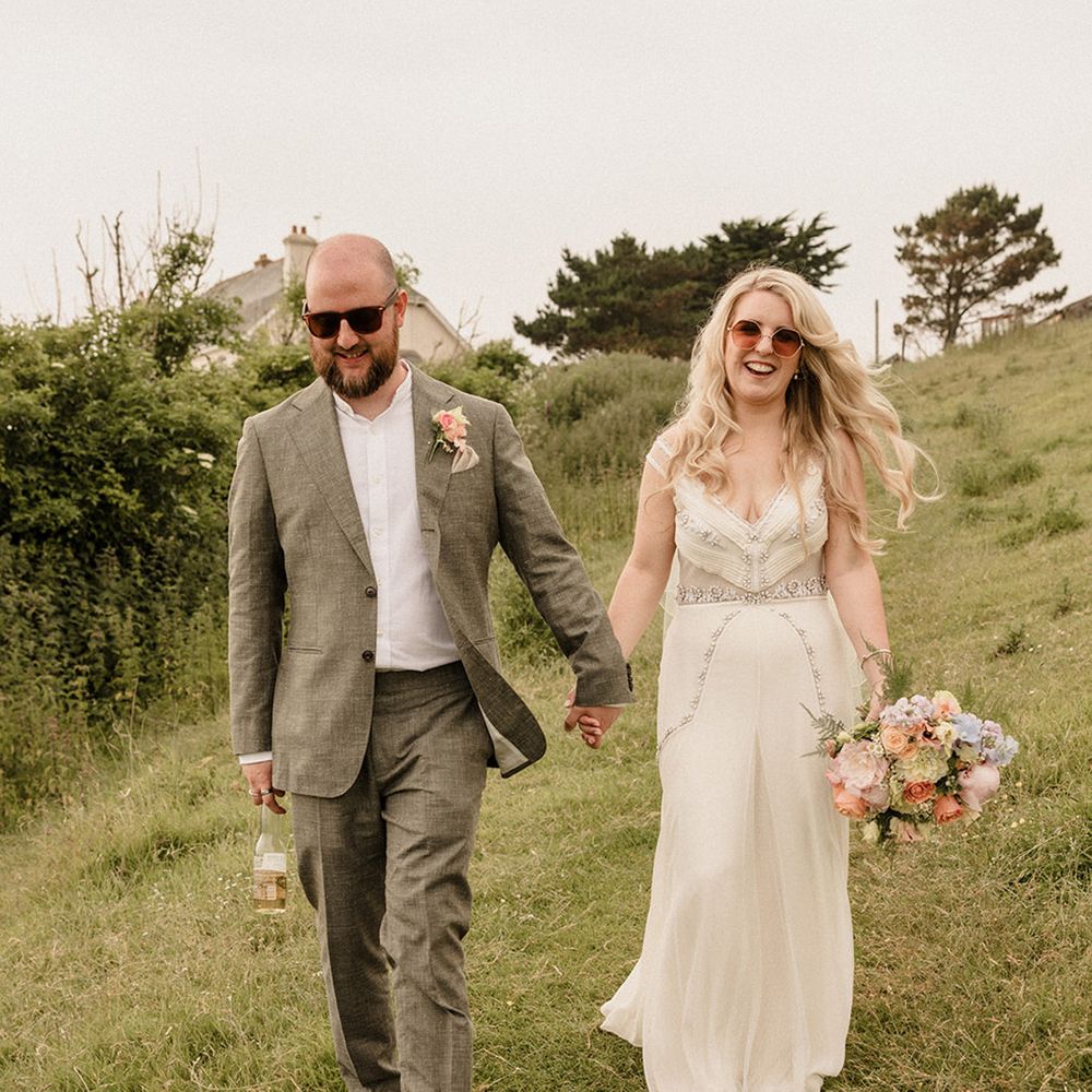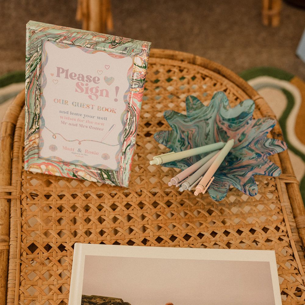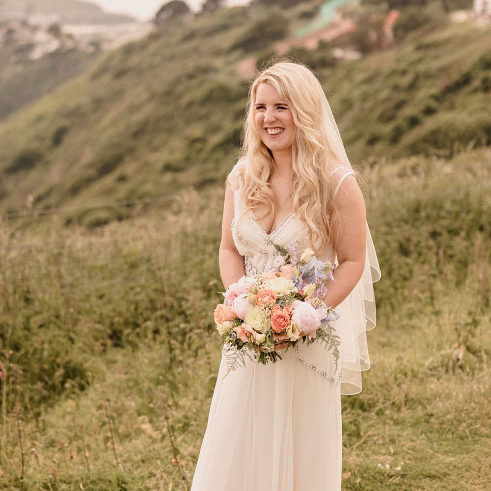 This laid-back clifftop wedding blends pastel palettes, marbled details, and personal touches. From shell garlands to a biscuit-loving dog ring bearer. A must-read for coastal wedding inspiration!