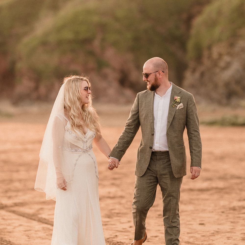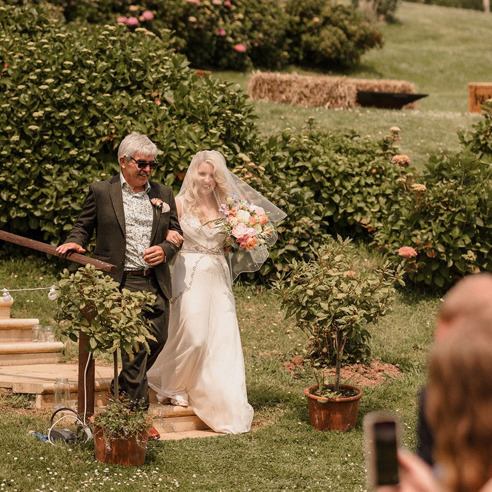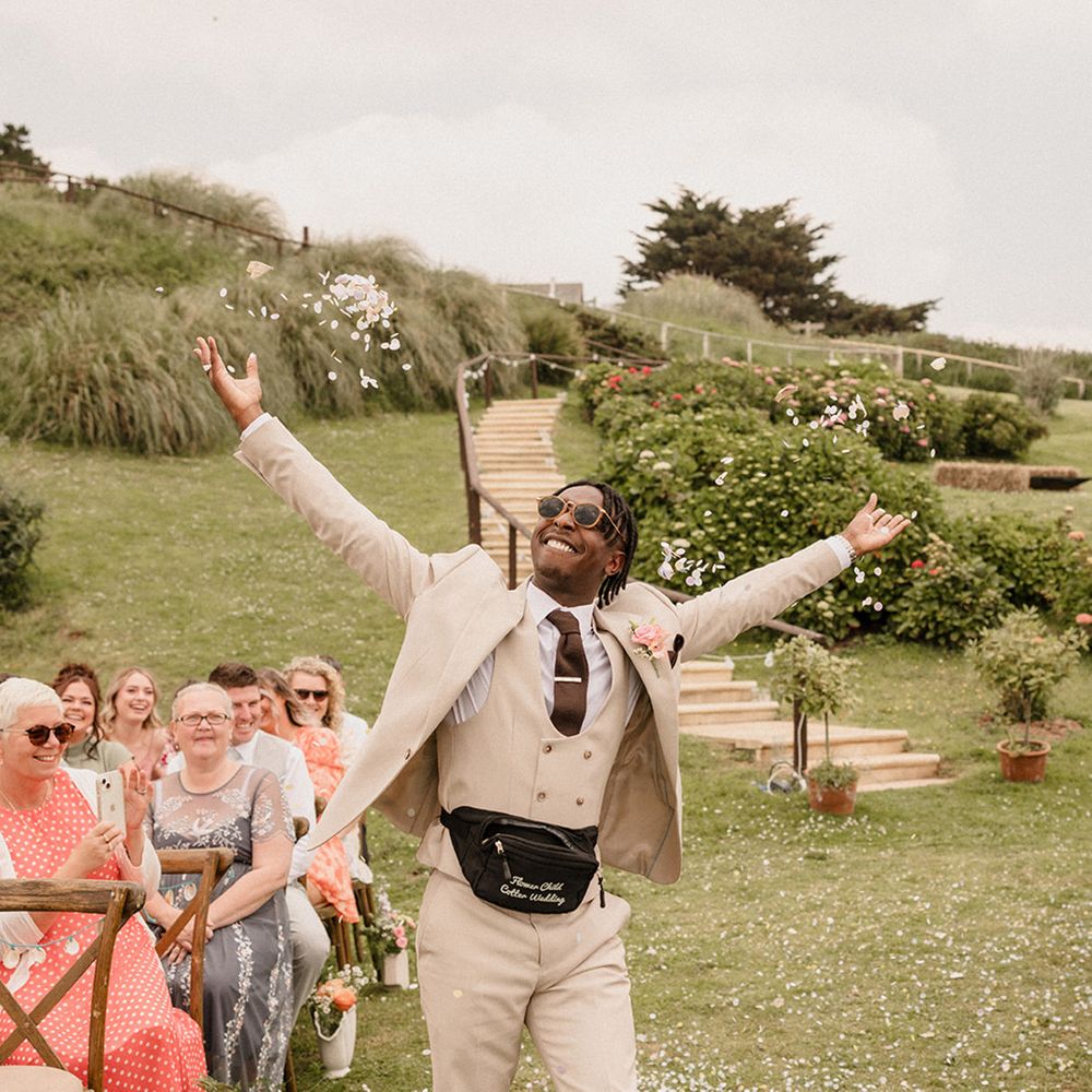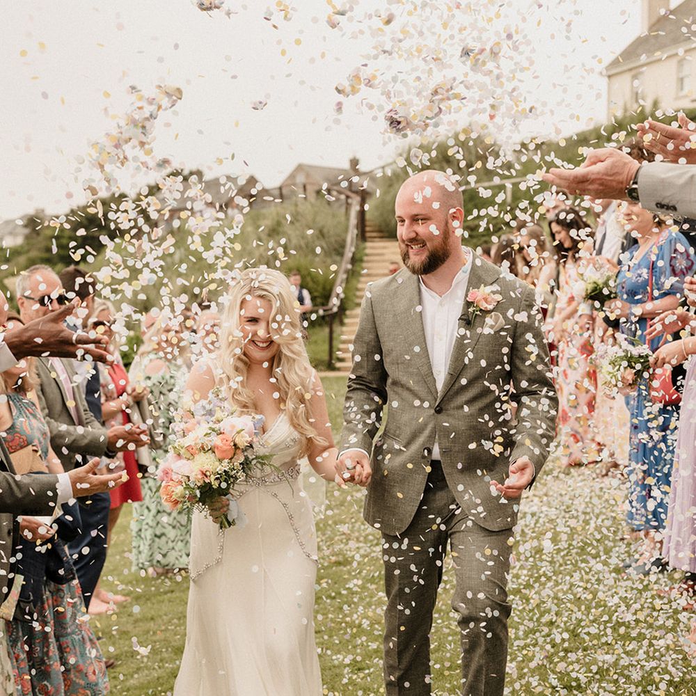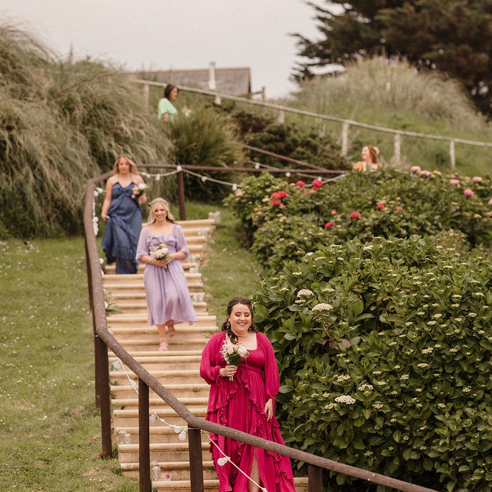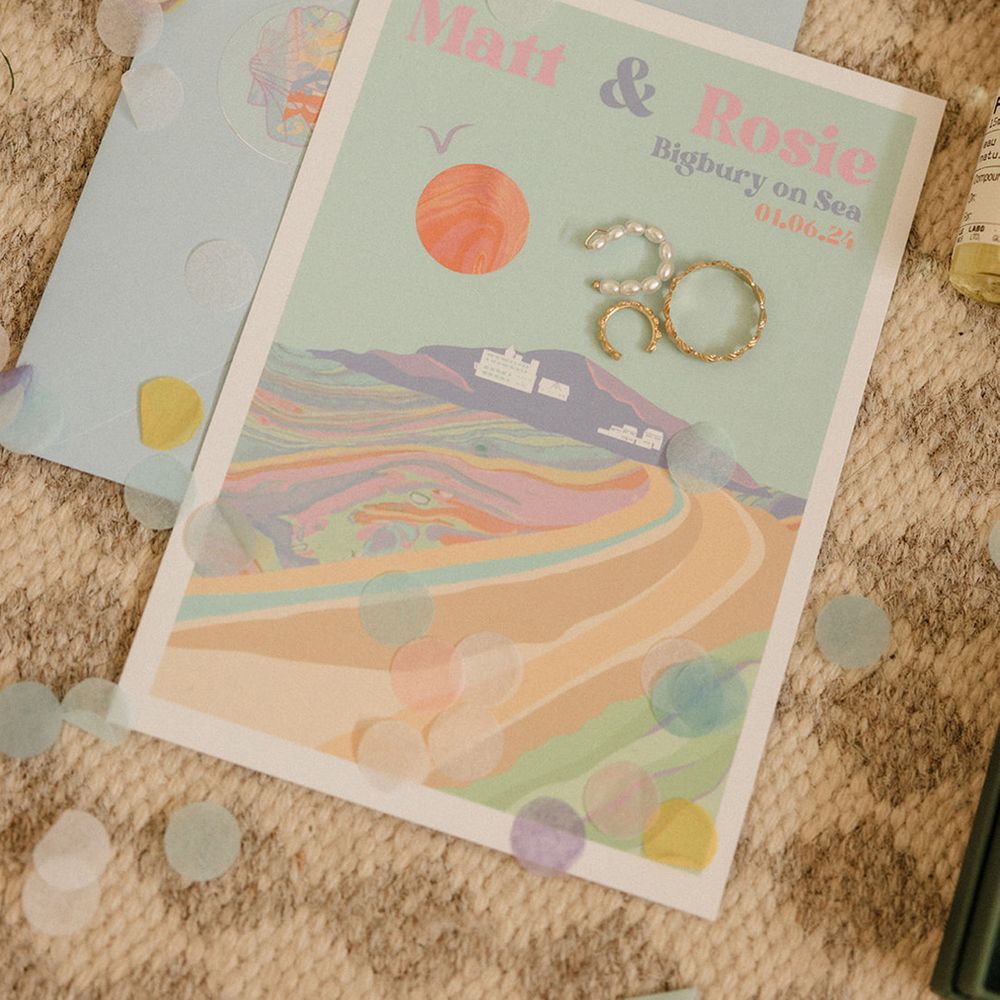 This laid-back clifftop wedding blends pastel palettes, marbled details, and personal touches. From shell garlands to a biscuit-loving dog ring bearer. A must-read for coastal wedding inspiration!
