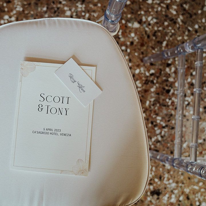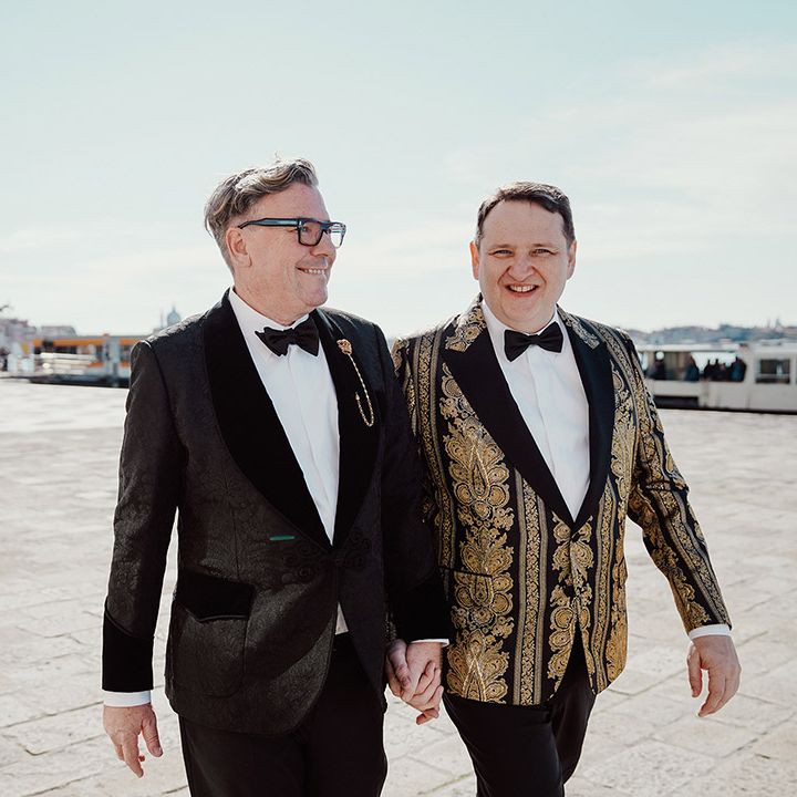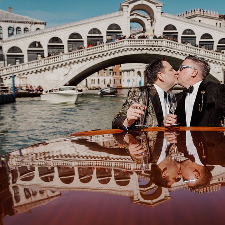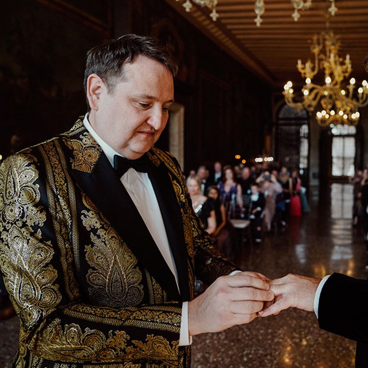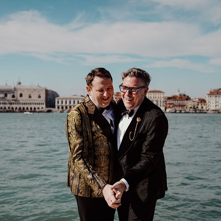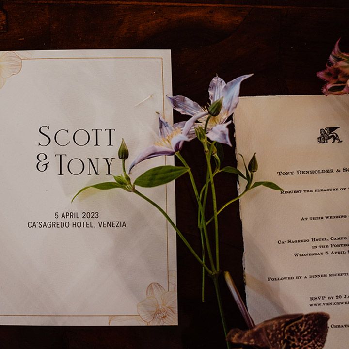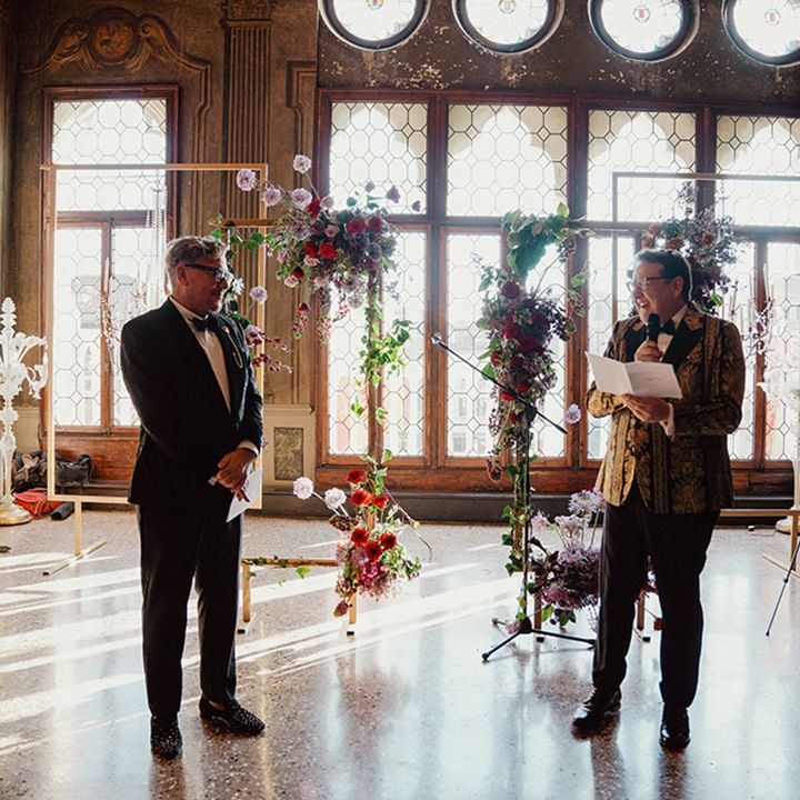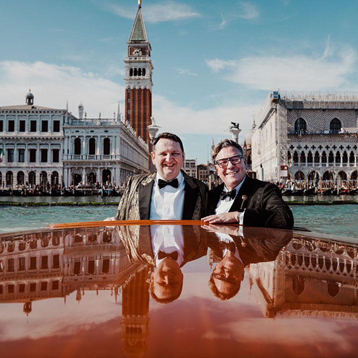 Scott & Tony fell in love with Ca’Sagredo the first time they stayed there many years ago. It was the perfect location for their wedding! The two grooms felt the opulent Venetian Palace would match their gothic luxe vibe exactly. The couple had their wedding breakfast in the spectacular 15th-century music ballroom. Scott & Tony initially decided on Venice as it holds a special place in their hearts. The couple got engaged in Venice in 2015 and they were lucky to have one last trip to Venice with Scott's sister 9 months before she died from cancer in 2012. Plus, it’s their favourite city in the world. Venice is the backdrop to countless classic love stories, so it’s only right that Scott & Tony add their own to the mix. Celebrating with so many of their loved ones in one of their favourite places ever was just so magical.