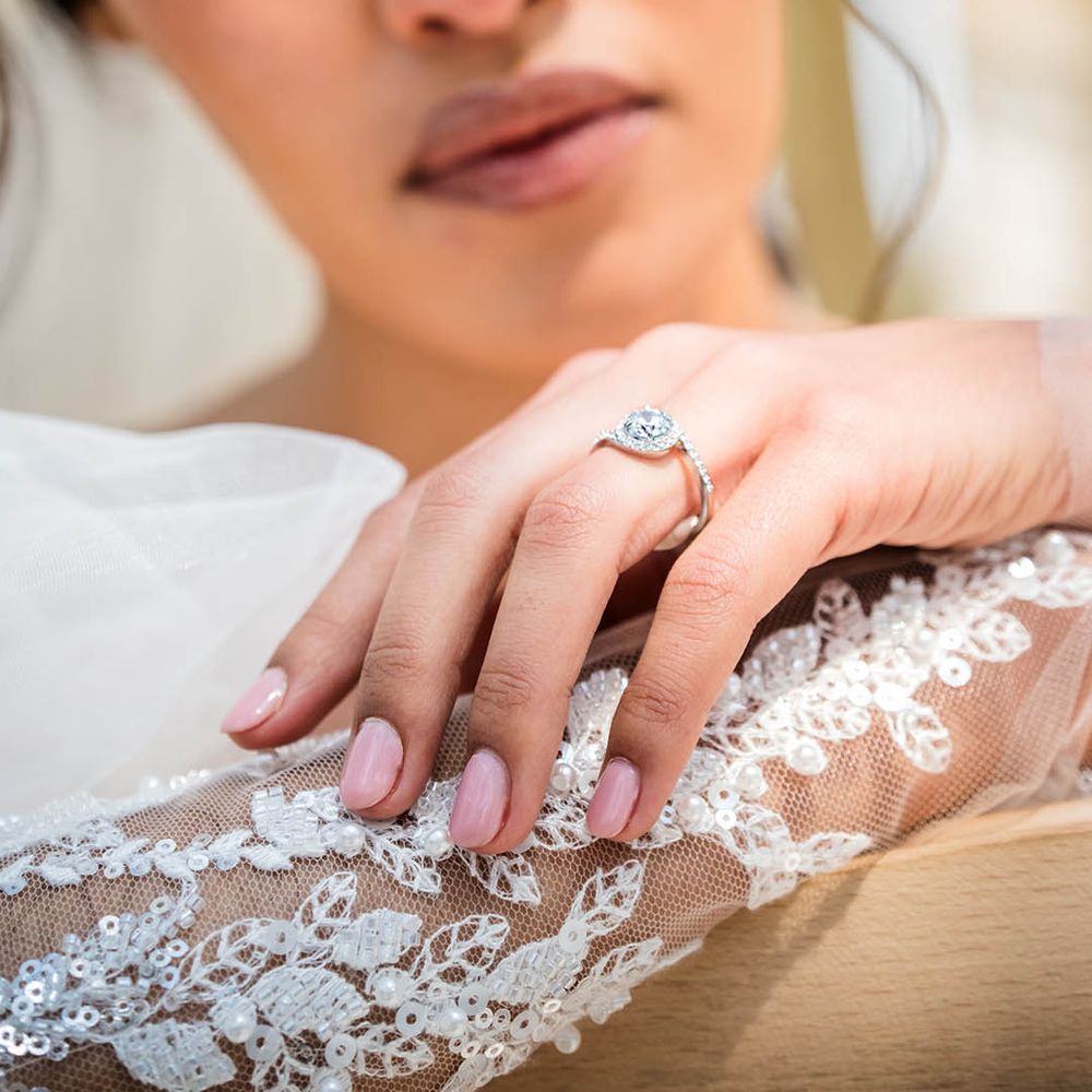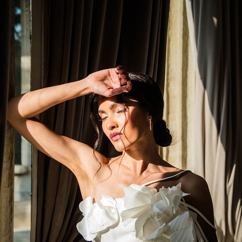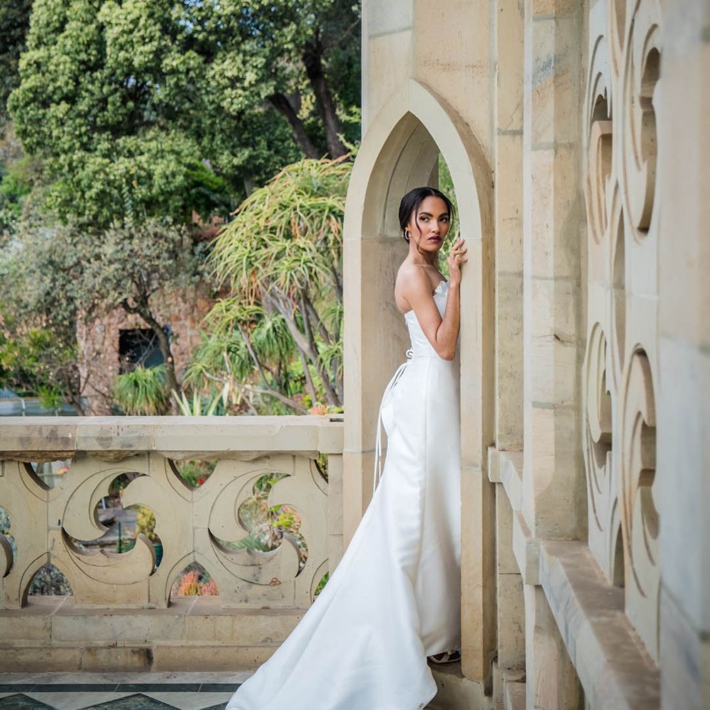 The Haleema dress by Milla Nova was customised with fitted detachable embroidered sleeves and feathers were added to the corset for a unique touch to inspire future brides seeking modern and fun additions to their gowns. We used a Swarovski overlap round cut ring to complement the dress and strayed away from over-accessorising the model as the Haleema gown itself was abundant in embroidery and sequins.