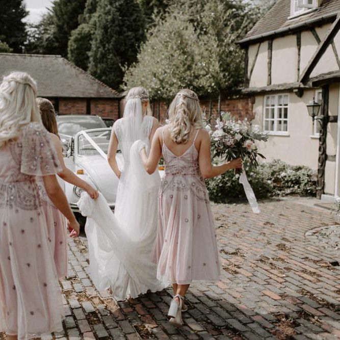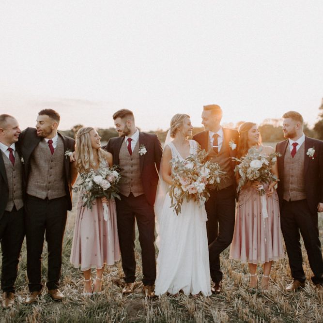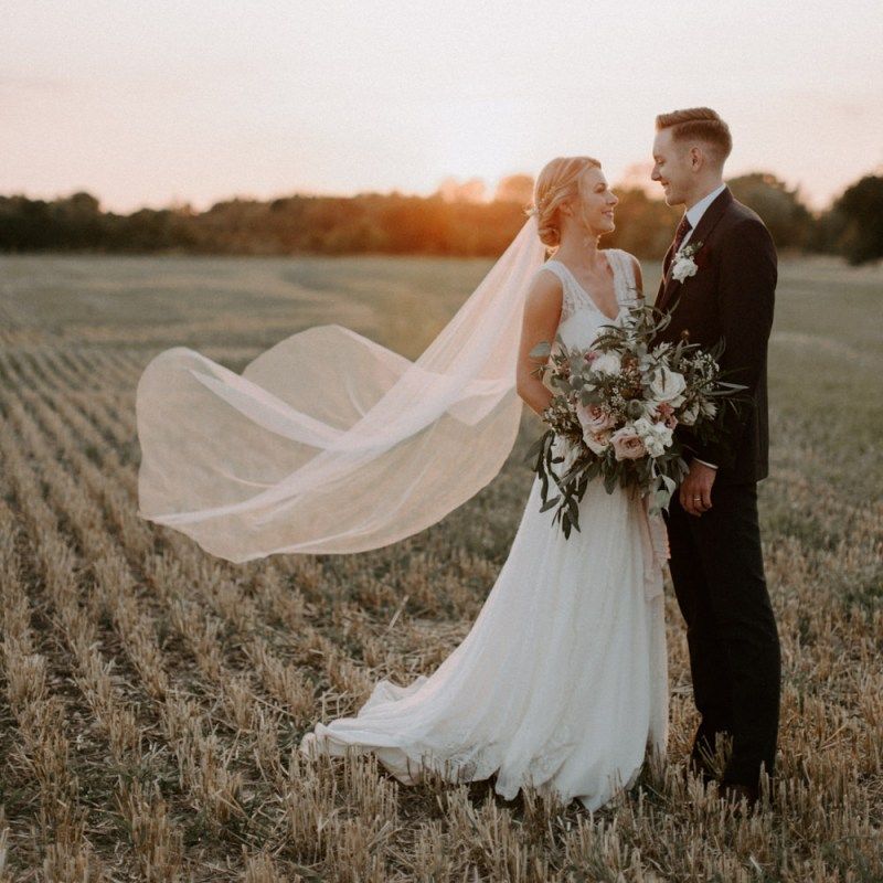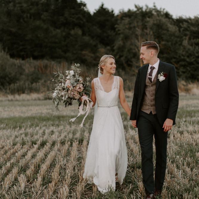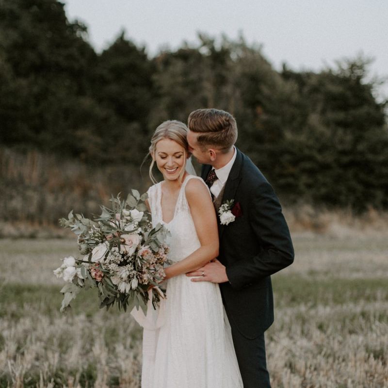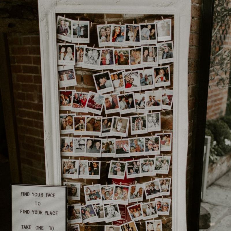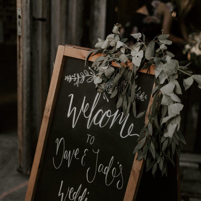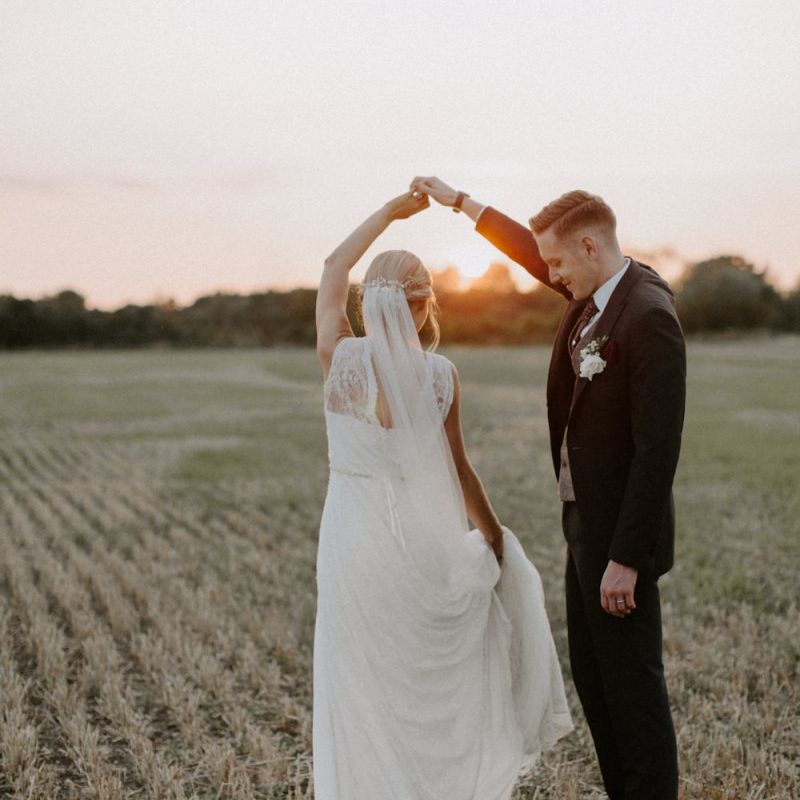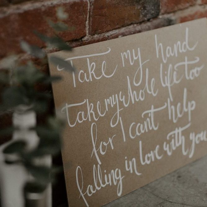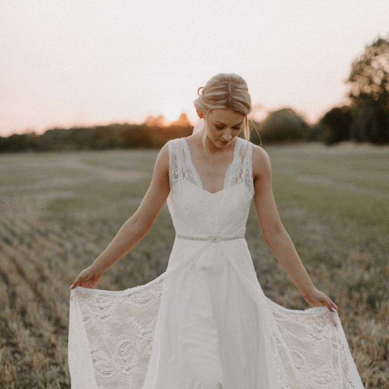 We really wanted our day to be filled with personal touches so that way it would be really unique to us. A very talented friend hand-painted our wedding stationery designs from scratch, the cake was made by my Nan and Dave wrote our personal ceremony reading. Another friend created hand-painted signs with lyrics from one of our wedding songs and I also made a lot of DIY decorations myself, including our table plan which was an upcycled vintage frame with polaroids of all our guests! Our whole day was perfect and we couldn't have asked for more. From our sunset wedding photos in the fields by Grace & Mitch to the incredible heartfelt speeches by my Dad, Dave and his Best Man, which at one point also included an unexpected game of Mr & Mrs! The reception was set to the soundtrack of The Good Habits Band who had us dancing all night long in between toasting marshmallows and visiting the photo-booth and the cookie wall. The night ended with our shoes off, singing our hearts out.. the perfect end to the perfect day.