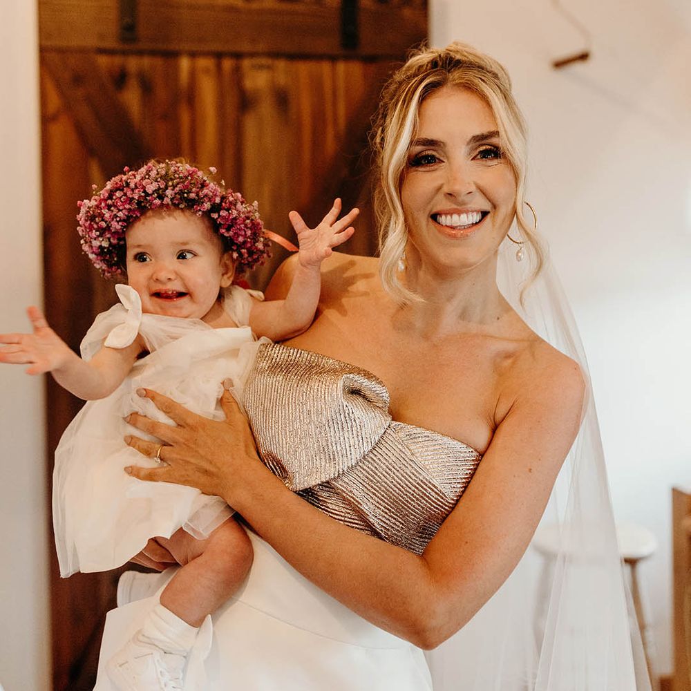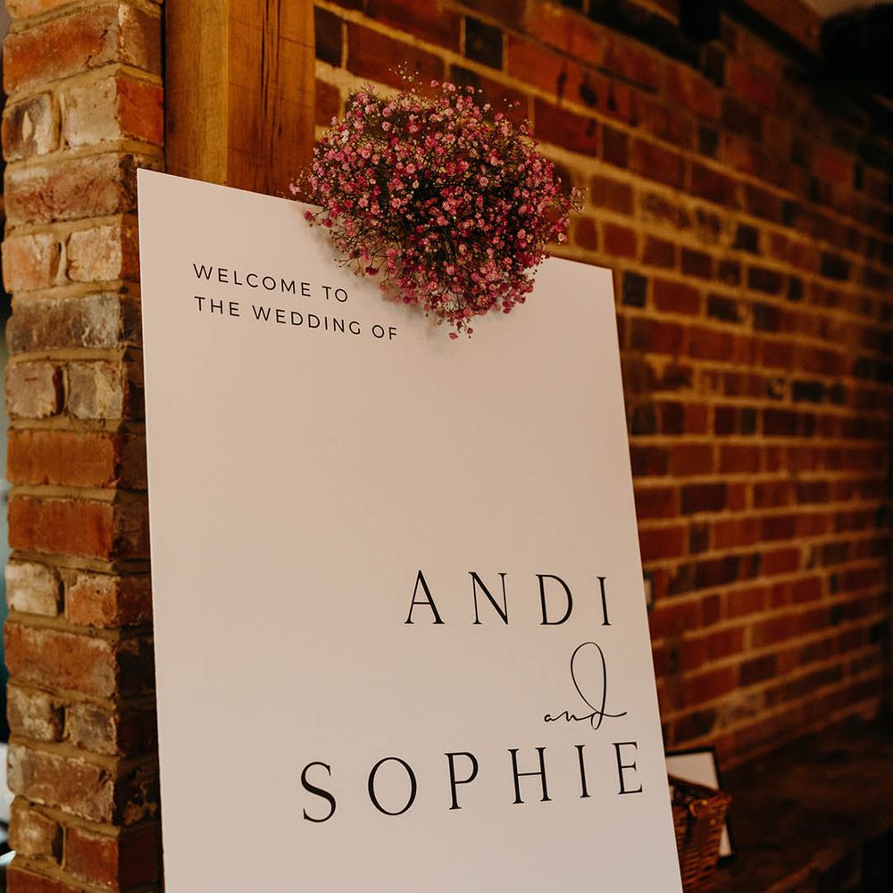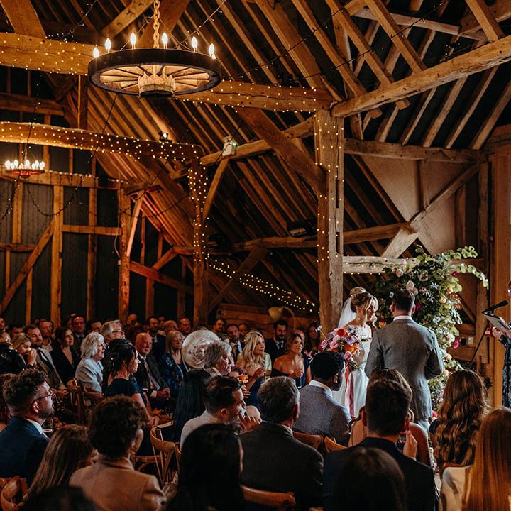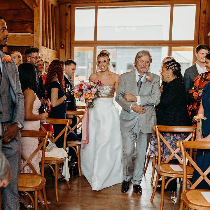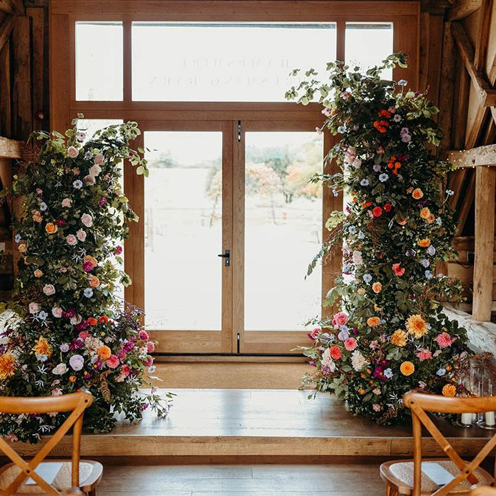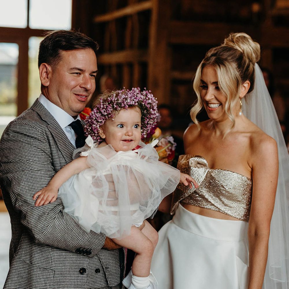 Sophie & Andi wanted their day to be a full celebration from start to finish. Styling-wise, the couple opted for wild and colourful flowers, with a rural yet contemporary aesthetic, which Silchester Farm in Hampshire provided in spades. The day started with the ultimate glam squad that made Sophie and her bridesmaids feel like a million dollars. The venue was decked out in stunning vibrant wedding flowers and those amazing flower columns! The wedding celebrant, Claire, made Sophie & Andi's wedding ceremony so personal and special and it helped to have their gorgeous little girl, in a pretty flower crown, present for the whole thing with all their other loved ones watching! Two of Sophie's friends wrote the most amazing poem about her, Andi and their daughter, which they read out at the ceremony!