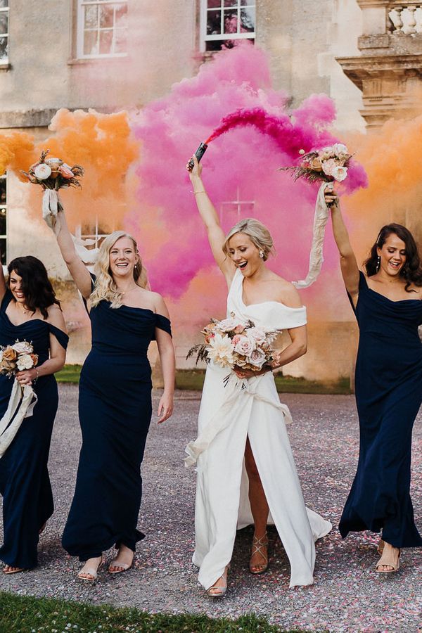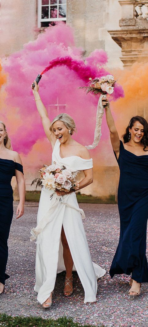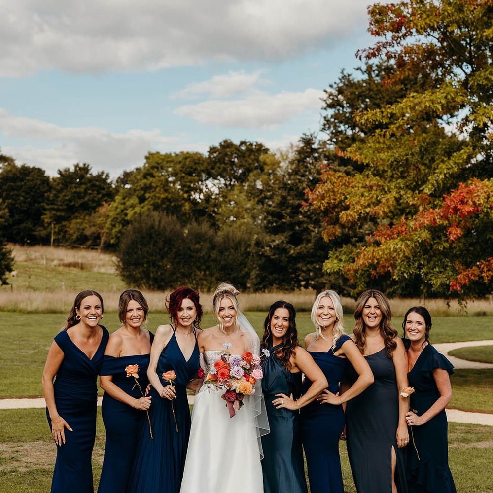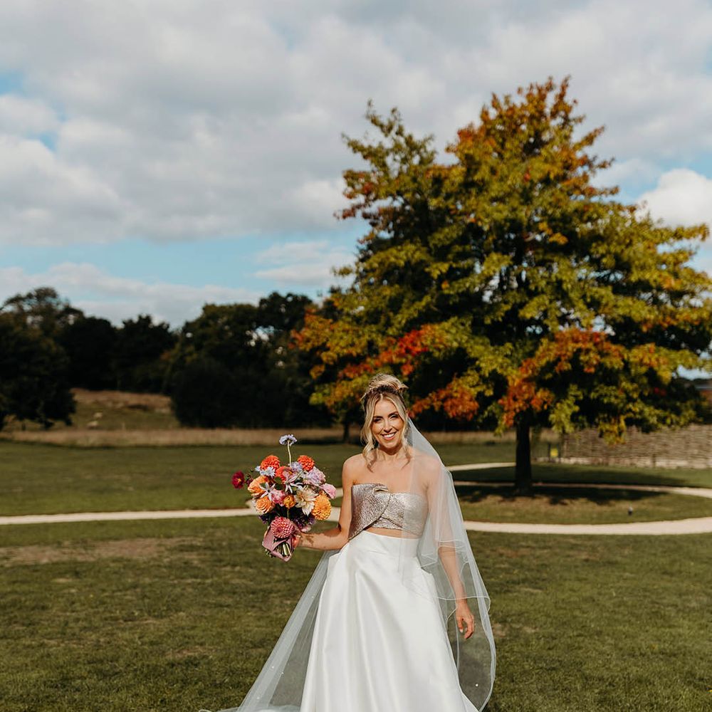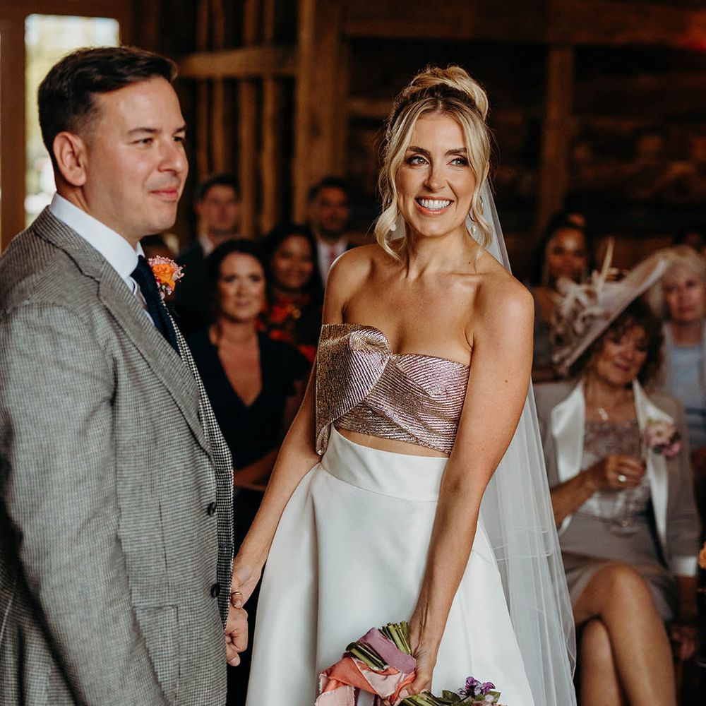 Sophie & Andi wanted their day to be a full celebration from start to finish. Styling-wise, the couple opted for wild and colourful flowers, with a rural yet contemporary aesthetic, which Silchester Farm in Hampshire provided in spades. The day started with the ultimate glam squad that made Sophie and her bridesmaids feel like a million dollars. The venue was decked out in stunning vibrant wedding flowers and those amazing flower columns! The wedding celebrant, Claire, made Sophie & Andi's wedding ceremony so personal and special and it helped to have their gorgeous little girl, in a pretty flower crown, present for the whole thing with all their other loved ones watching! Two of Sophie's friends wrote the most amazing poem about her, Andi and their daughter, which they read out at the ceremony!