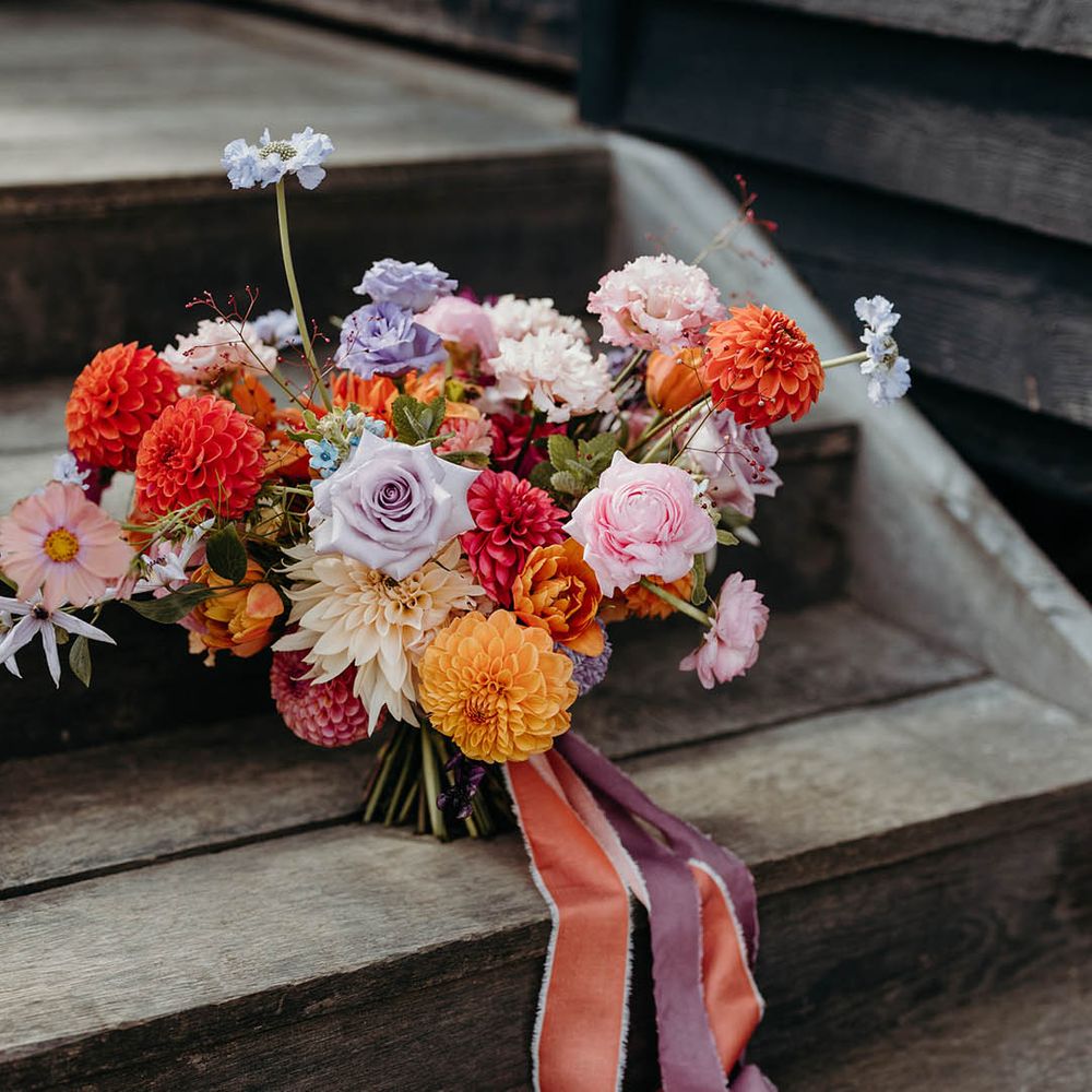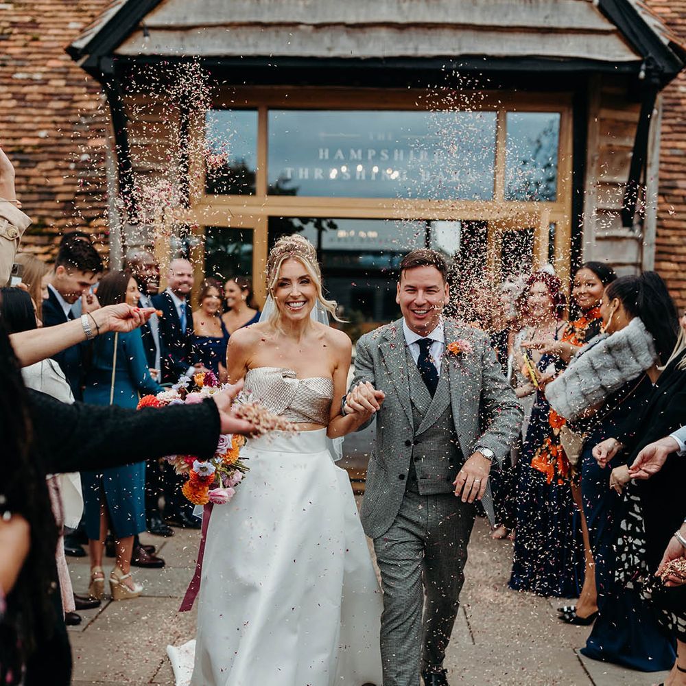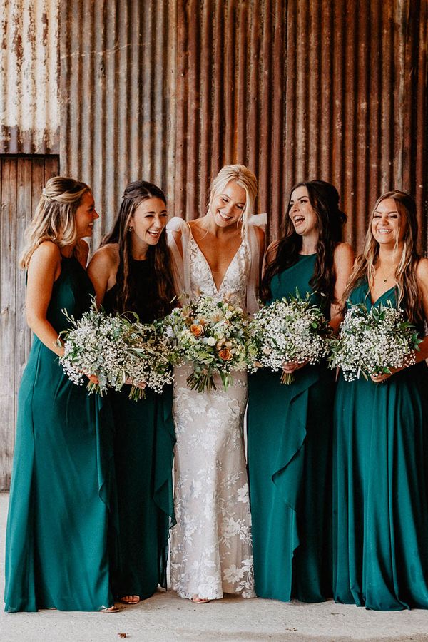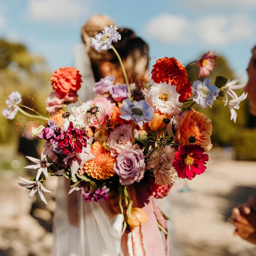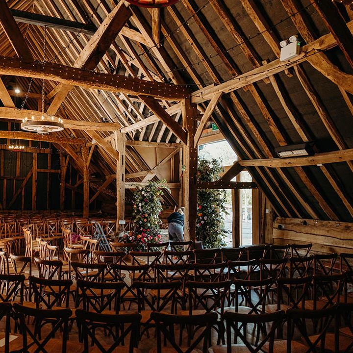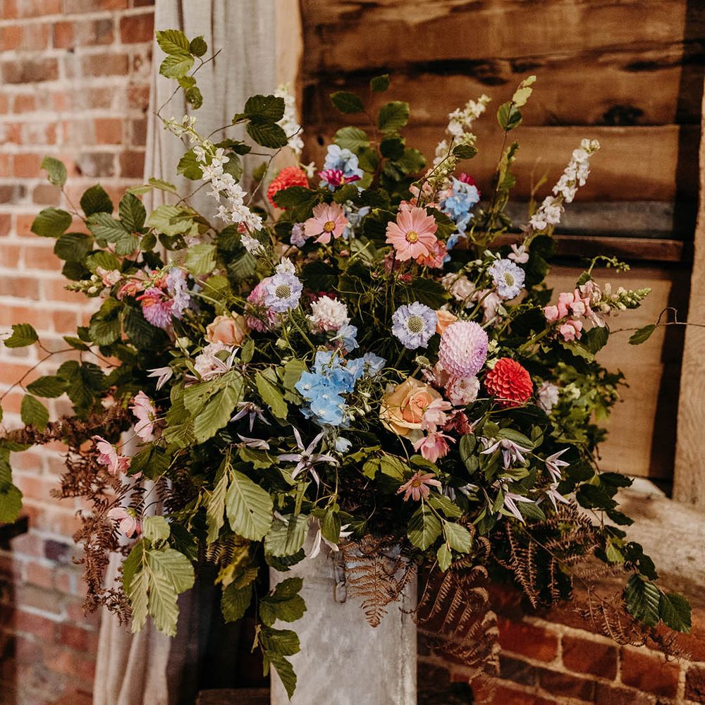 Sophie & Andi wanted their day to be a full celebration from start to finish. Styling-wise, the couple opted for wild and colourful flowers, with a rural yet contemporary aesthetic, which Silchester Farm in Hampshire provided in spades. The day started with the ultimate glam squad that made Sophie and her bridesmaids feel like a million dollars. The venue was decked out in stunning vibrant wedding flowers and those amazing flower columns! The wedding celebrant, Claire, made Sophie & Andi's wedding ceremony so personal and special and it helped to have their gorgeous little girl, in a pretty flower crown, present for the whole thing with all their other loved ones watching! Two of Sophie's friends wrote the most amazing poem about her, Andi and their daughter, which they read out at the ceremony!
