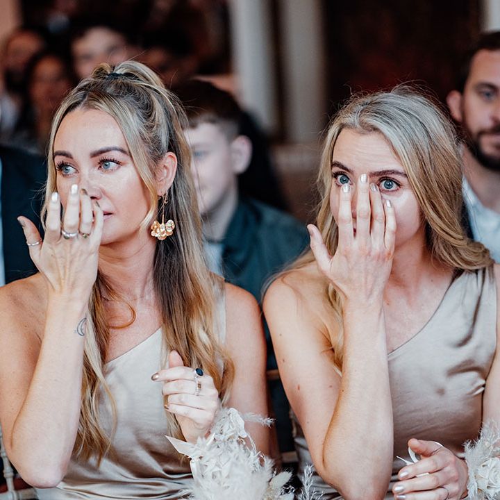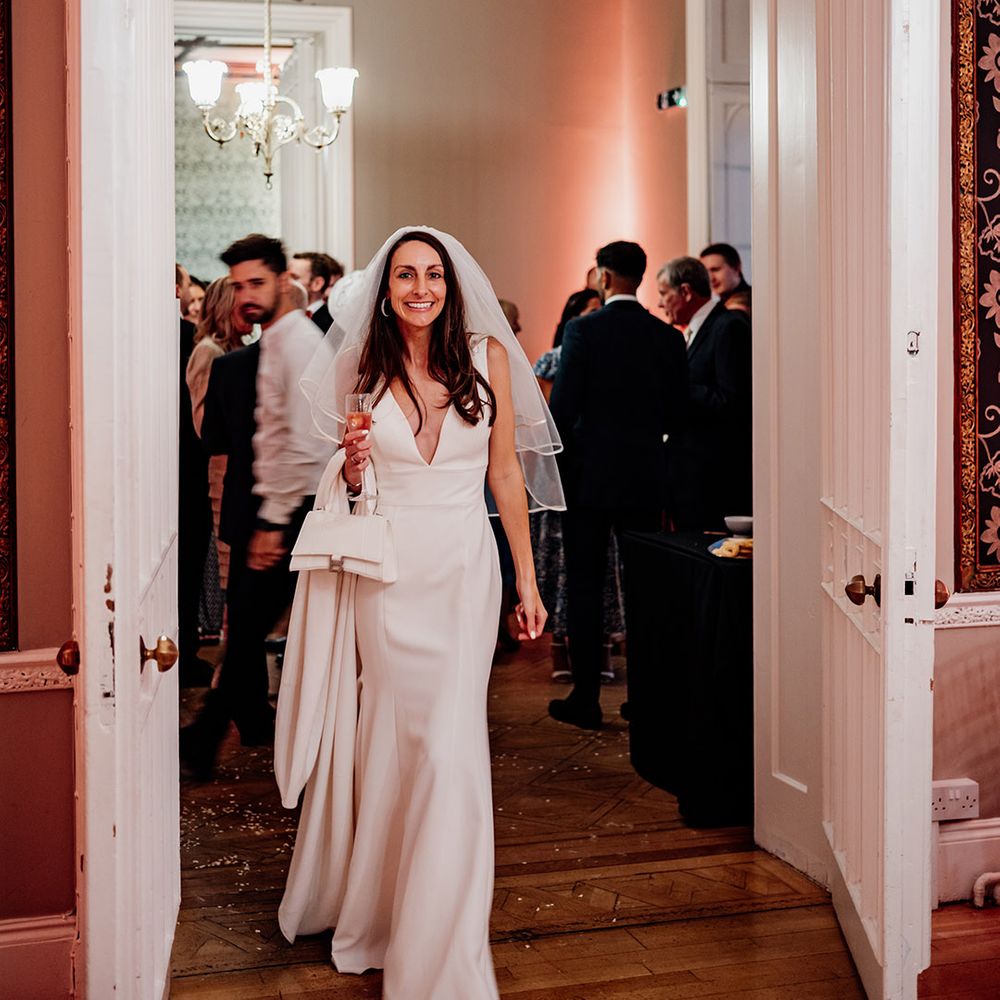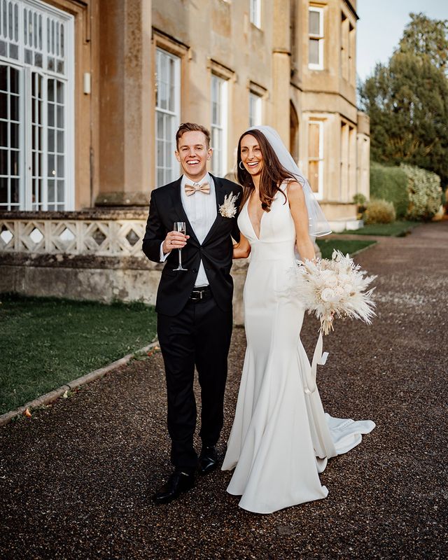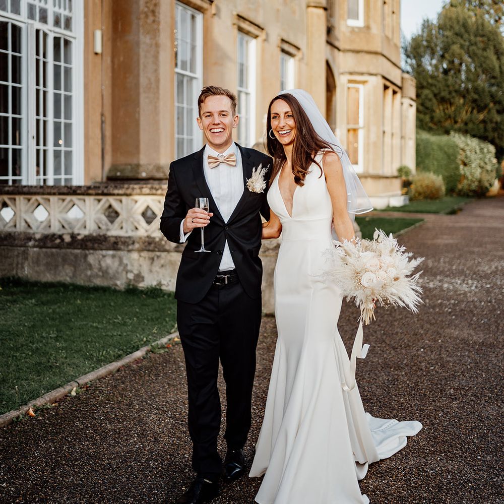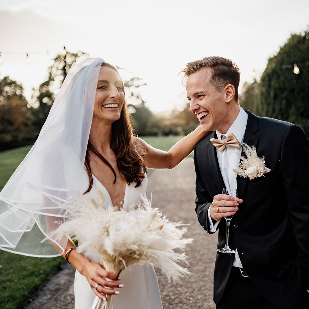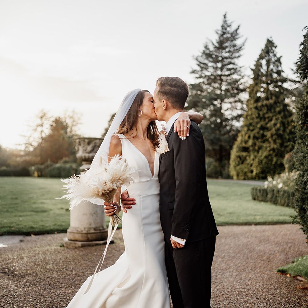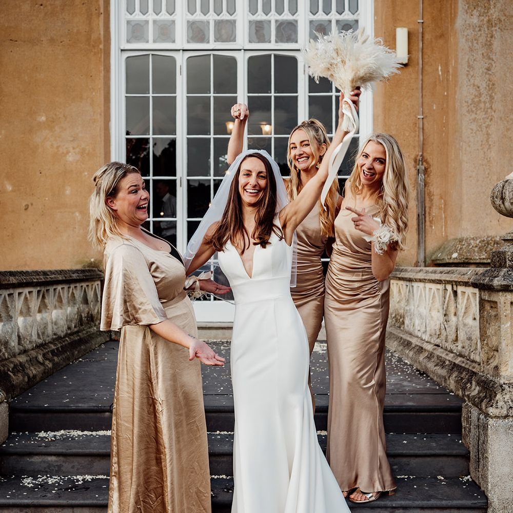 Stephanie & Alex married at the grand Nonsuch Mansion in Cheam. Despite the stately and luxurious setting, the couple were all about having a fun and relaxed day. They ditched formalities so they and their guests could have a good ol’ time. There was mini golf, several rounds of quizzes, a live band, and a pizza van! How could you not have a good time with all that entertainment? Of course, Stephanie & Alex’s wedding day and styling reflected the luxe wedding venue with a champagne colour palette (and plenty of champagne to drink too). The bridesmaid literally shone in their champagne-tone bridesmaid dresses and the soft and whimsical touches of the white dried flowers were perfect for the winter season. Everything about this wedding was elegant. Stephanie’s wedding veil was actually the one her nan and her mum had married in. How special!