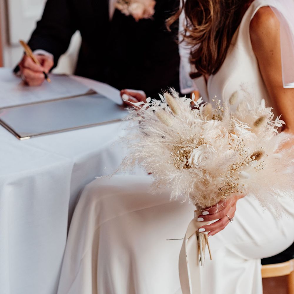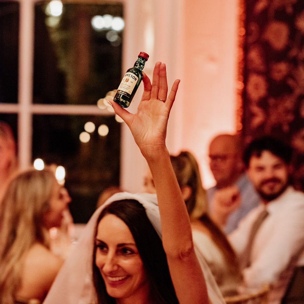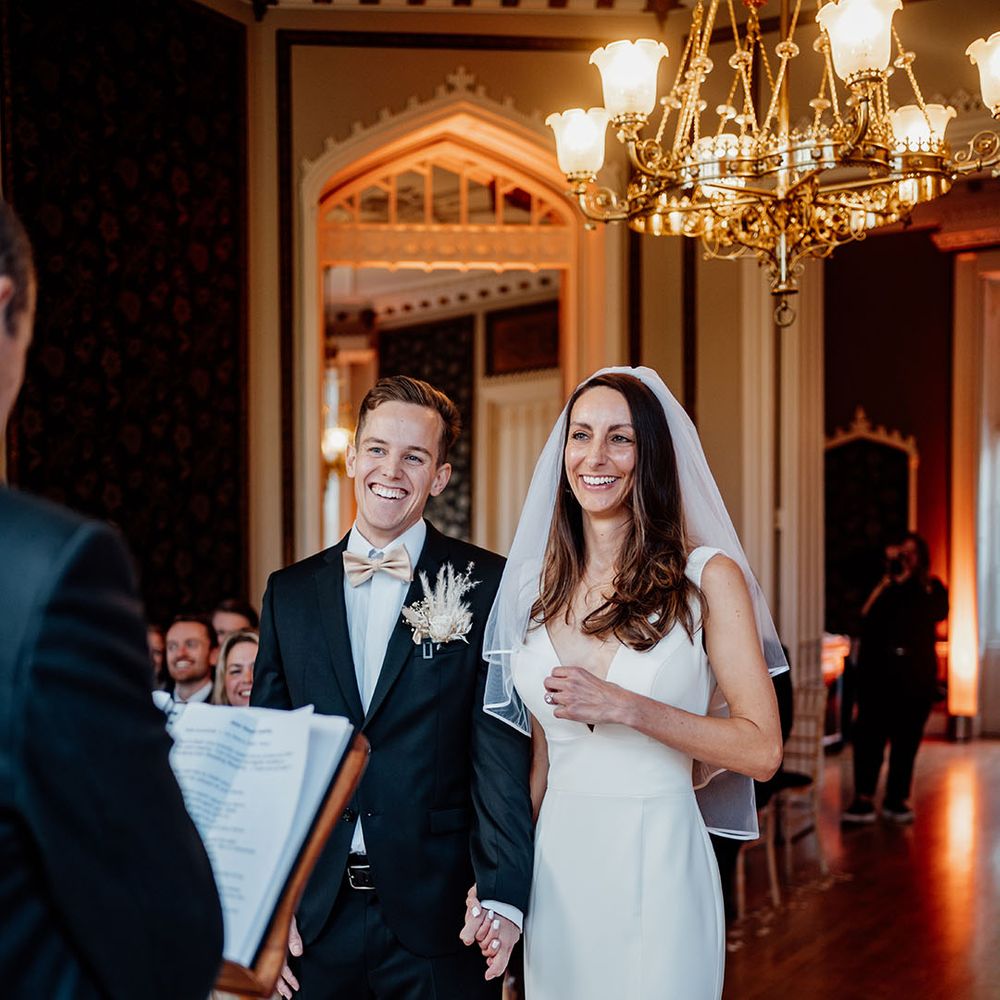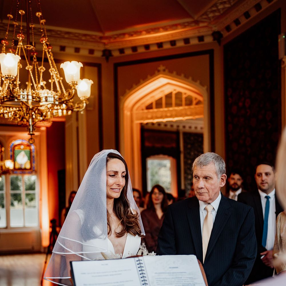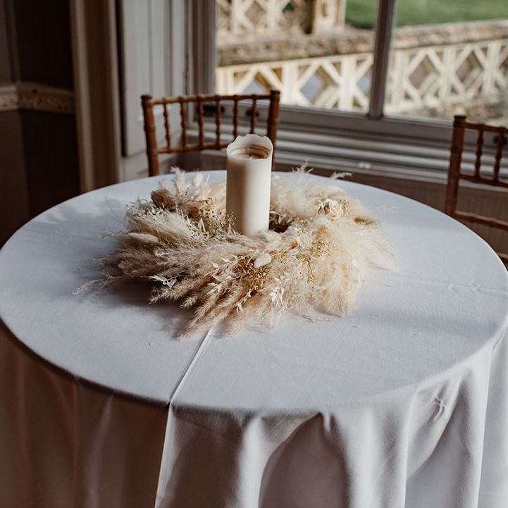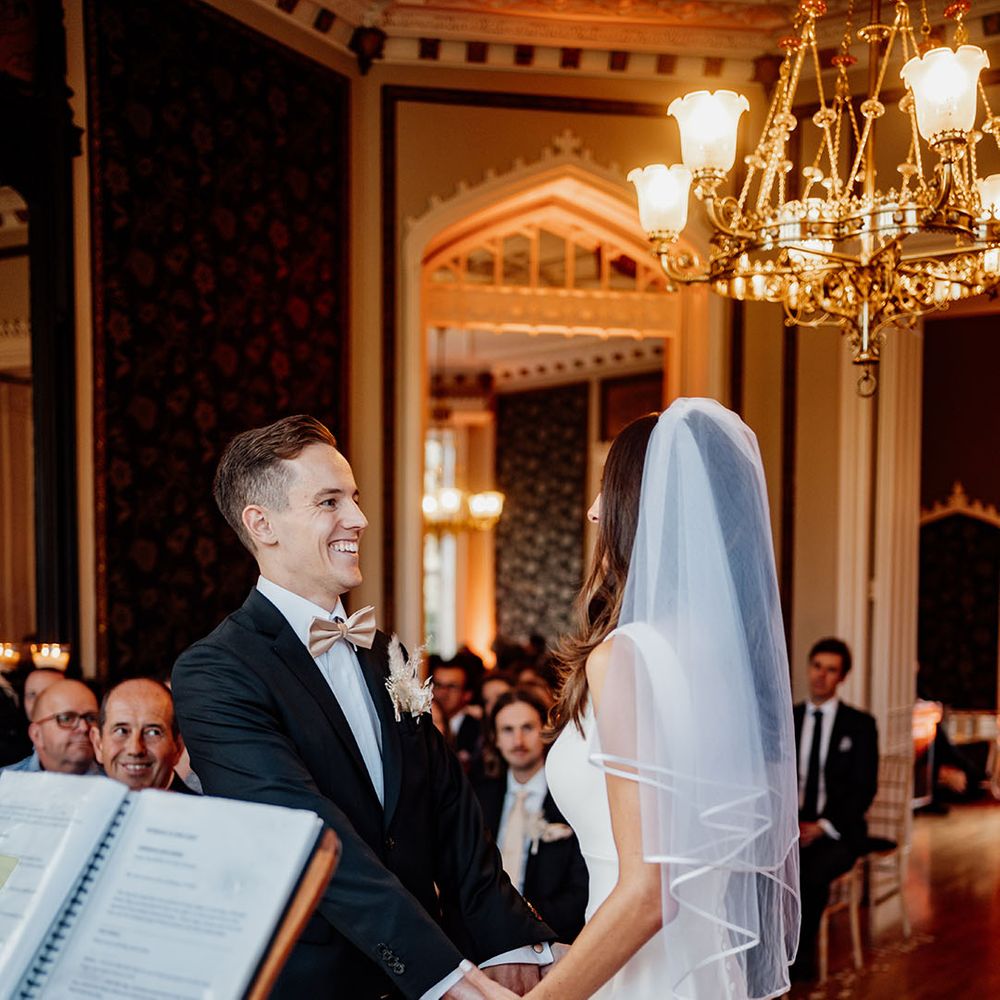 Stephanie & Alex married at the grand Nonsuch Mansion in Cheam. Despite the stately and luxurious setting, the couple were all about having a fun and relaxed day. They ditched formalities so they and their guests could have a good ol’ time. There was mini golf, several rounds of quizzes, a live band, and a pizza van! How could you not have a good time with all that entertainment? Of course, Stephanie & Alex’s wedding day and styling reflected the luxe wedding venue with a champagne colour palette (and plenty of champagne to drink too). The bridesmaid literally shone in their champagne-tone bridesmaid dresses and the soft and whimsical touches of the white dried flowers were perfect for the winter season. Everything about this wedding was elegant. Stephanie’s wedding veil was actually the one her nan and her mum had married in. How special!