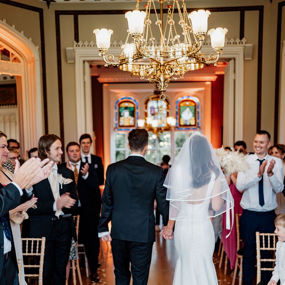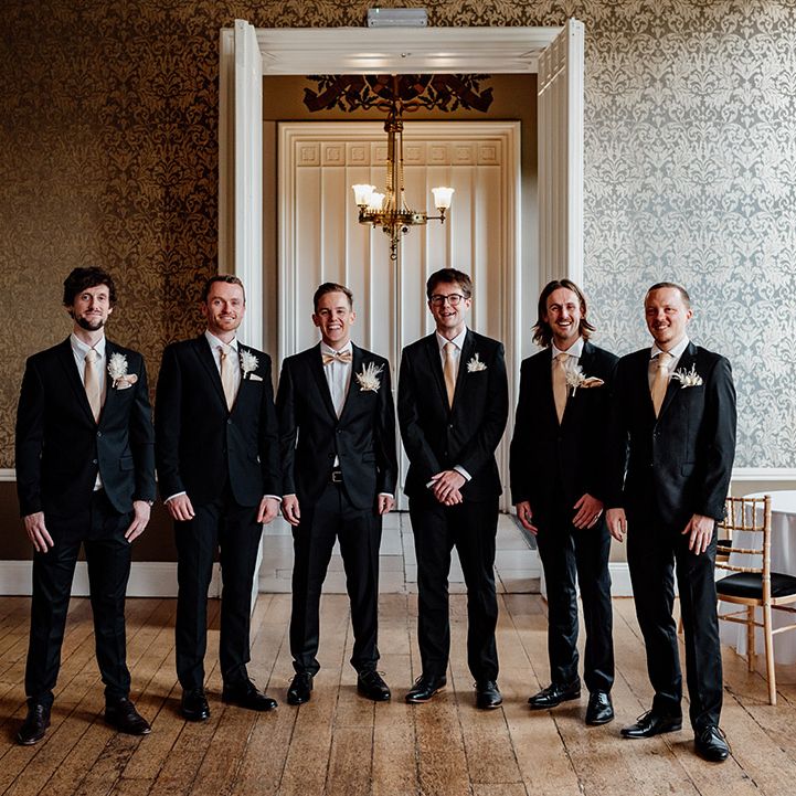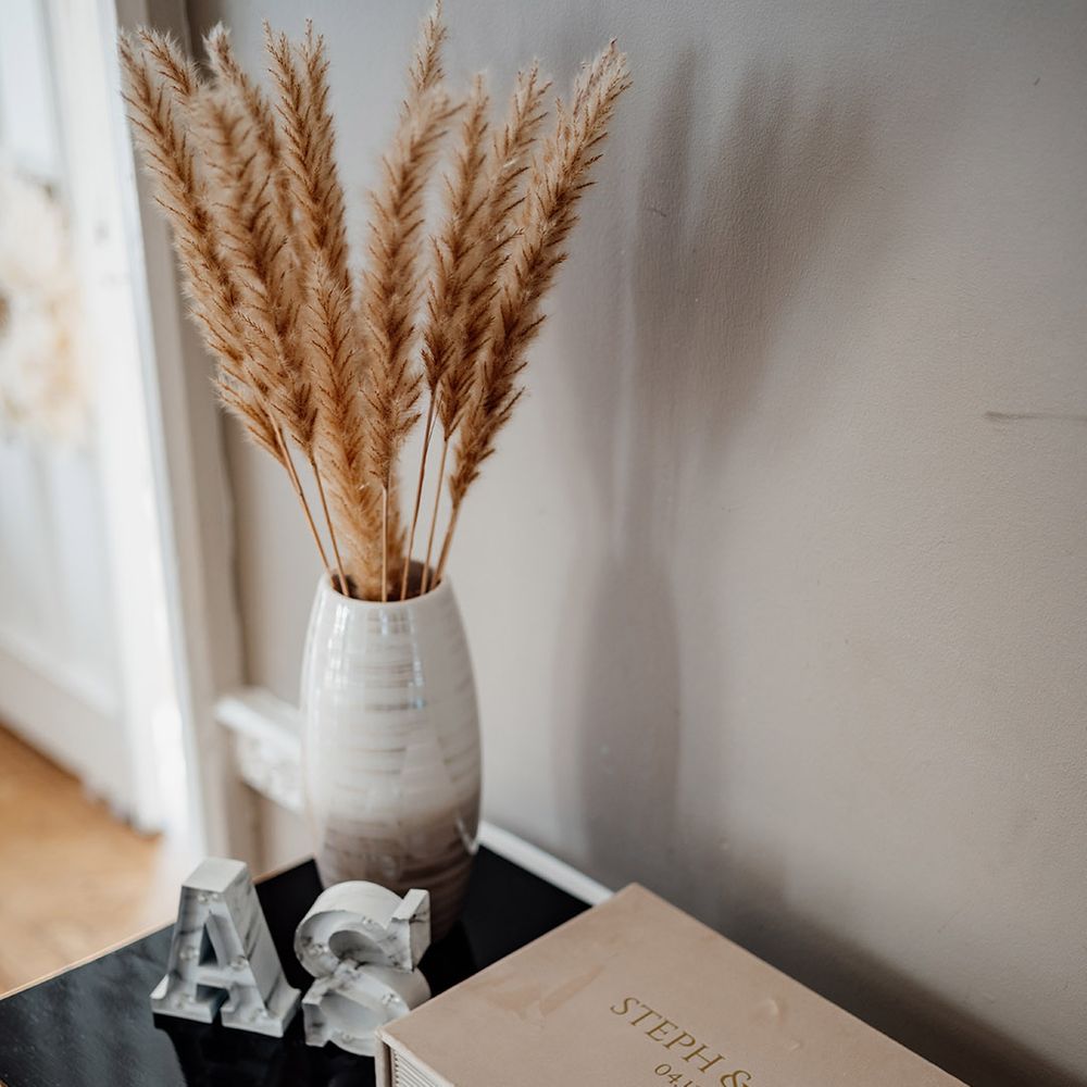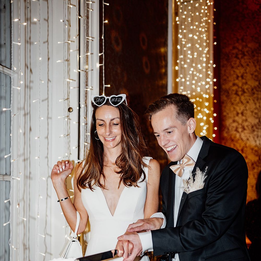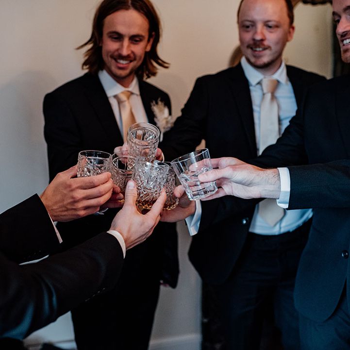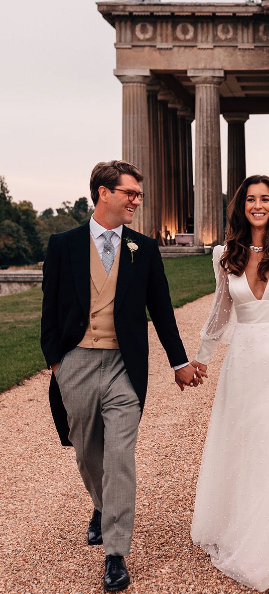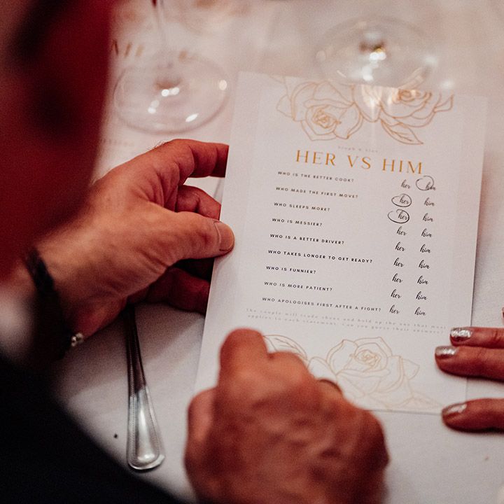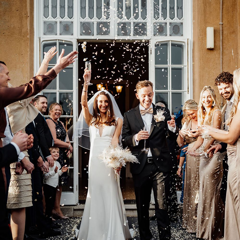 Stephanie & Alex married at the grand Nonsuch Mansion in Cheam. Despite the stately and luxurious setting, the couple were all about having a fun and relaxed day. They ditched formalities so they and their guests could have a good ol’ time. There was mini golf, several rounds of quizzes, a live band, and a pizza van! How could you not have a good time with all that entertainment? Of course, Stephanie & Alex’s wedding day and styling reflected the luxe wedding venue with a champagne colour palette (and plenty of champagne to drink too). The bridesmaid literally shone in their champagne-tone bridesmaid dresses and the soft and whimsical touches of the white dried flowers were perfect for the winter season. Everything about this wedding was elegant. Stephanie’s wedding veil was actually the one her nan and her mum had married in. How special!