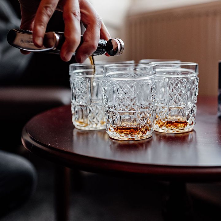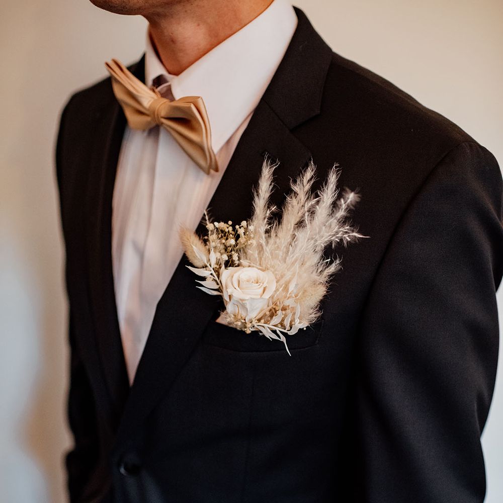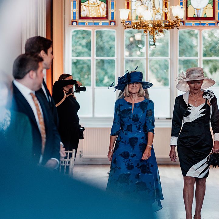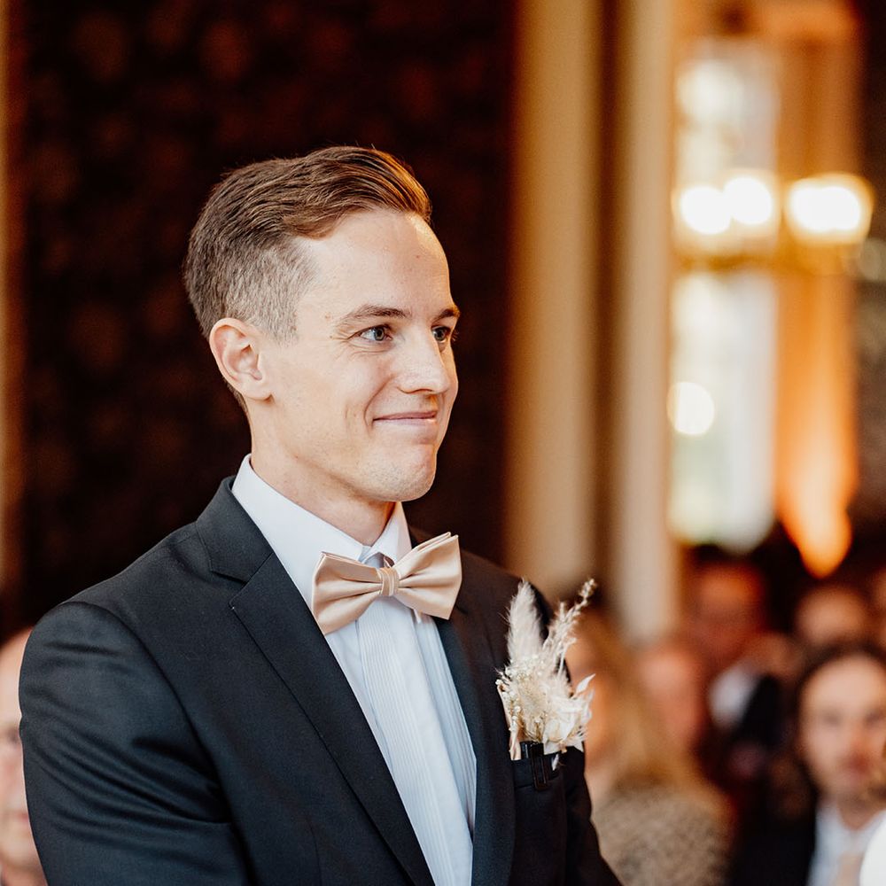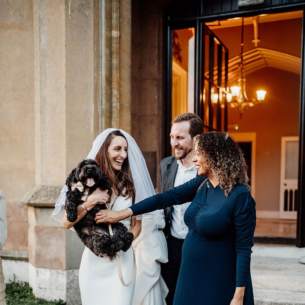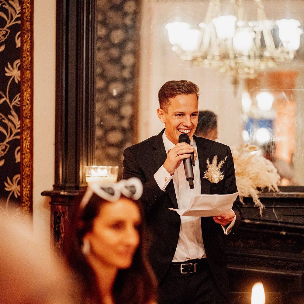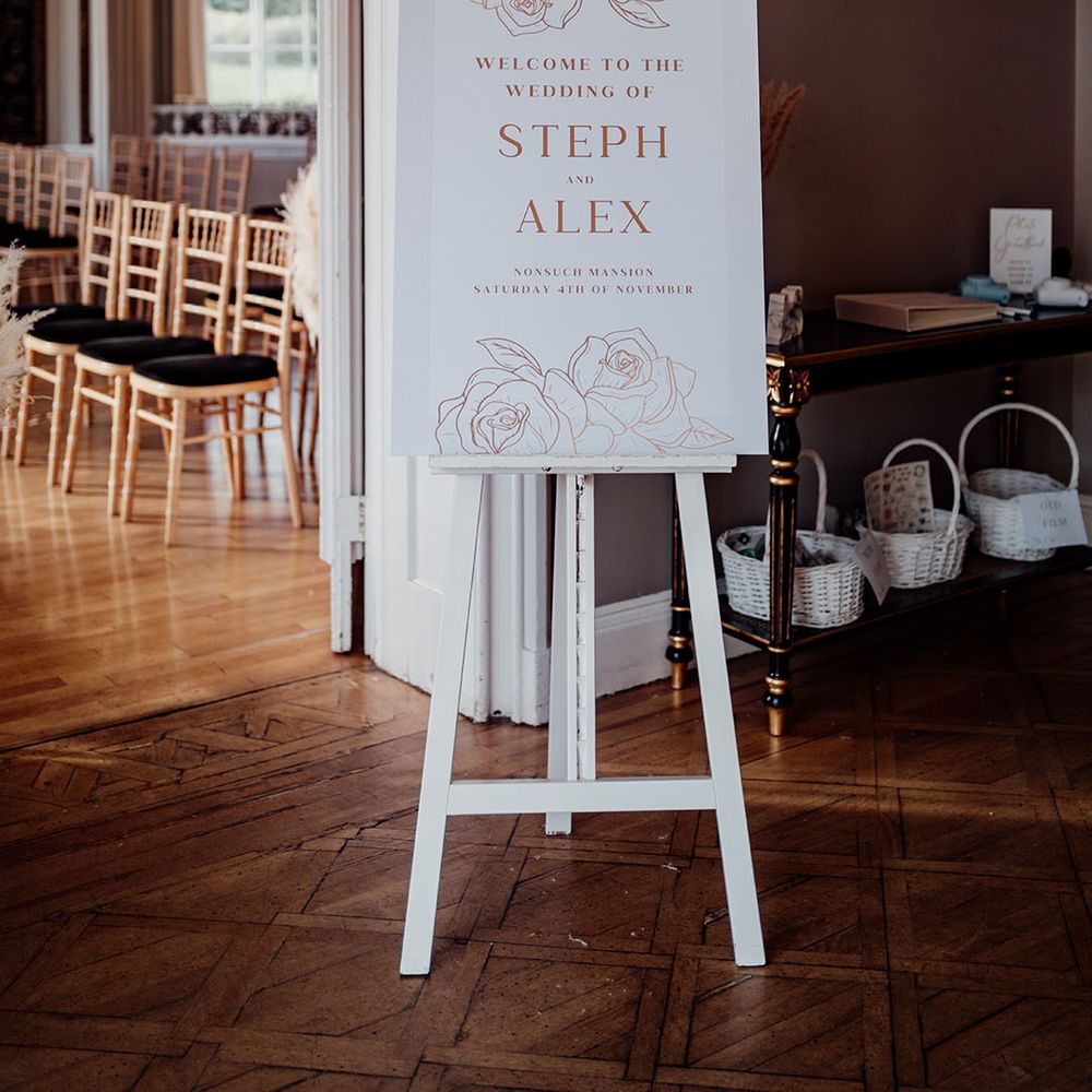 Stephanie & Alex married at the grand Nonsuch Mansion in Cheam. Despite the stately and luxurious setting, the couple were all about having a fun and relaxed day. They ditched formalities so they and their guests could have a good ol’ time. There was mini golf, several rounds of quizzes, a live band, and a pizza van! How could you not have a good time with all that entertainment? Of course, Stephanie & Alex’s wedding day and styling reflected the luxe wedding venue with a champagne colour palette (and plenty of champagne to drink too). The bridesmaid literally shone in their champagne-tone bridesmaid dresses and the soft and whimsical touches of the white dried flowers were perfect for the winter season. Everything about this wedding was elegant. Stephanie’s wedding veil was actually the one her nan and her mum had married in. How special!