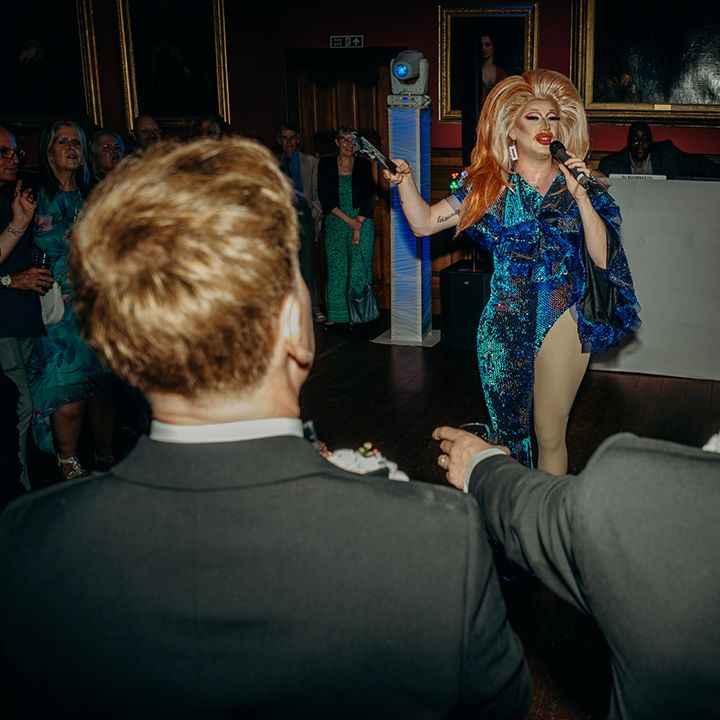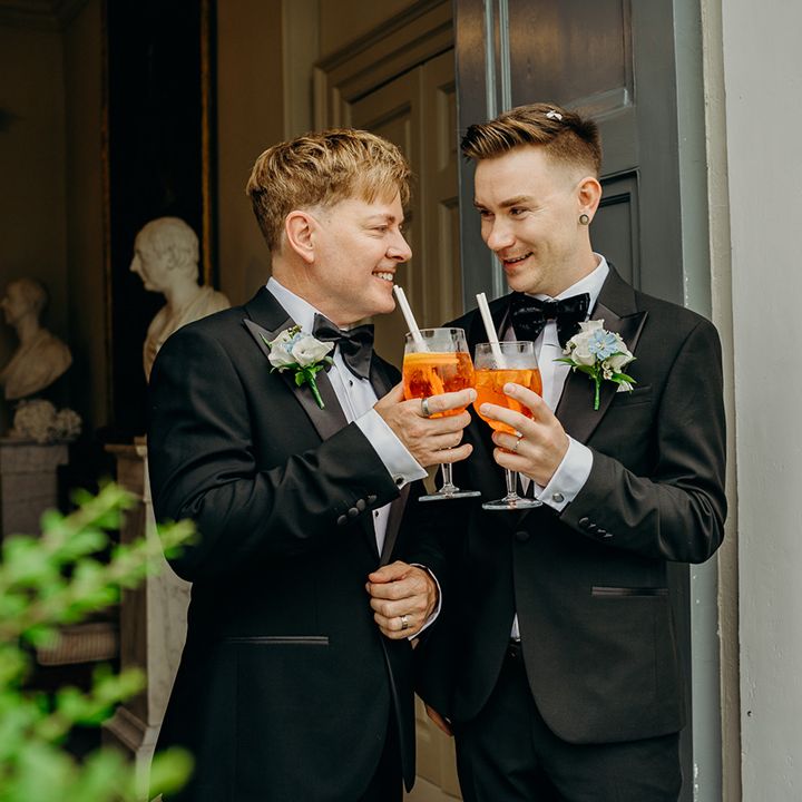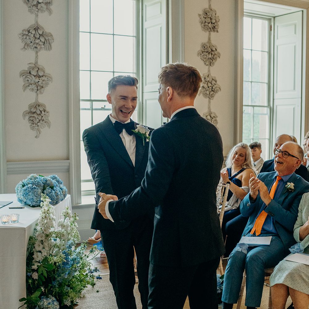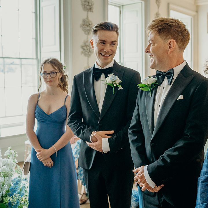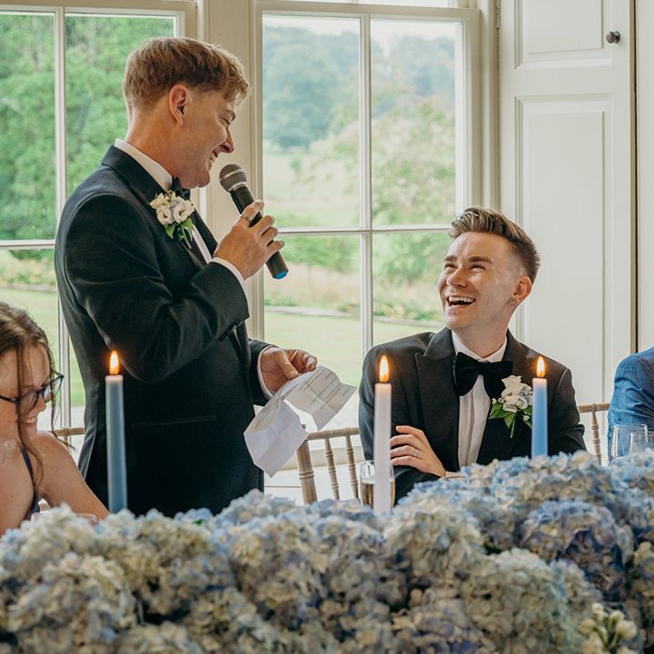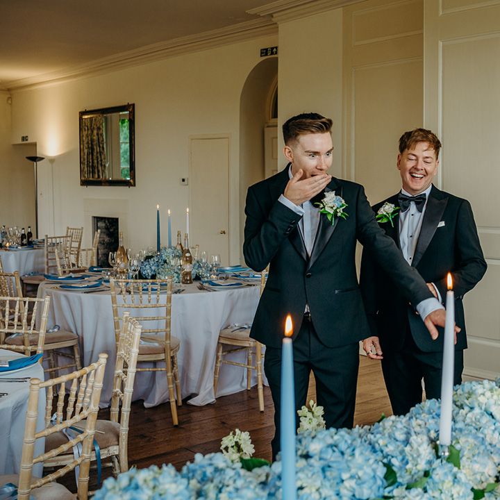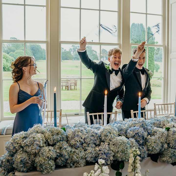 Read this real wedding filled with blue hydrangea styling, family reunions, a harpist, fireworks, and a surprise drag queen performance! It's pure joy from start to finish.