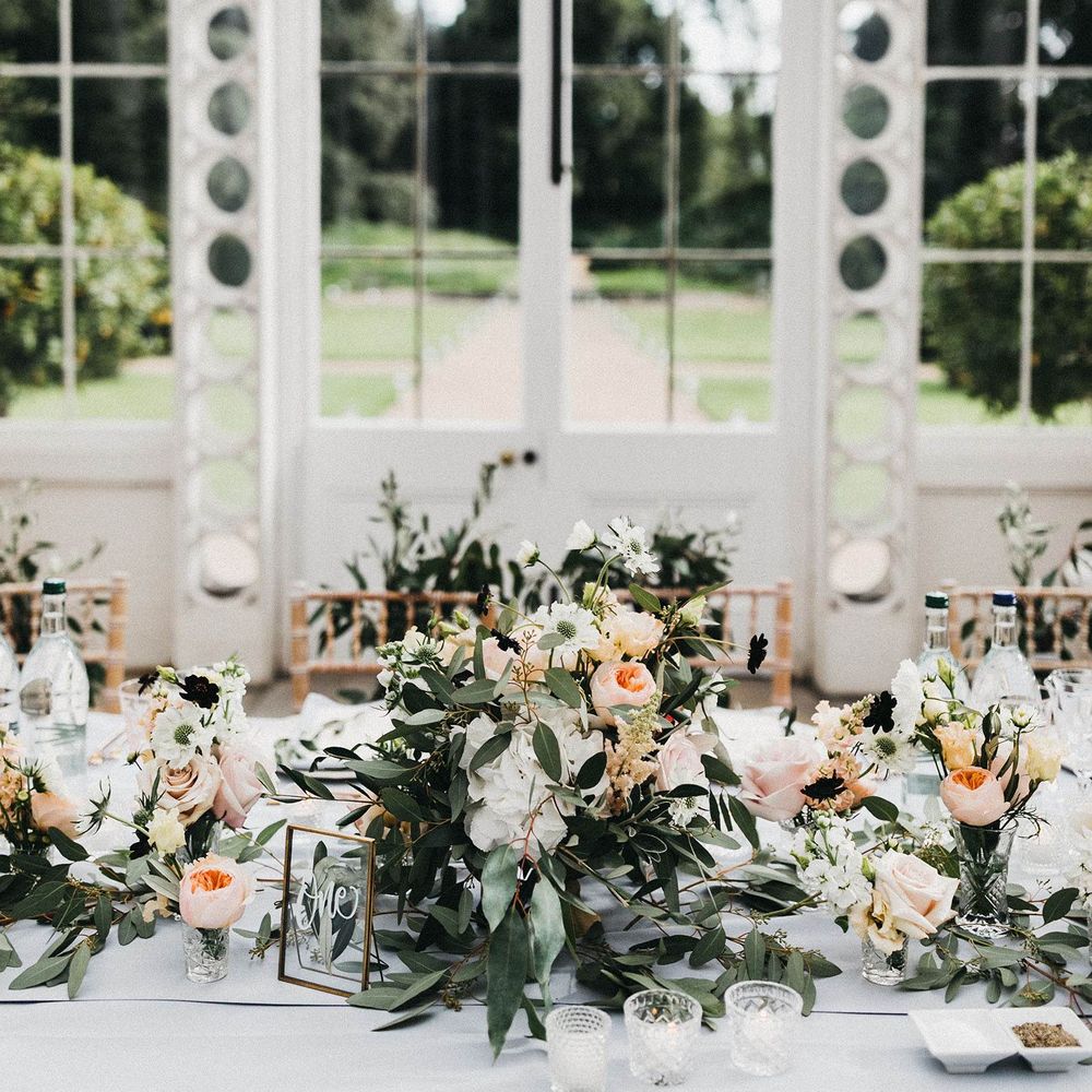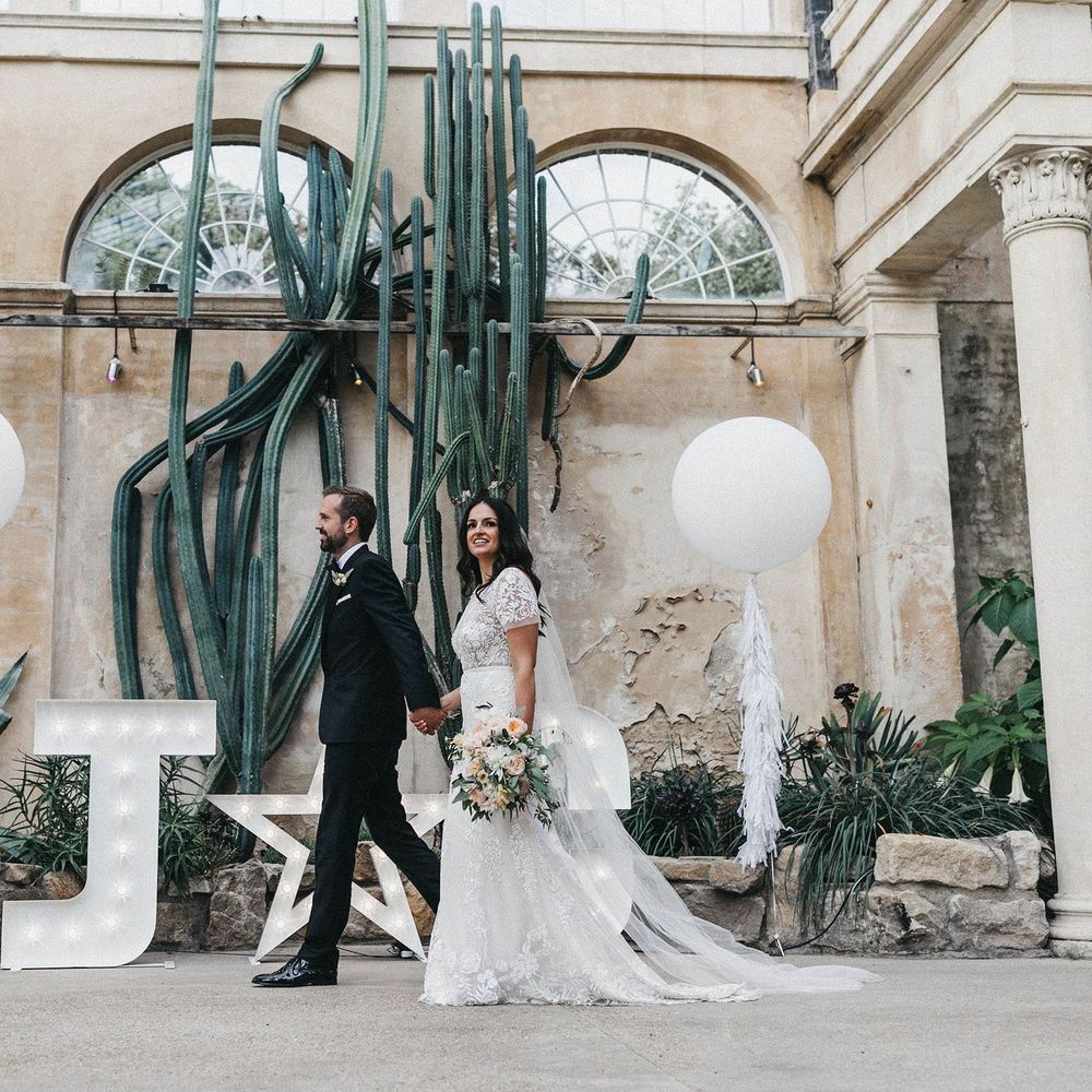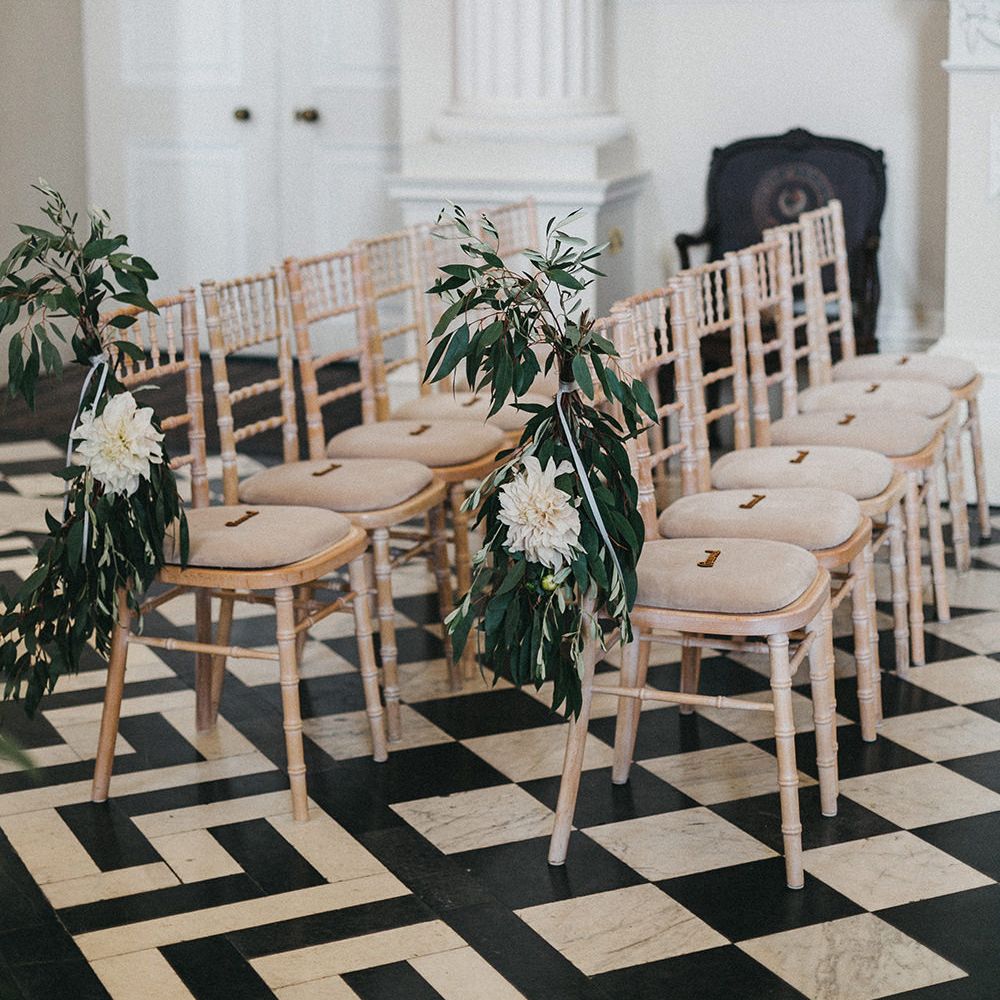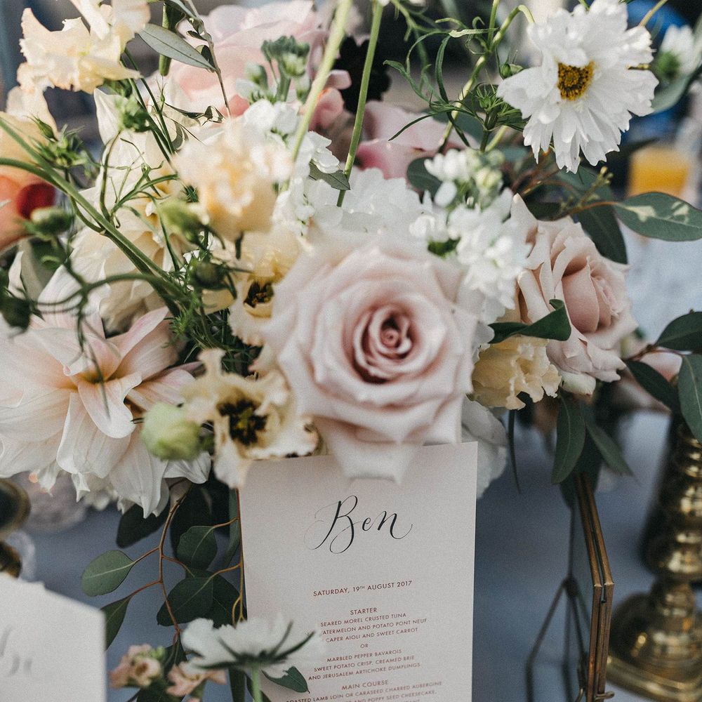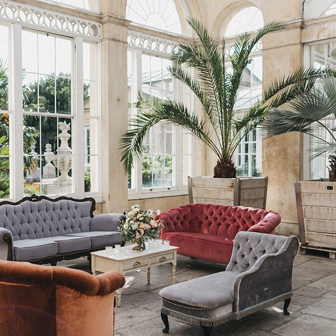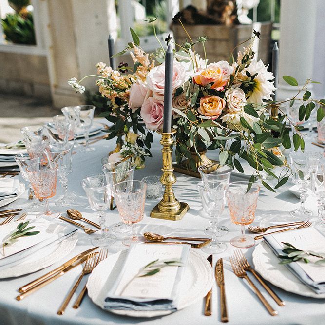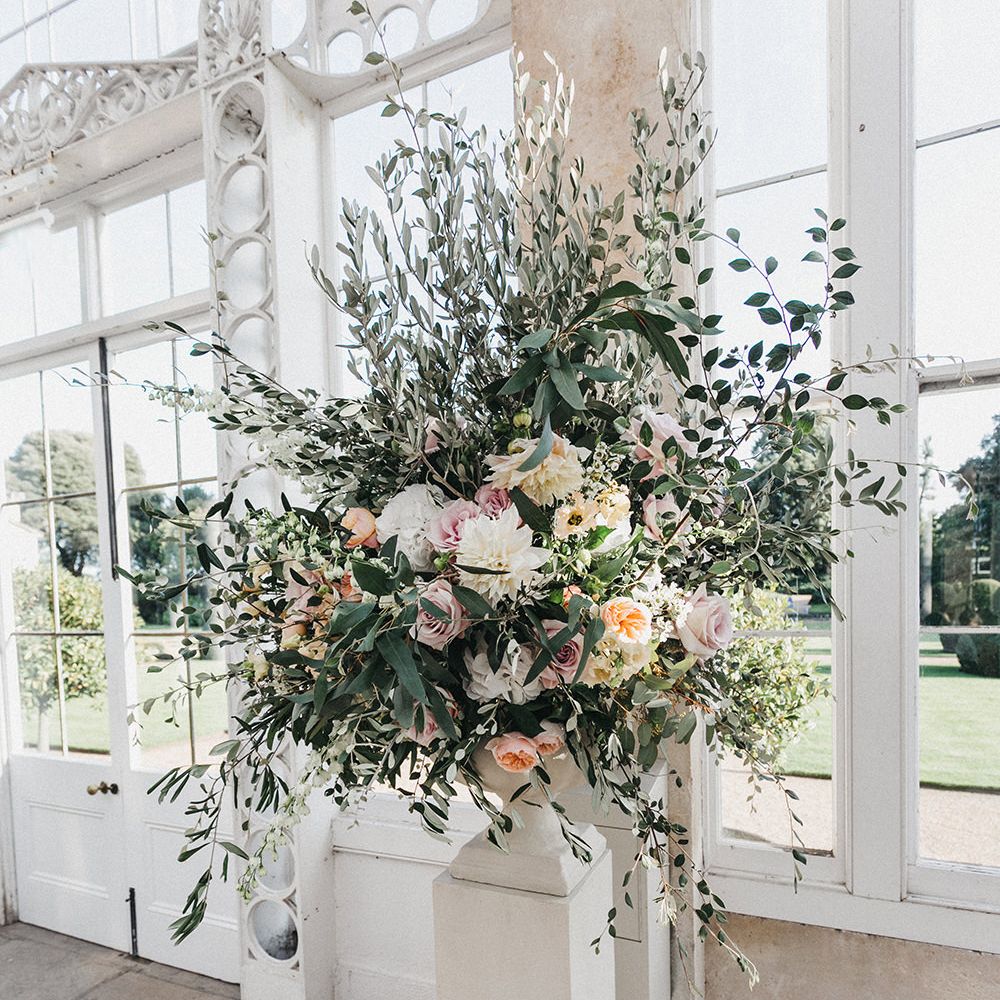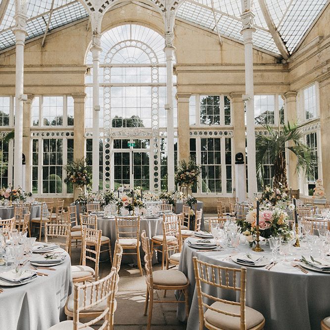 Our loose theme was 'boho luxe botanical', based around the colours of blush, gold and grey, with lots of greenery. We hired gold cutlery, glasses and plates from Duchess & Butler, and created a lounge area with vintage furniture from Vintage Style Hire and The Prop Factory, who also provided giant light-up letters which were later moved to the dancefloor. I love flowers and knew this would make a huge difference to the overall styling of Syon Park, and gave our florist - Vic of Scarlet & Violet - a brief of elegant bohemian flowers in blush, cream and peach plus greenery. We chose Café au Lait dahlias, a variety of David Austin roses, hydrangeas, delphinium and cosmos, alongside eucalyptus and olive. I was blown away by the flowers on the day, which exceeded all my expectations.