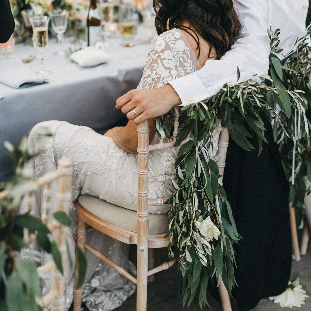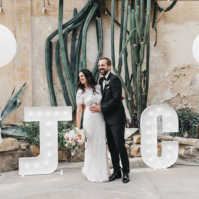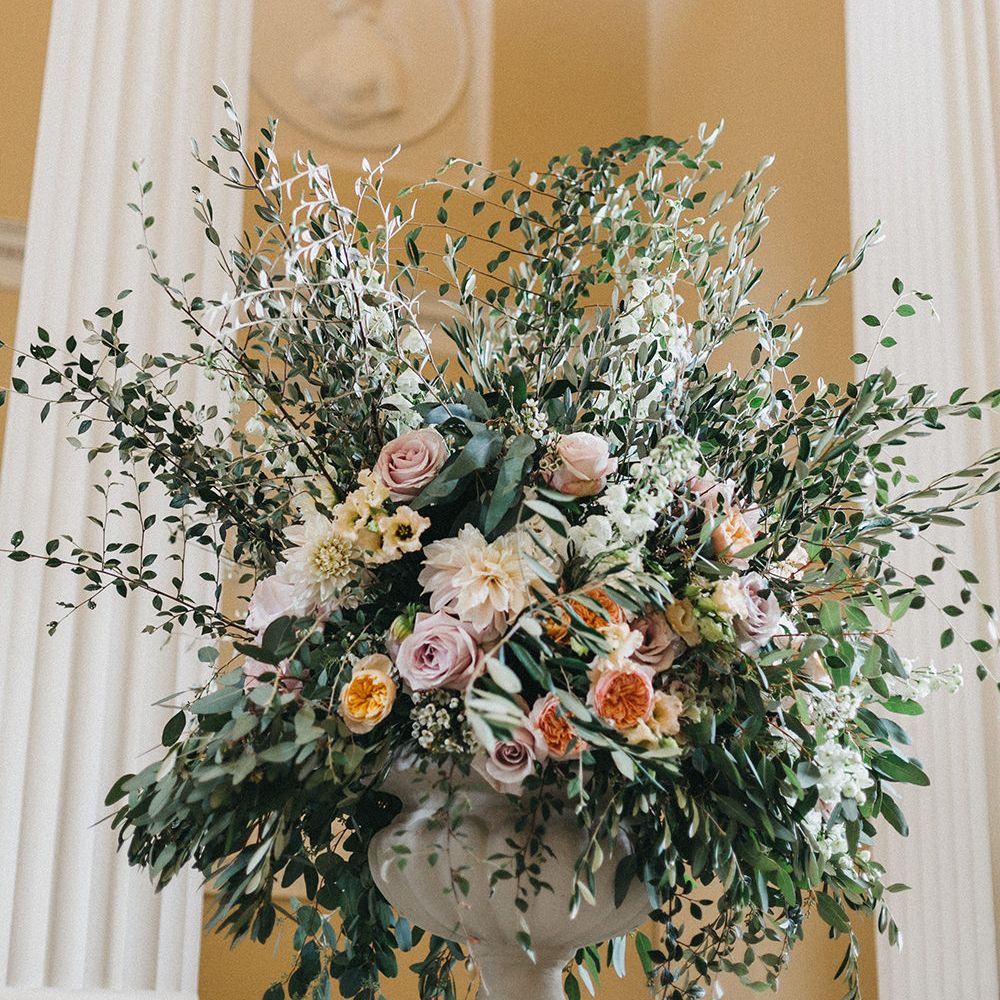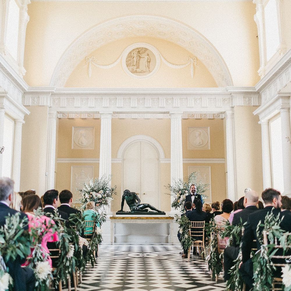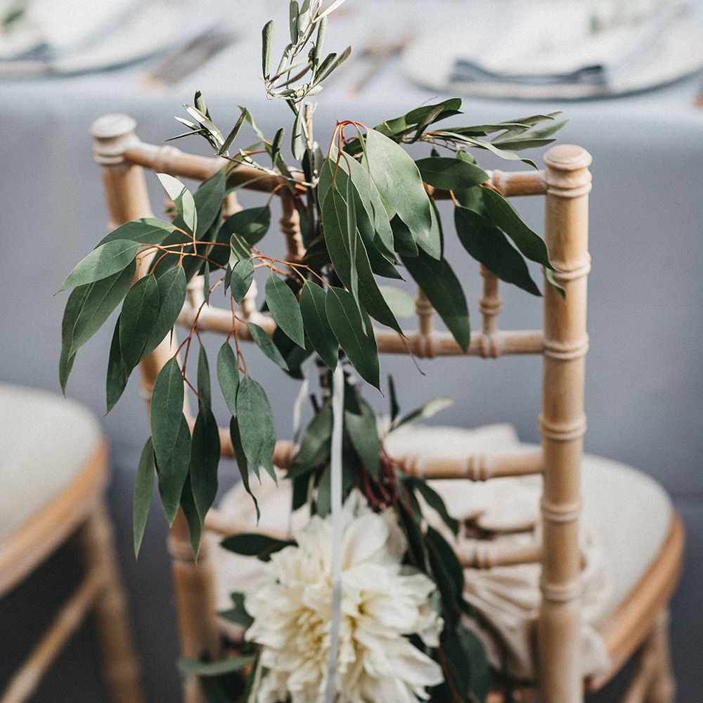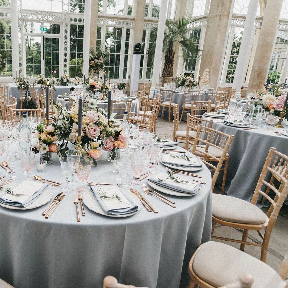 Our loose theme was 'boho luxe botanical', based around the colours of blush, gold and grey, with lots of greenery. We hired gold cutlery, glasses and plates from Duchess & Butler, and created a lounge area with vintage furniture from Vintage Style Hire and The Prop Factory, who also provided giant light-up letters which were later moved to the dancefloor. I love flowers and knew this would make a huge difference to the overall styling of Syon Park, and gave our florist - Vic of Scarlet & Violet - a brief of elegant bohemian flowers in blush, cream and peach plus greenery. We chose Café au Lait dahlias, a variety of David Austin roses, hydrangeas, delphinium and cosmos, alongside eucalyptus and olive. I was blown away by the flowers on the day, which exceeded all my expectations.