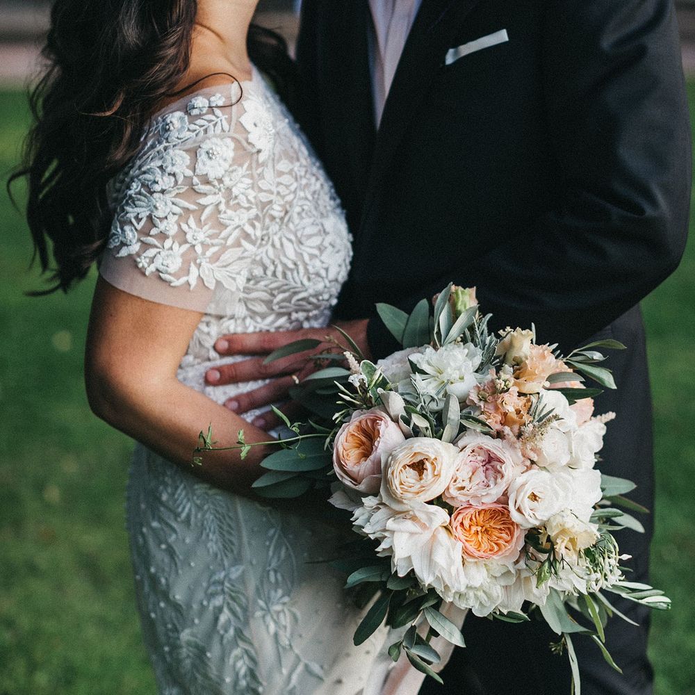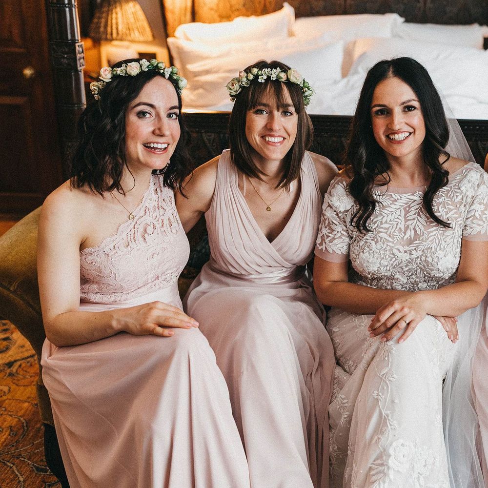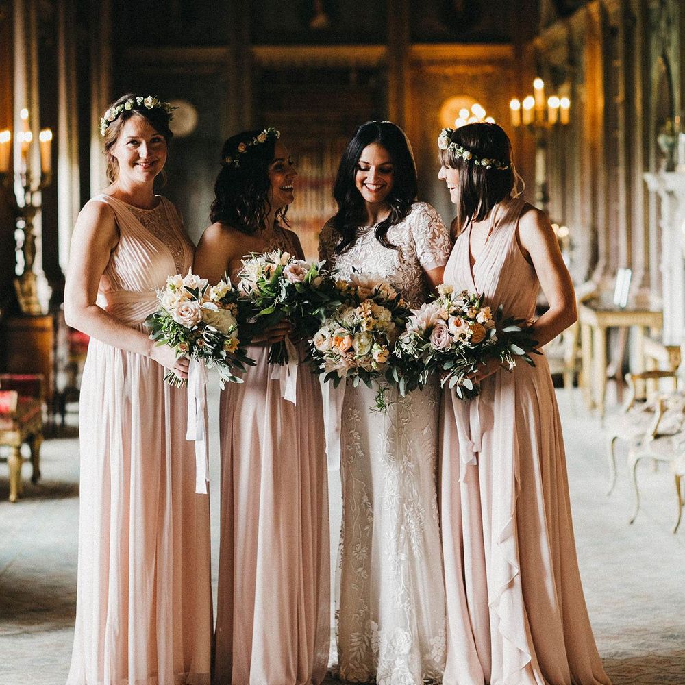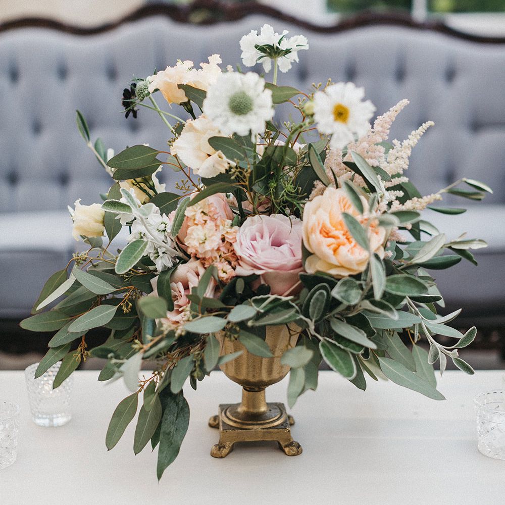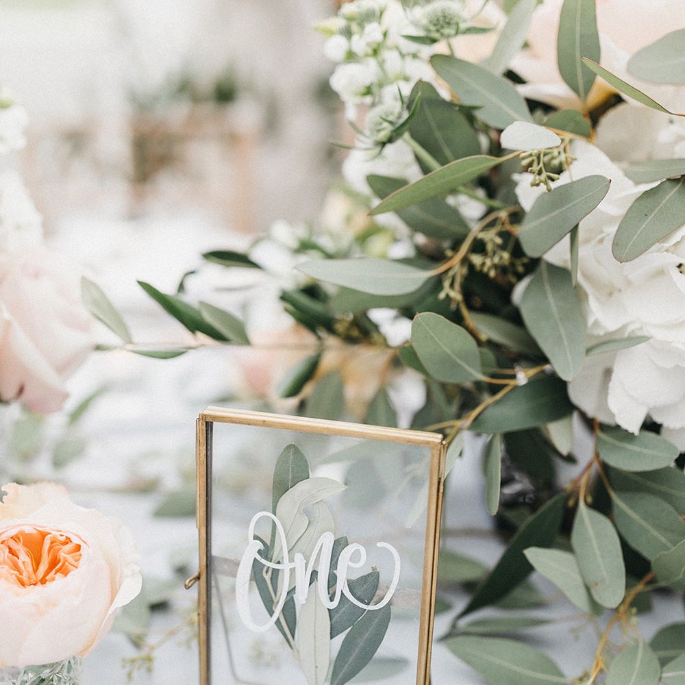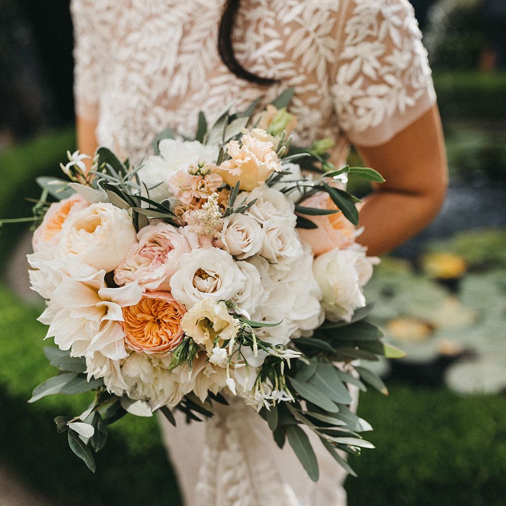 Our loose theme was 'boho luxe botanical', based around the colours of blush, gold and grey, with lots of greenery. We hired gold cutlery, glasses and plates from Duchess & Butler, and created a lounge area with vintage furniture from Vintage Style Hire and The Prop Factory, who also provided giant light-up letters which were later moved to the dancefloor. I love flowers and knew this would make a huge difference to the overall styling of Syon Park, and gave our florist - Vic of Scarlet & Violet - a brief of elegant bohemian flowers in blush, cream and peach plus greenery. We chose Café au Lait dahlias, a variety of David Austin roses, hydrangeas, delphinium and cosmos, alongside eucalyptus and olive. I was blown away by the flowers on the day, which exceeded all my expectations.