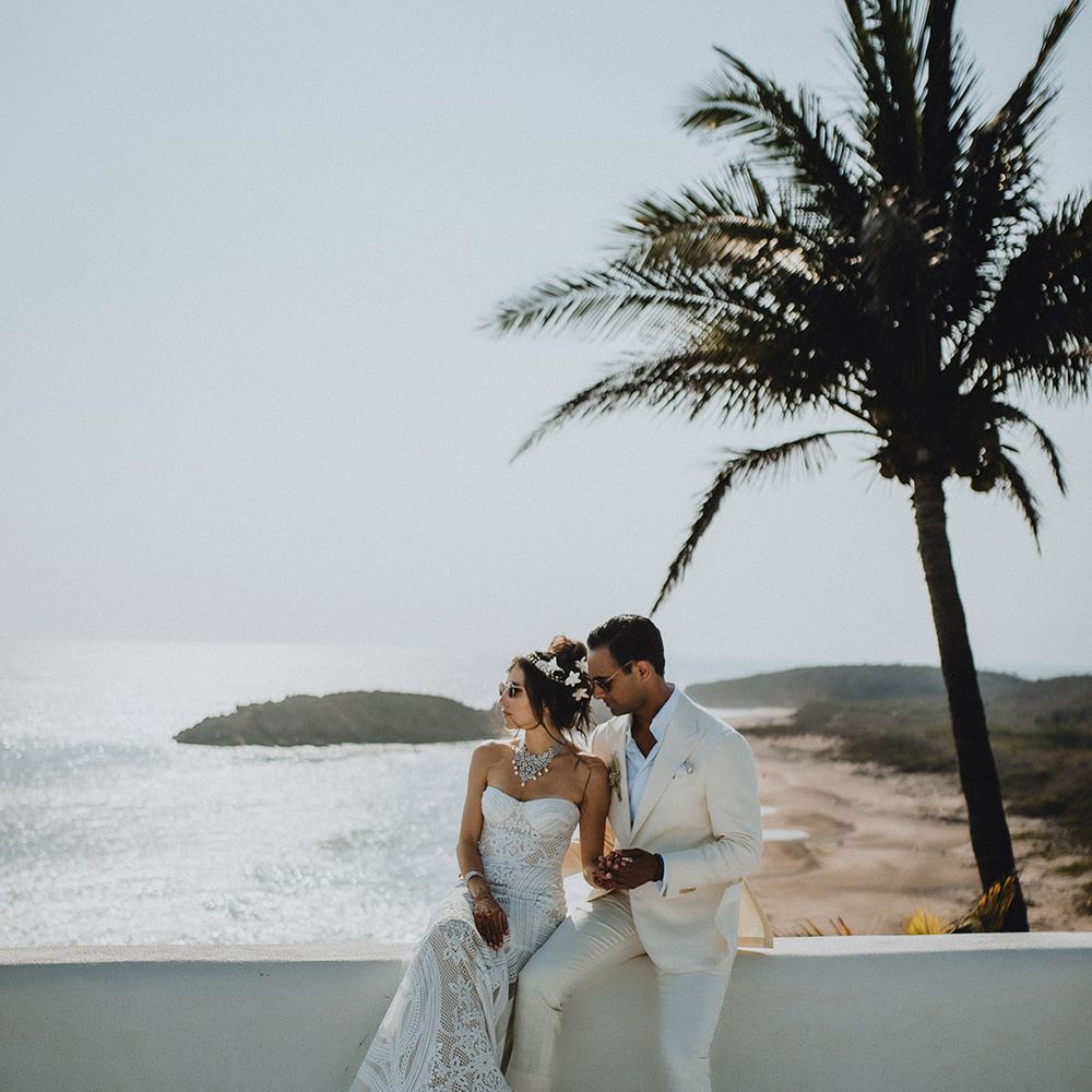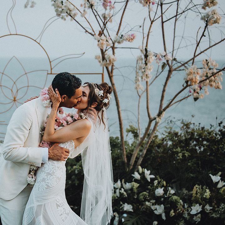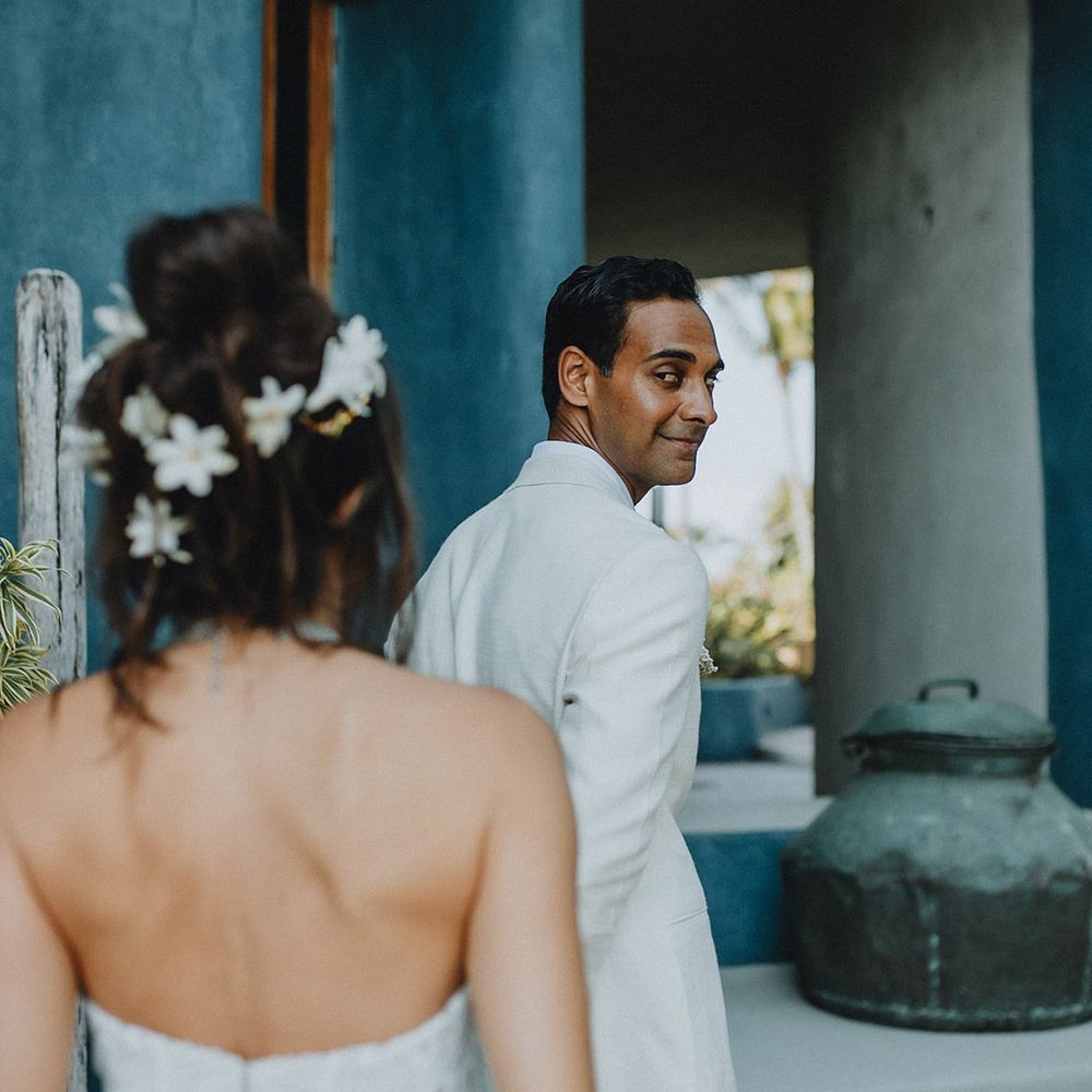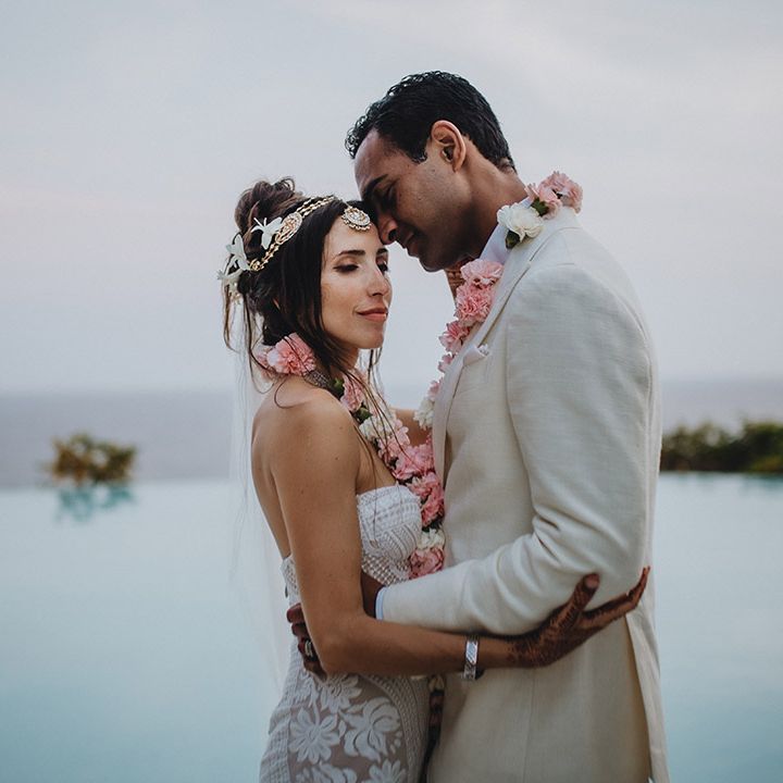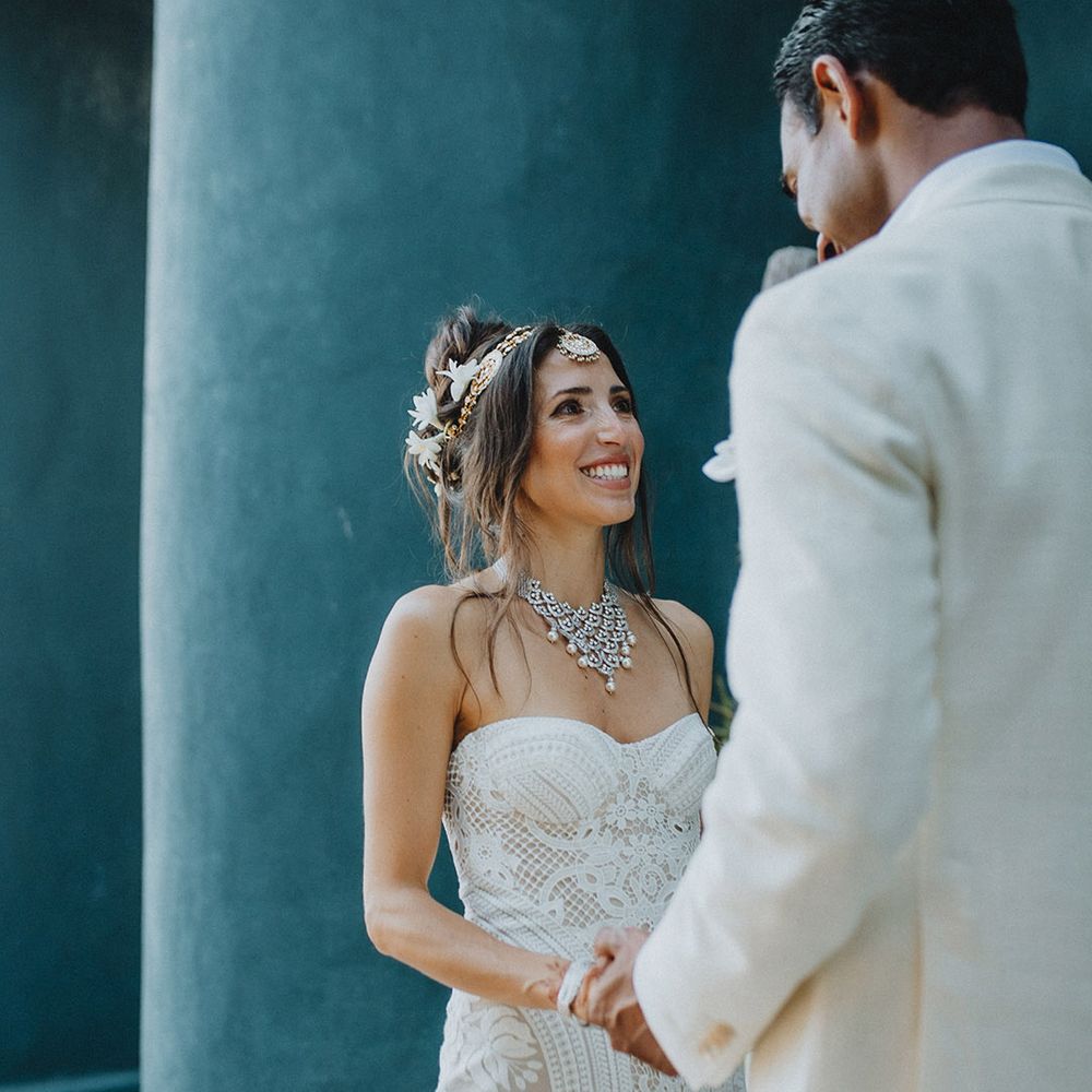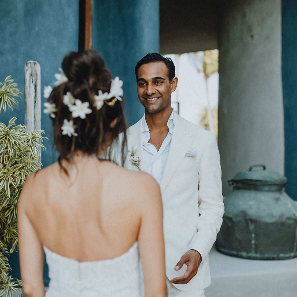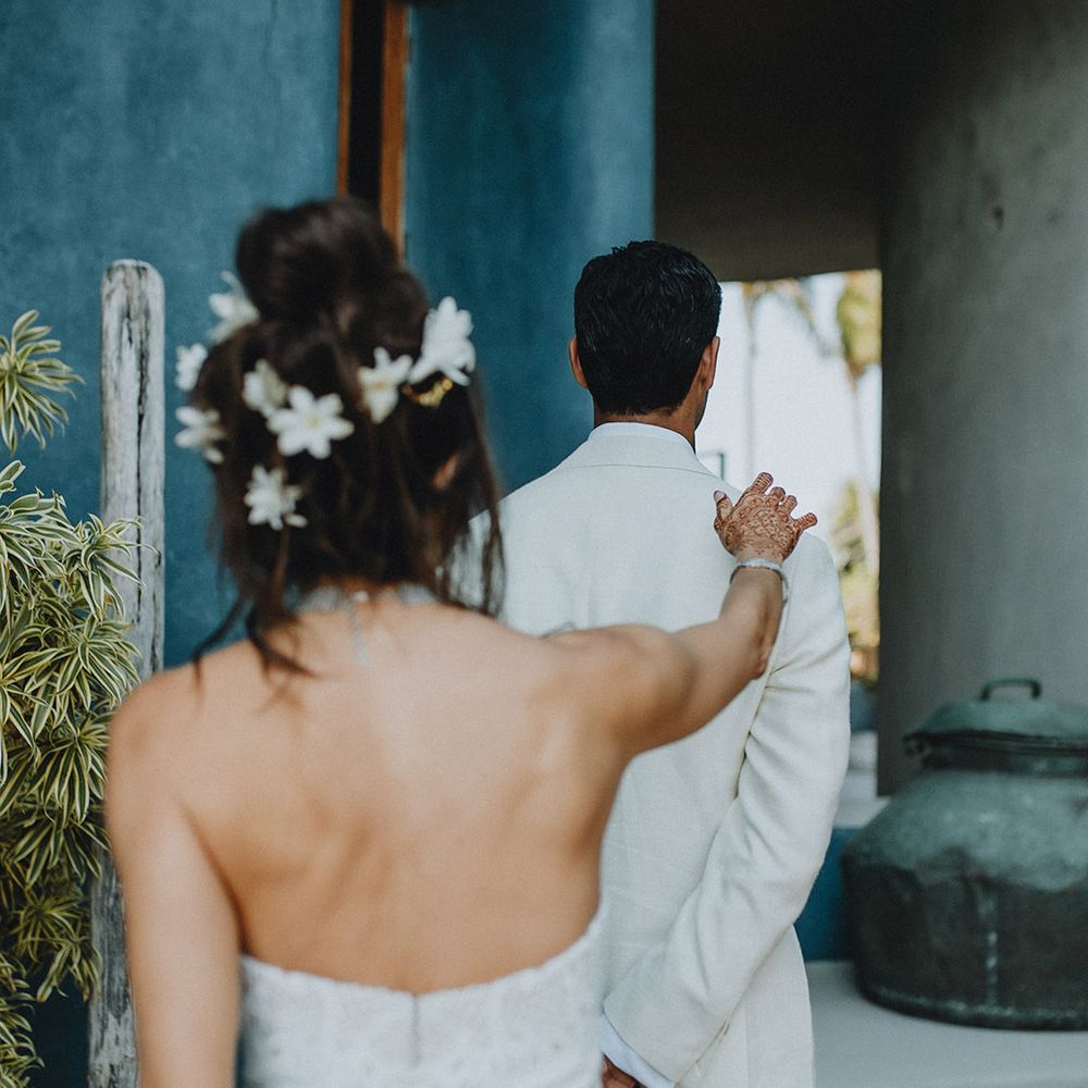 Tigre Del Mar was the perfect backdrop for Marlene & Samarth’s wedding. Based in Mexico, its unique blue and white architecture has nods to Santorini while matching the ocean views provided by the location. The decor featured soft and delicate pastels with macrame and disco ball decor, adding to the laid-back and free-spirited vibes of Tigre Del Mar. Marlene wore a bohemian lace wedding dress and paired it with flower hair accessories and a traditional matha patti. During the ceremony, the couple exchanged pink varmalas, a Hindu wedding tradition symbolising love, respect and commitment. We adore the addition of this tradition and think the pink flower garlands made Marlene & Samarth's outfits better than they already were (if that’s even possible). The couple exchanged their own vows with a handfasting ceremony, and there was not a dry eye in the house. They also chose to do some first-look photographs. These are a great way to ease any nerves and spend a quiet moment together before your big day!