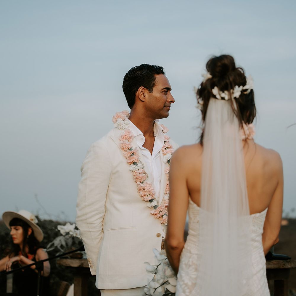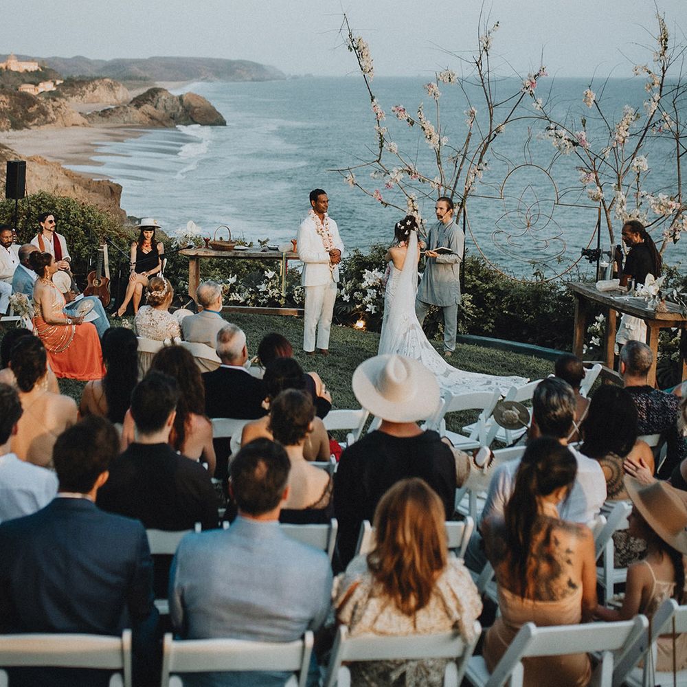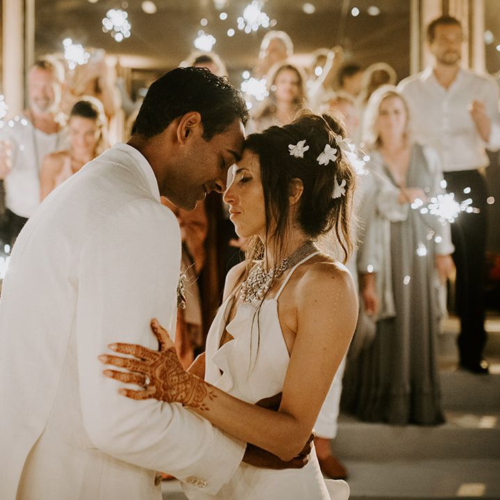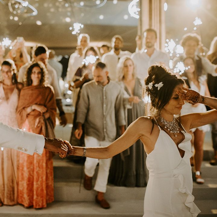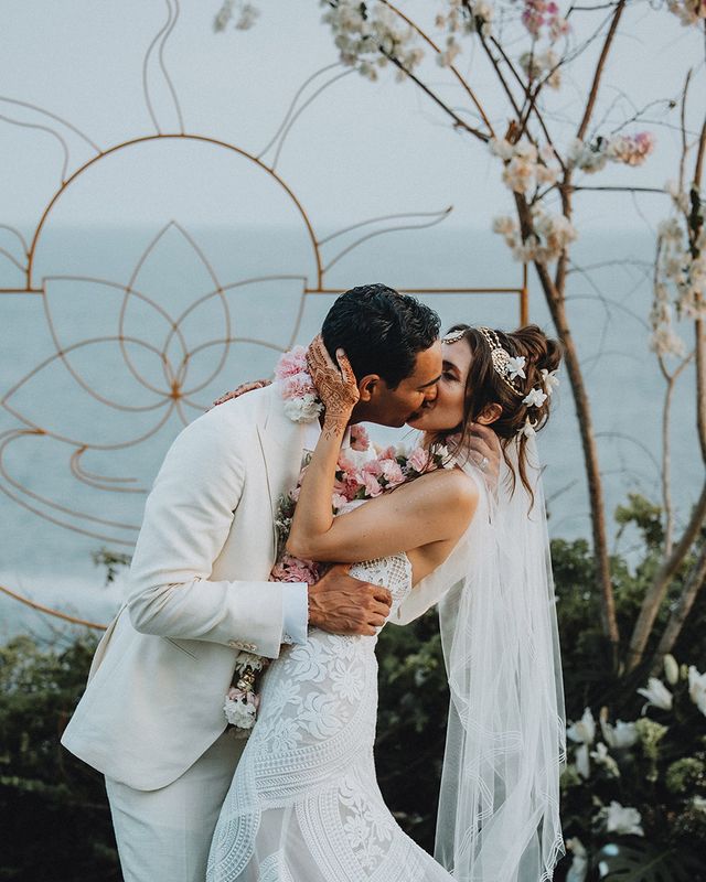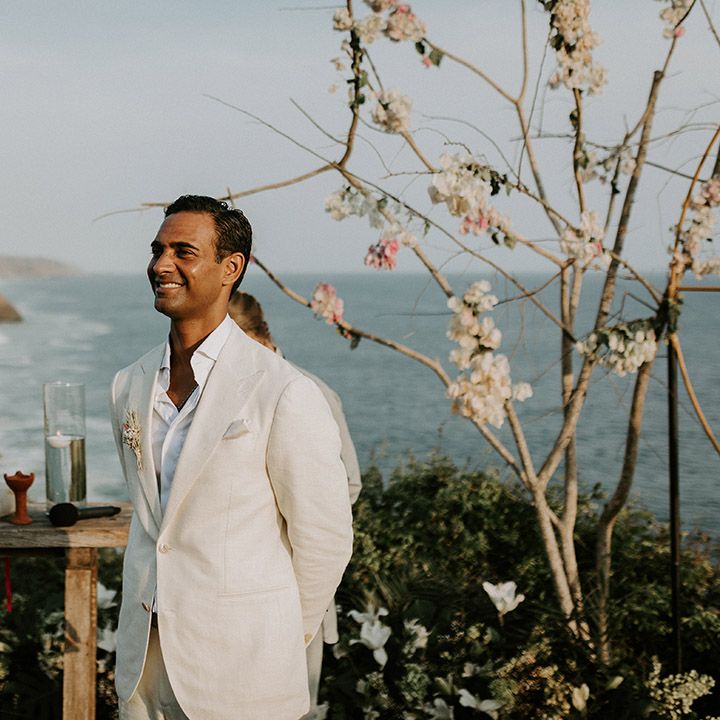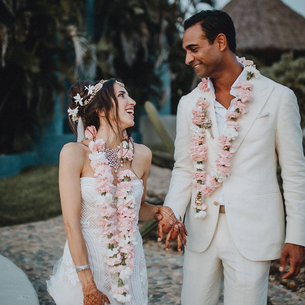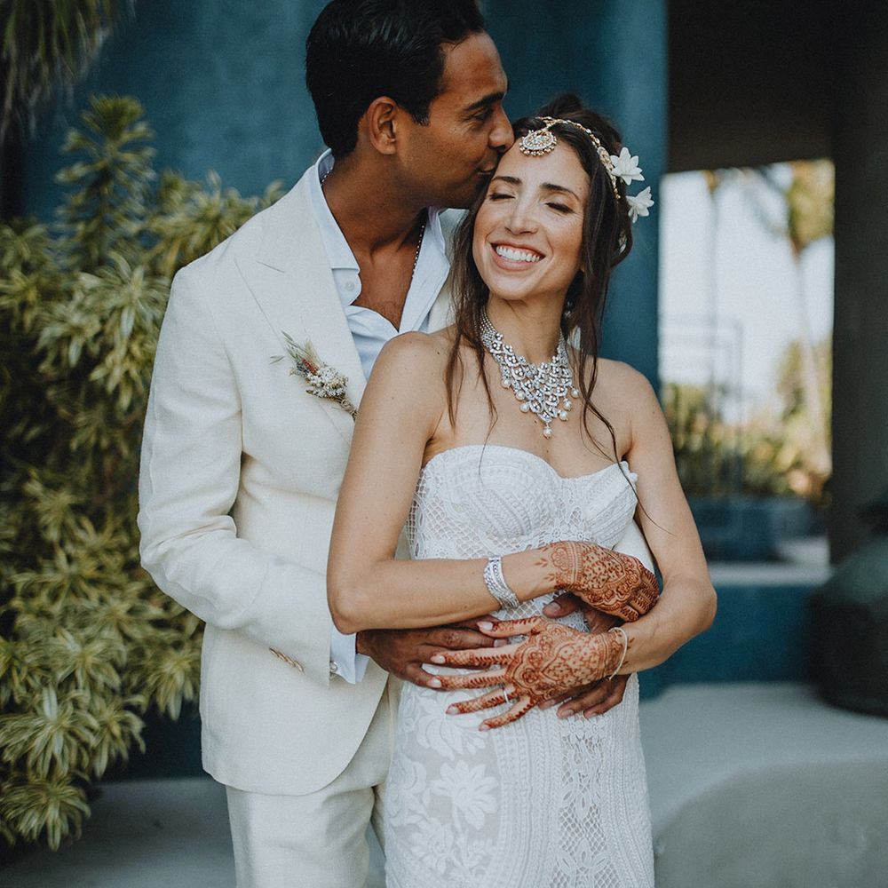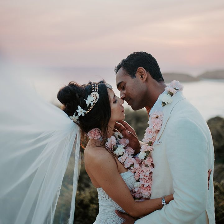 Tigre Del Mar was the perfect backdrop for Marlene & Samarth’s wedding. Based in Mexico, its unique blue and white architecture has nods to Santorini while matching the ocean views provided by the location. The decor featured soft and delicate pastels with macrame and disco ball decor, adding to the laid-back and free-spirited vibes of Tigre Del Mar. Marlene wore a bohemian lace wedding dress and paired it with flower hair accessories and a traditional matha patti. During the ceremony, the couple exchanged pink varmalas, a Hindu wedding tradition symbolising love, respect and commitment. We adore the addition of this tradition and think the pink flower garlands made Marlene & Samarth's outfits better than they already were (if that’s even possible). The couple exchanged their own vows with a handfasting ceremony, and there was not a dry eye in the house. They also chose to do some first-look photographs. These are a great way to ease any nerves and spend a quiet moment together before your big day!