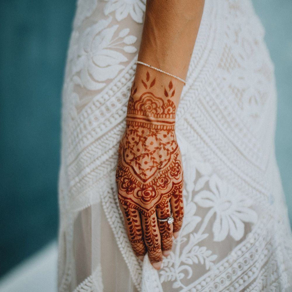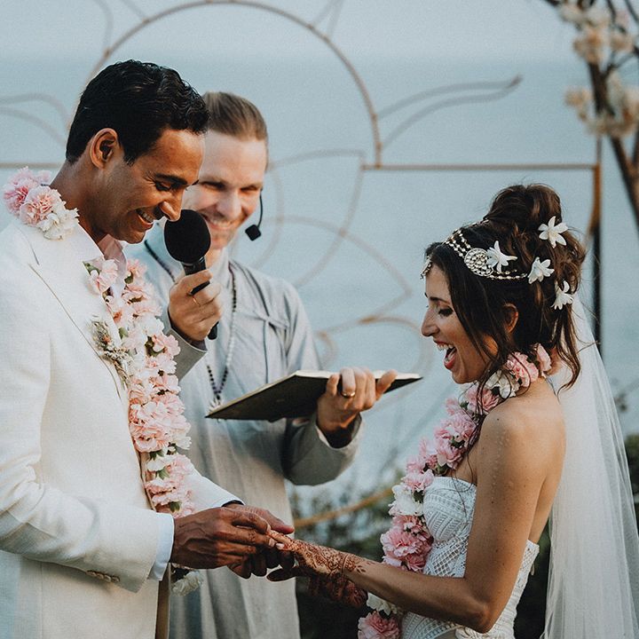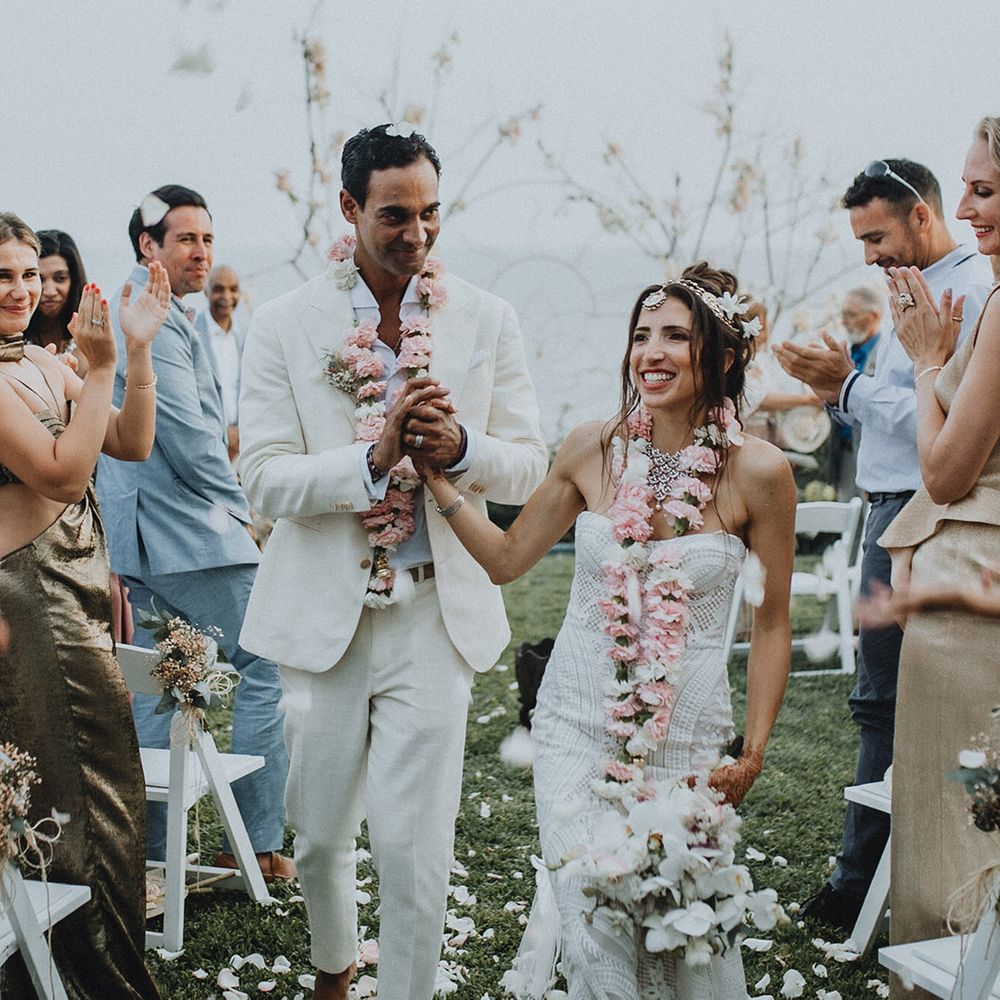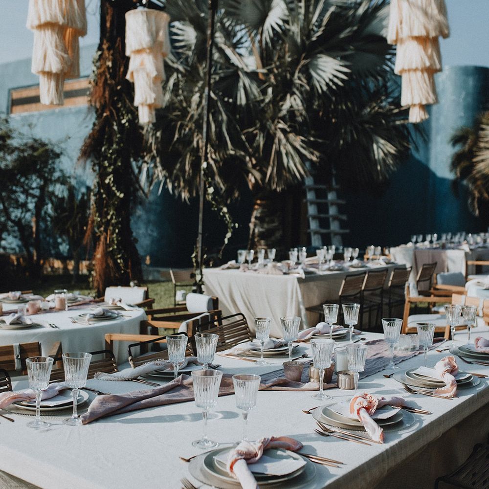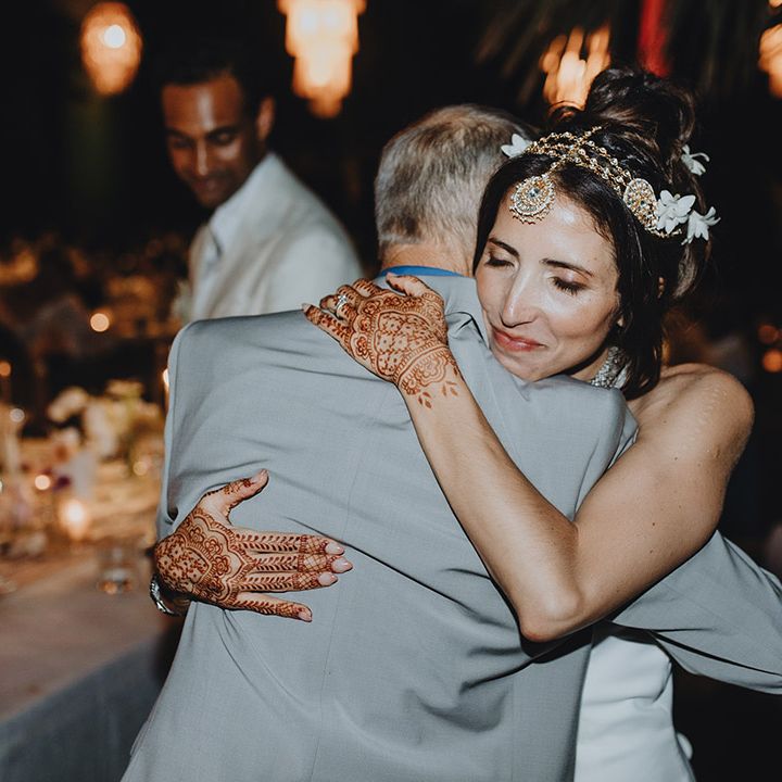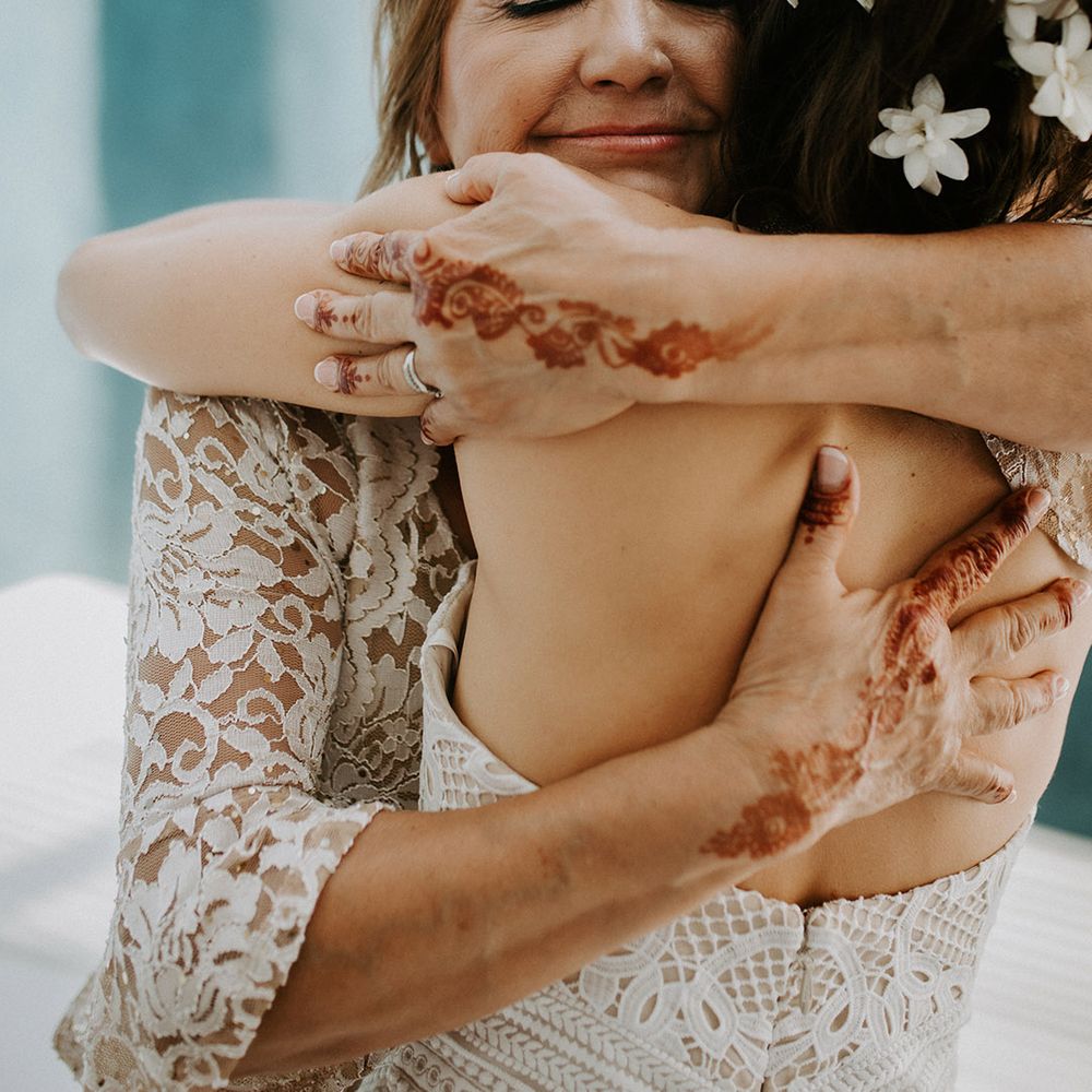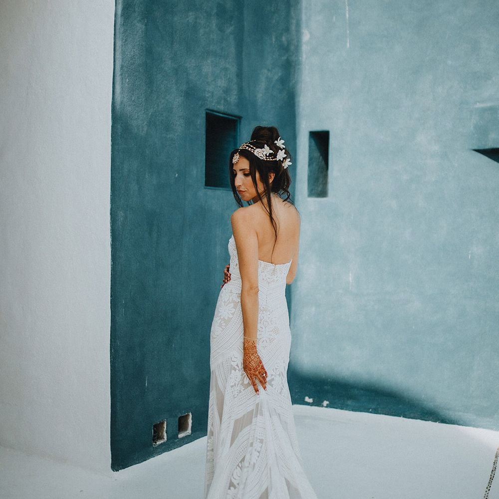 Tigre Del Mar was the perfect backdrop for Marlene & Samarth’s wedding. Based in Mexico, its unique blue and white architecture has nods to Santorini while matching the ocean views provided by the location. The decor featured soft and delicate pastels with macrame and disco ball decor, adding to the laid-back and free-spirited vibes of Tigre Del Mar. Marlene wore a bohemian lace wedding dress and paired it with flower hair accessories and a traditional matha patti. During the ceremony, the couple exchanged pink varmalas, a Hindu wedding tradition symbolising love, respect and commitment. We adore the addition of this tradition and think the pink flower garlands made Marlene & Samarth's outfits better than they already were (if that’s even possible). The couple exchanged their own vows with a handfasting ceremony, and there was not a dry eye in the house. They also chose to do some first-look photographs. These are a great way to ease any nerves and spend a quiet moment together before your big day!