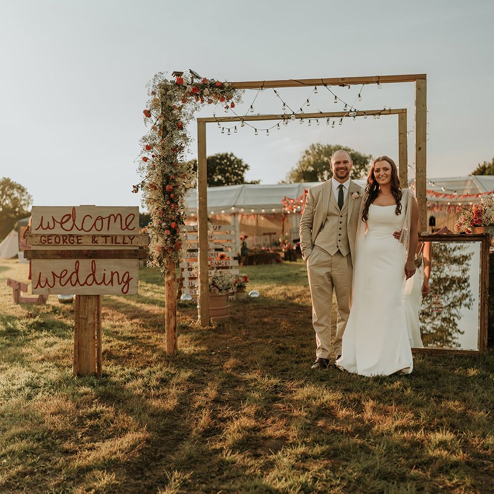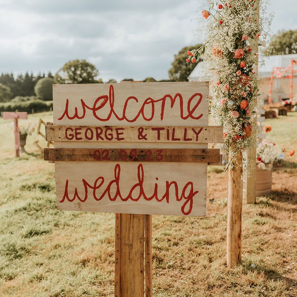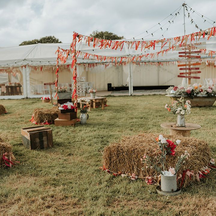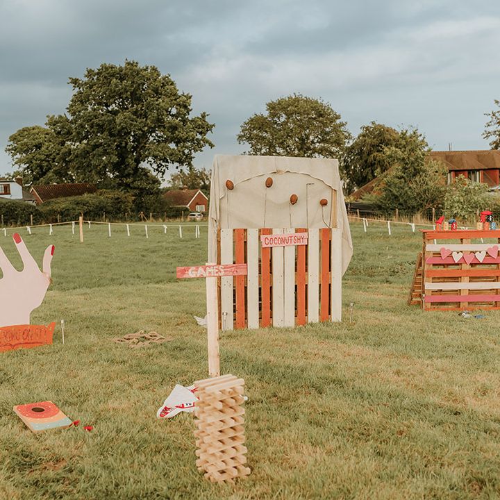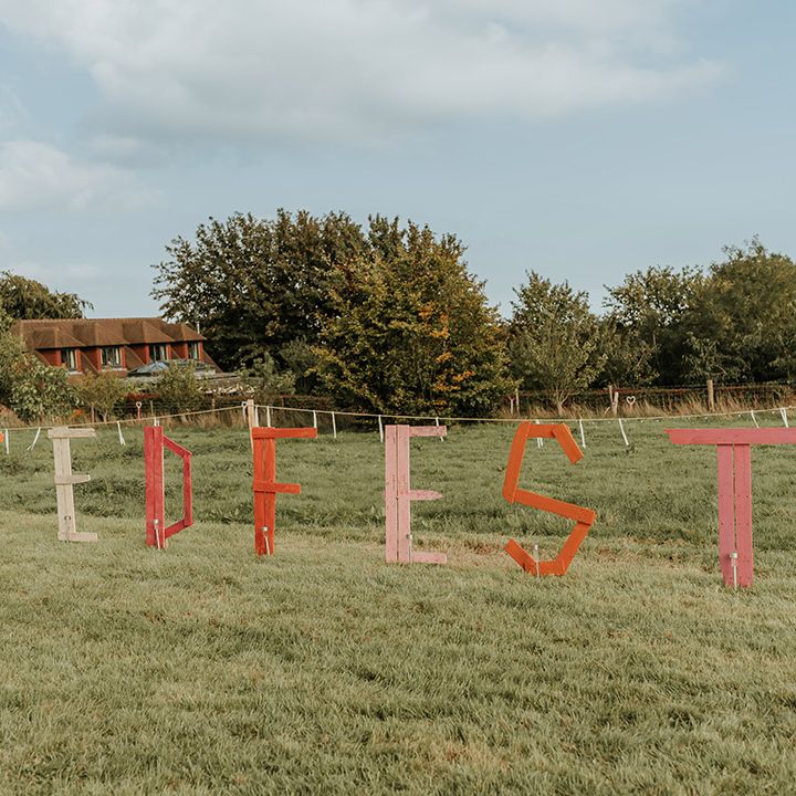 Tilly & George always knew they wanted an intimate wedding ceremony with a big party in the evening! The couple tied the knot at a registry office before heading off to George’s parent’s farm where they hosted their very own wedfest! The couple got stuck in with DIY to make everything feel authentic and unique to them. They sourced and put together all the decor with help from their family and friends, including all the carnival games! The kissing booth, coconut shy, and put a ring on it game were all handmade. The rustic signage was also all DIY! Tilly, George and their family spent many hours cutting and tying fabric to make the bunting and dance floor decor. The part we were most impressed with though, was the flowers! Tilly & George went to New Covent Garden Flower Market to buy flowers and did all the arrangements themselves. We LOVE the vision. We could look at these photos all day long…