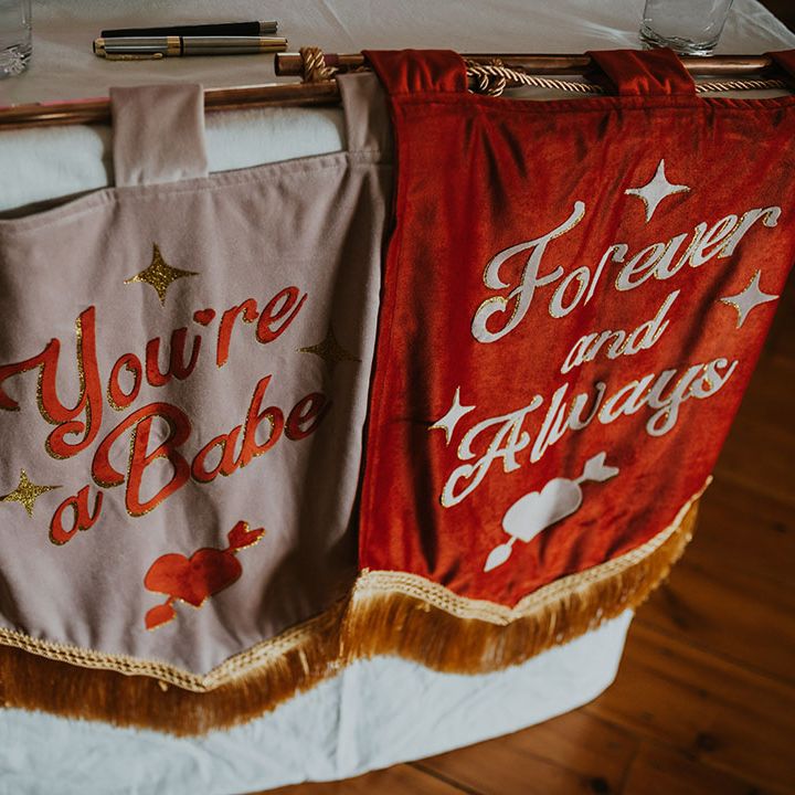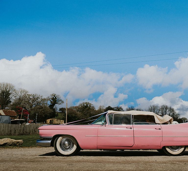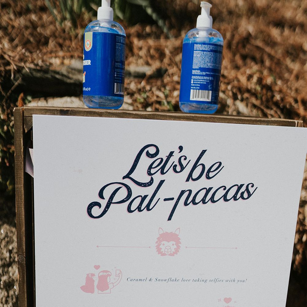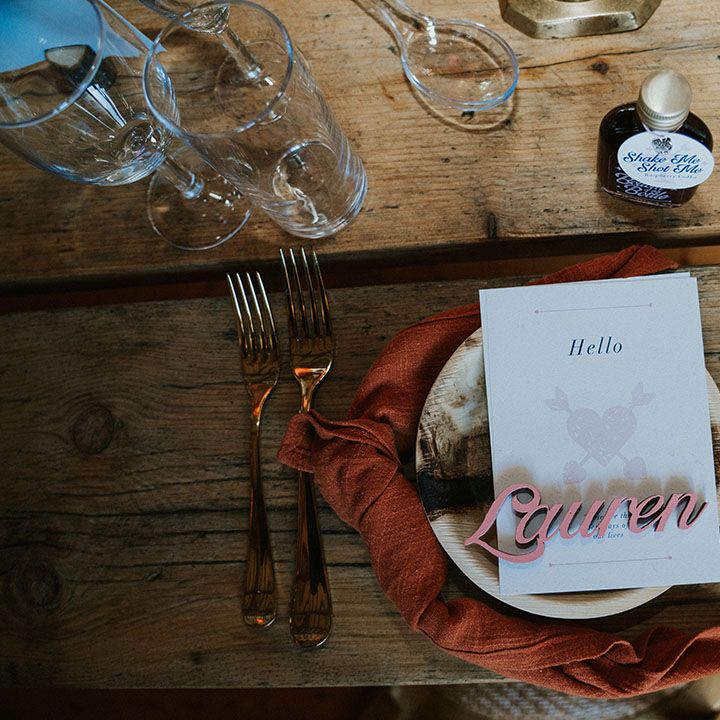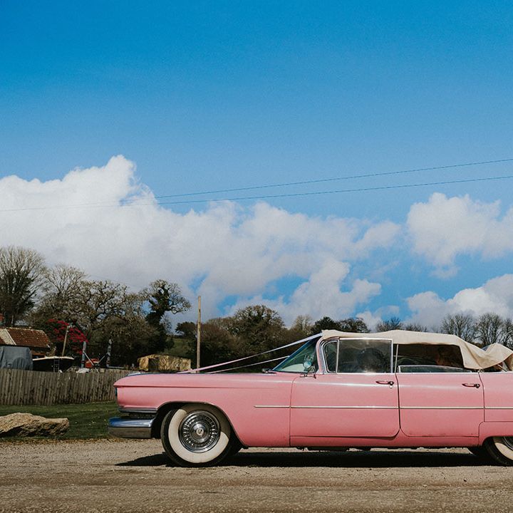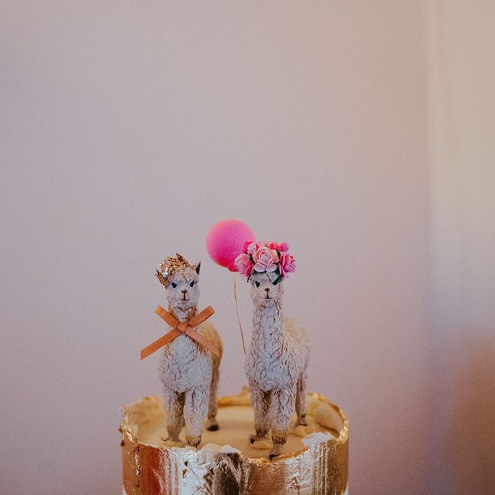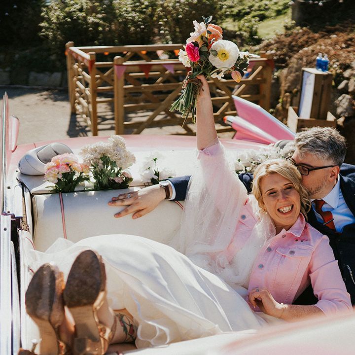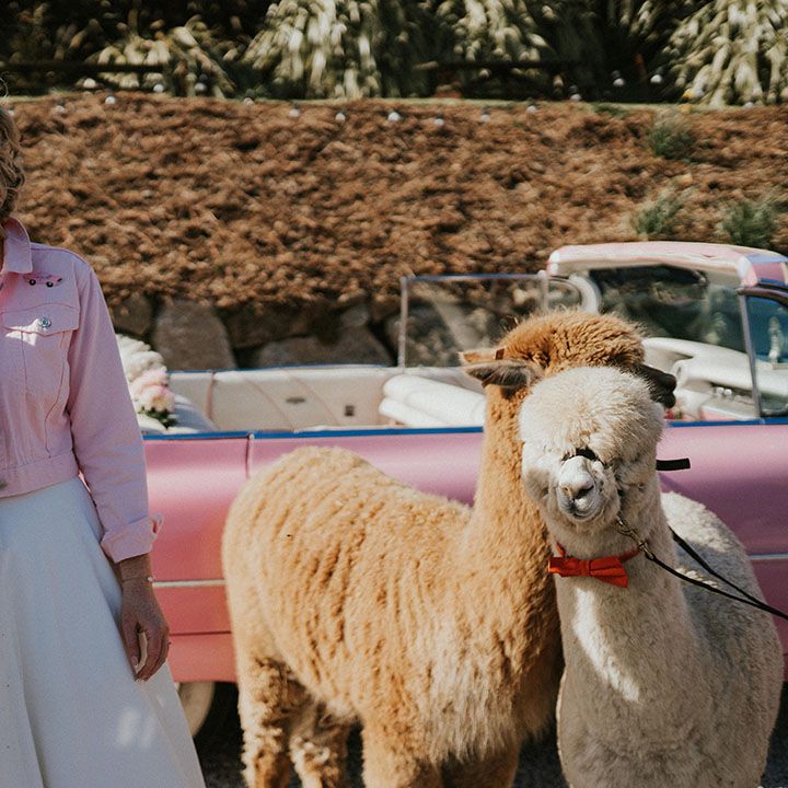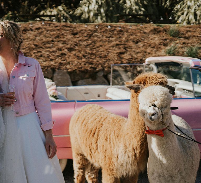 Lauren & Chris' vibe was punk rock boho. As music fans, they wanted this to be reflected in their decor including displaying their fave lyrics on banners throughout the venue, music-themed table names, favours, and a record player guest book! The party got started with a rock and noughties-themed setlist. In addition to this, Lauren's first ever words to Chris were 'You're a babe', so of course, this also played a part in their invitations and banners, which they DIY'd! Some of the couple's favourite moments include the alpacas (!), the pink Cadillac wedding car, and speeches from Lauren's mum and dad. Our personal absolute highlights of this day include Lauren's pink denim jacket cover-up and sunglasses combo, THAT dessert table and the cute alpaca cake toppers. Of course, we also love that this couple had Everything I Know About Love by Dolly Alderton as one of their wedding readings.