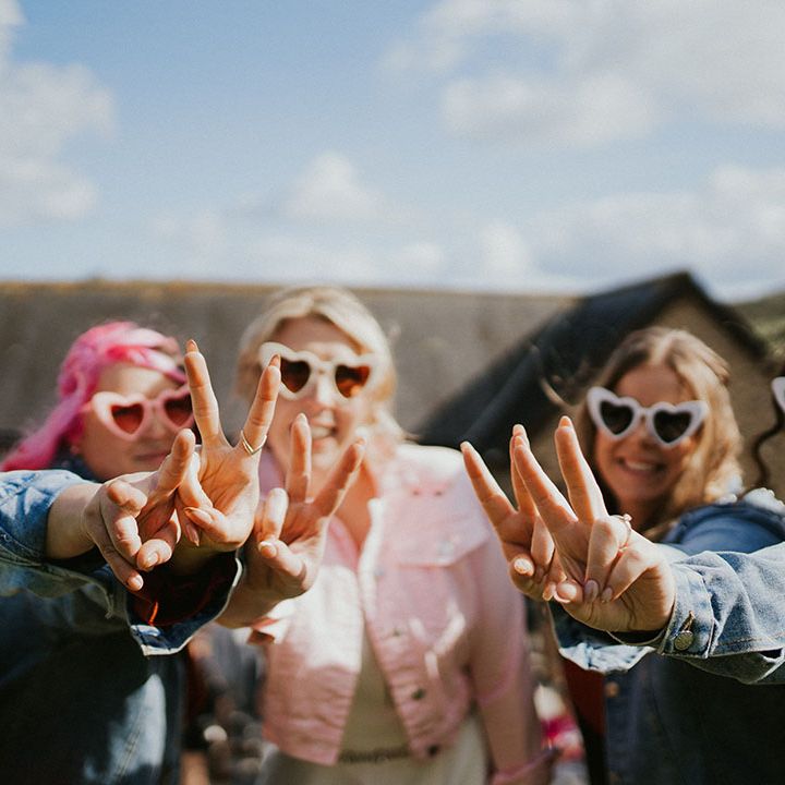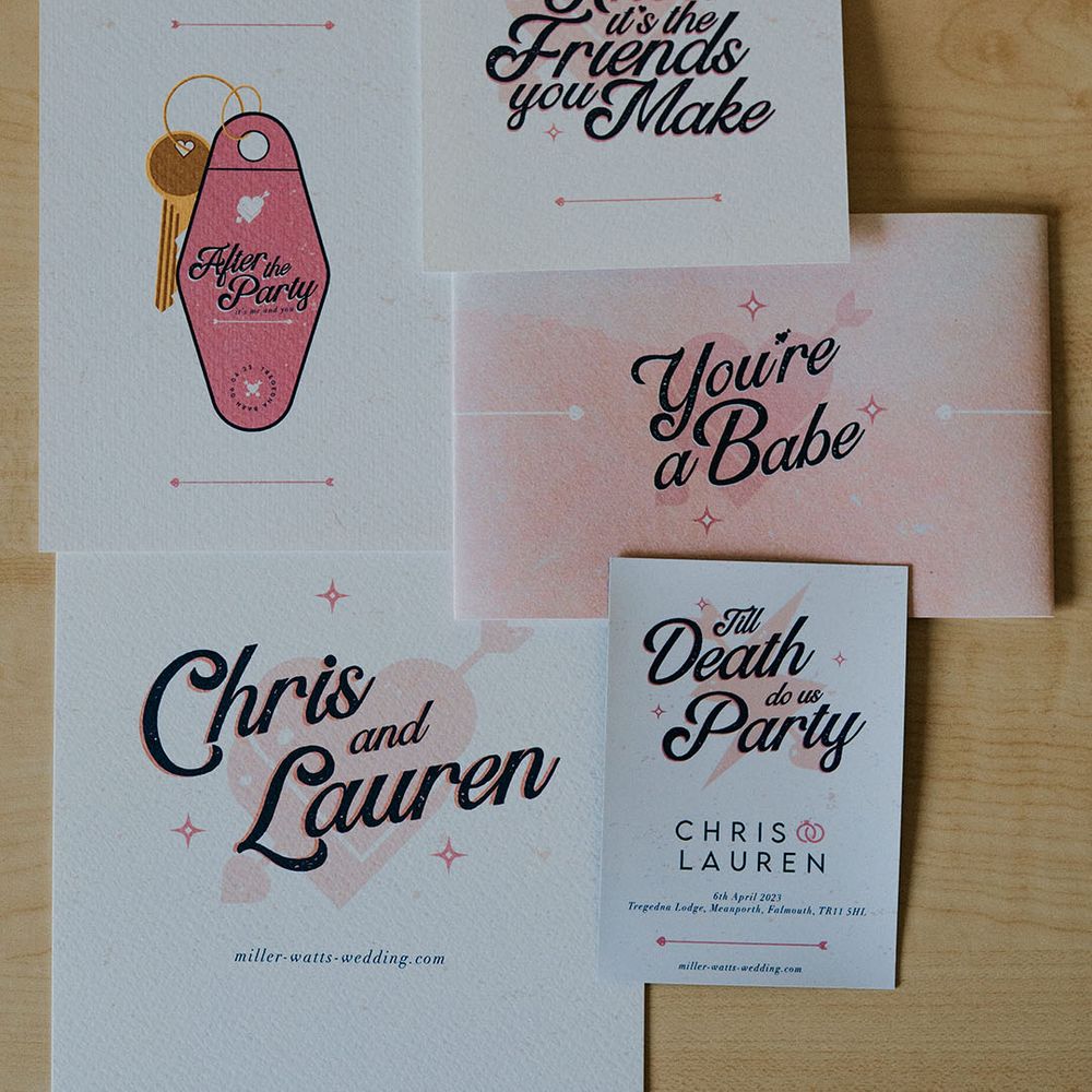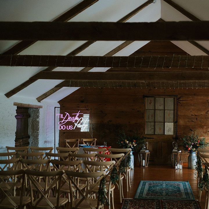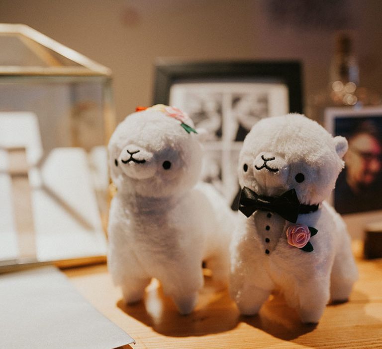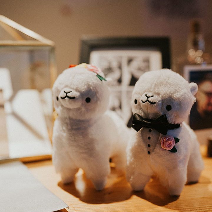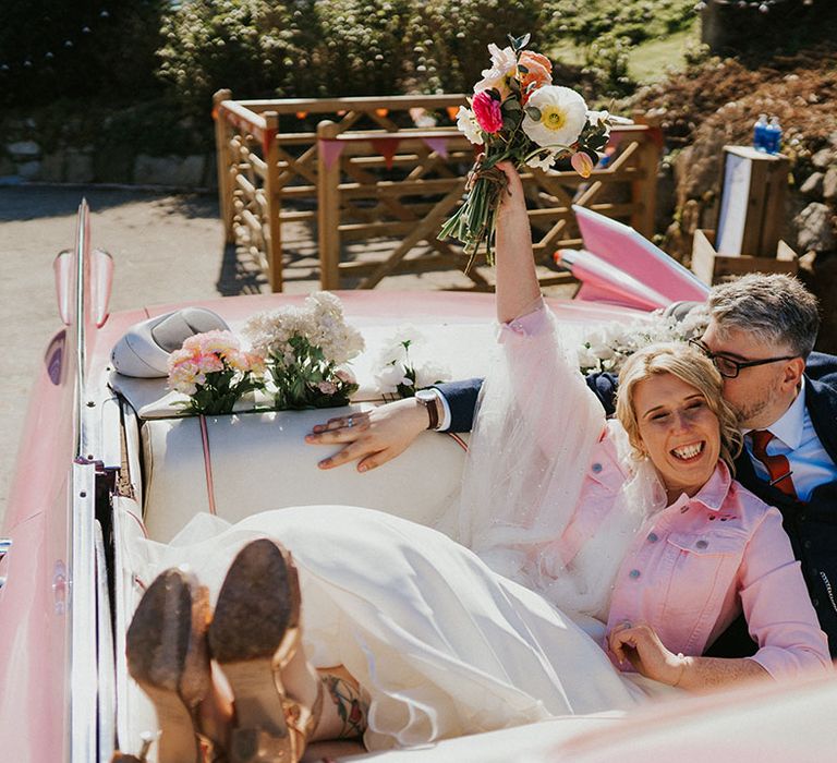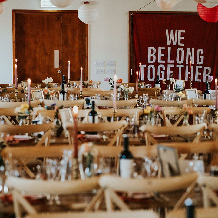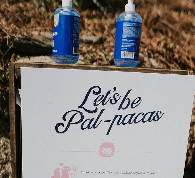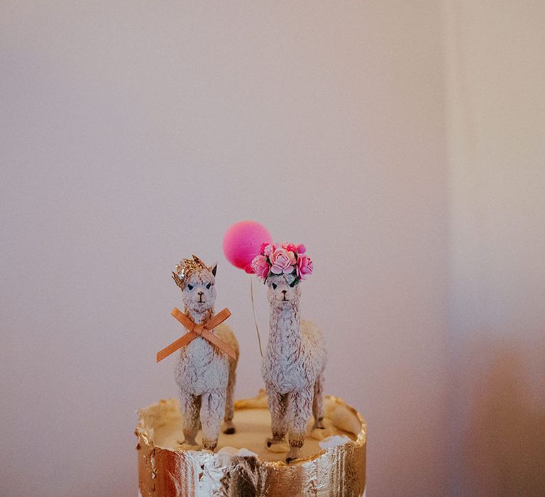 Lauren & Chris' vibe was punk rock boho. As music fans, they wanted this to be reflected in their decor including displaying their fave lyrics on banners throughout the venue, music-themed table names, favours, and a record player guest book! The party got started with a rock and noughties-themed setlist. In addition to this, Lauren's first ever words to Chris were 'You're a babe', so of course, this also played a part in their invitations and banners, which they DIY'd! Some of the couple's favourite moments include the alpacas (!), the pink Cadillac wedding car, and speeches from Lauren's mum and dad. Our personal absolute highlights of this day include Lauren's pink denim jacket cover-up and sunglasses combo, THAT dessert table and the cute alpaca cake toppers. Of course, we also love that this couple had Everything I Know About Love by Dolly Alderton as one of their wedding readings.