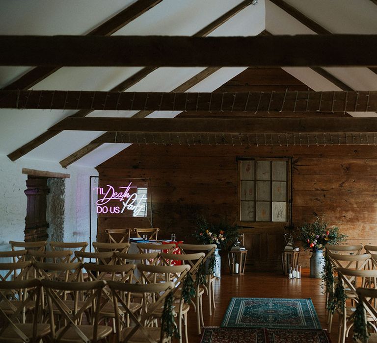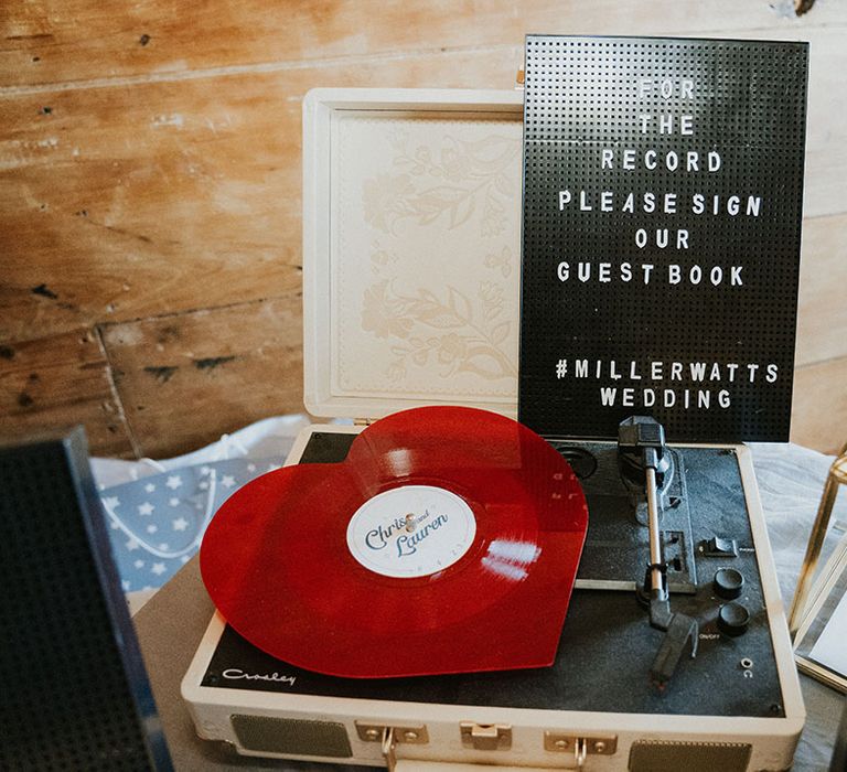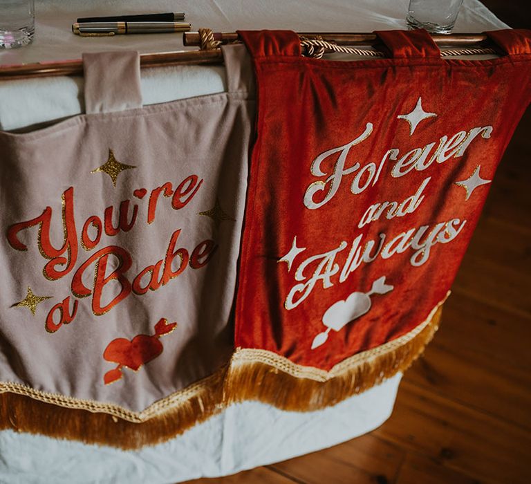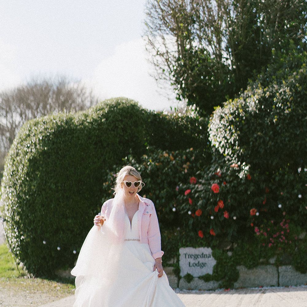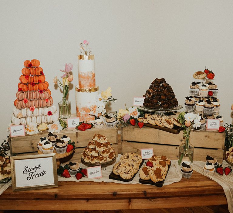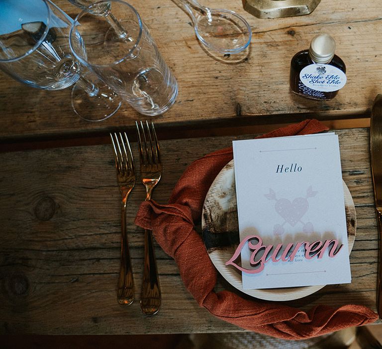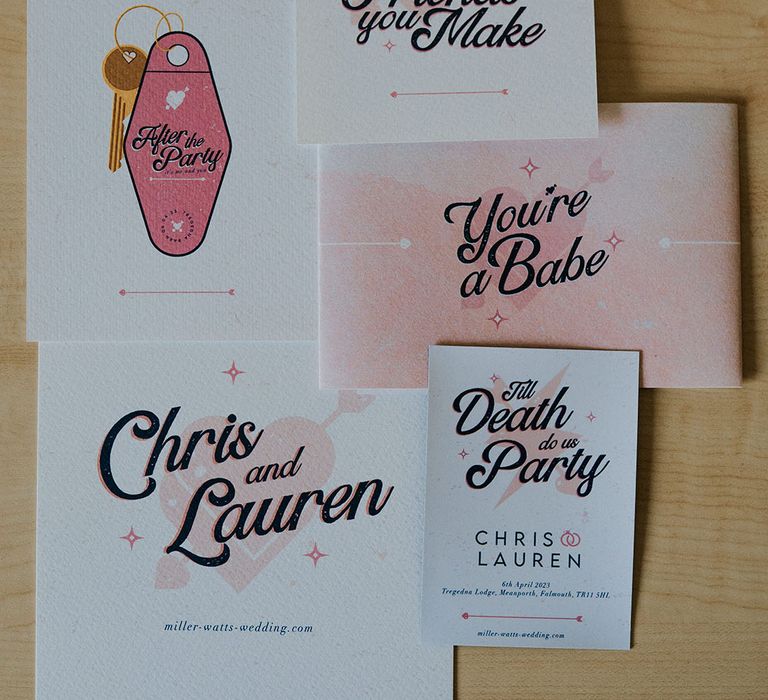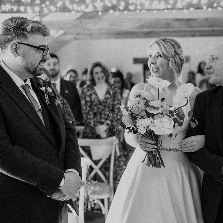Lauren & Chris' vibe was punk rock boho. As music fans, they wanted this to be reflected in their decor including displaying their fave lyrics on banners throughout the venue, music-themed table names, favours, and a record player guest book! The party got started with a rock and noughties-themed setlist. In addition to this, Lauren's first ever words to Chris were 'You're a babe', so of course, this also played a part in their invitations and banners, which they DIY'd! Some of the couple's favourite moments include the alpacas (!), the pink Cadillac wedding car, and speeches from Lauren's mum and dad. Our personal absolute highlights of this day include Lauren's pink denim jacket cover-up and sunglasses combo, THAT dessert table and the cute alpaca cake toppers. Of course, we also love that this couple had Everything I Know About Love by Dolly Alderton as one of their wedding readings.