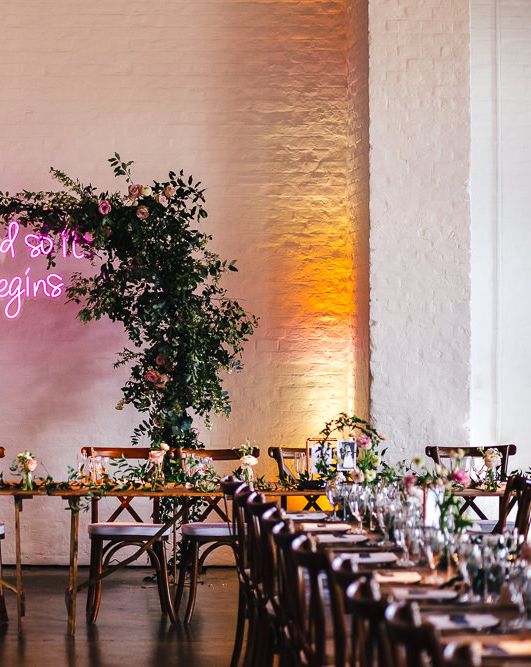 We aimed for a 'modern urban' vibe, keeping it simple, on trend with a few pops of fun (like the flower wall we made ourselves). It was important that our family had a role to play, whether making menu holders, signs, the table plan, or endless hours making flowers, which is why lots of parts were DIY, making the day even more personal.