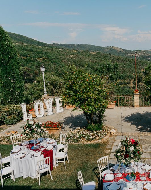 Wanted the decor to link to the setting. Being outdoor in the middle of Umbria we needed vibrant colours, rustic styling. I chose, raspberry red and copper. Copper cutlery, copper table name stands. Copper writing on stationery. Then raspberry table runners, red, pink raspberry flowers intertwined with white and plenty of greenery to keep the rural style. Crates dotted everywhere for decoration. I scoured