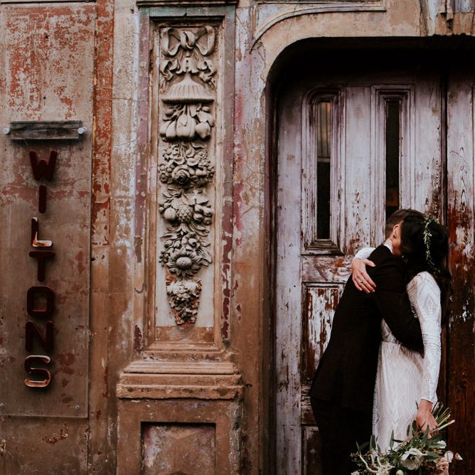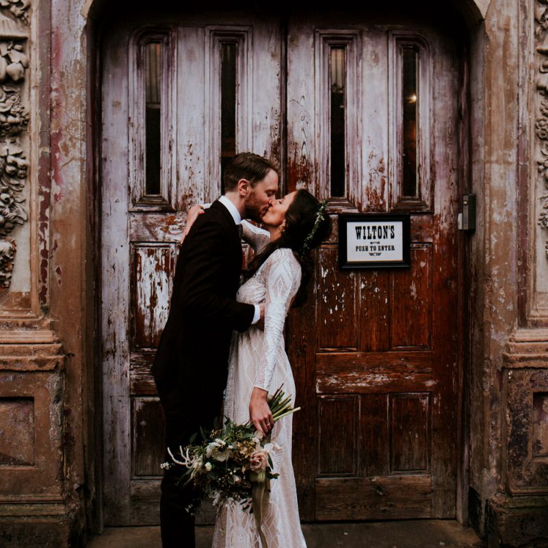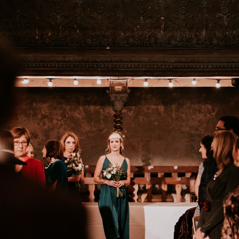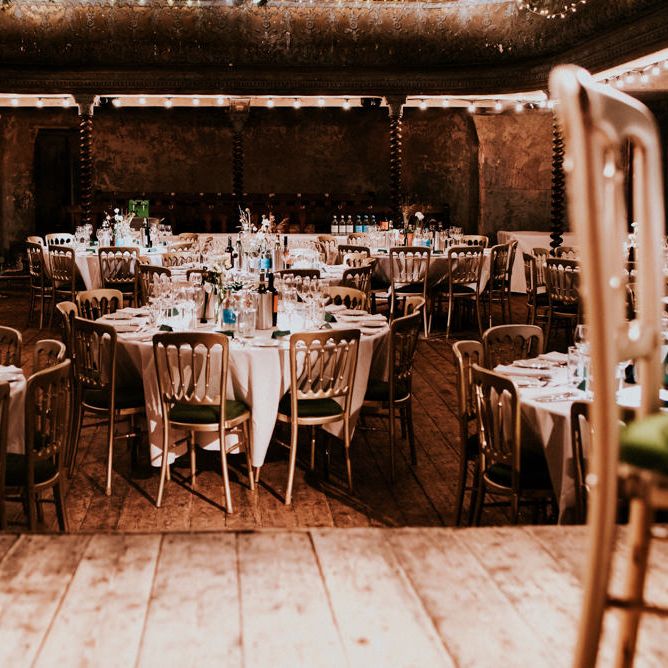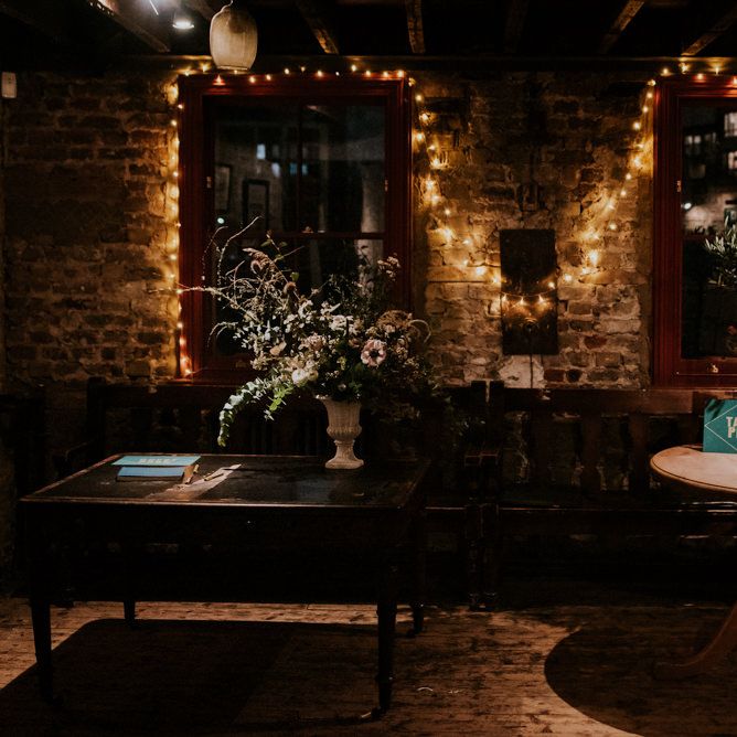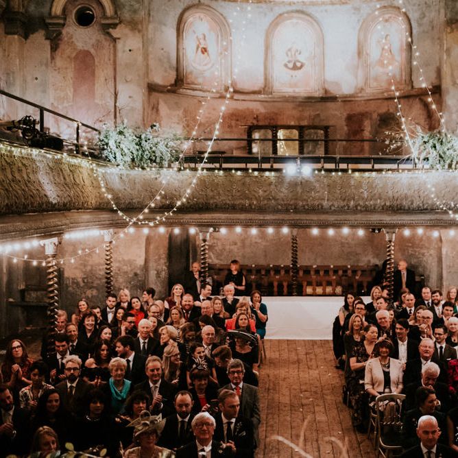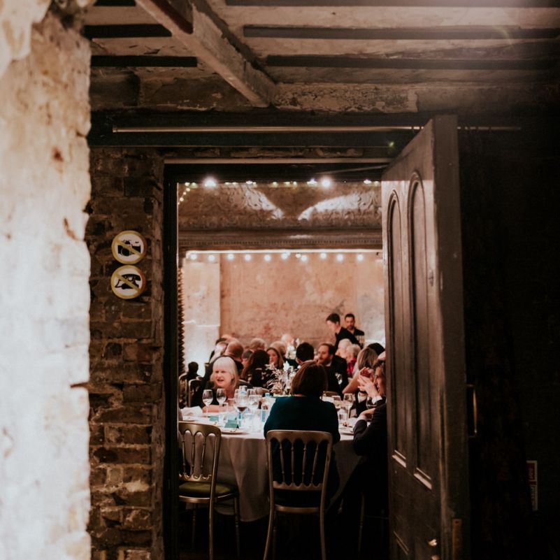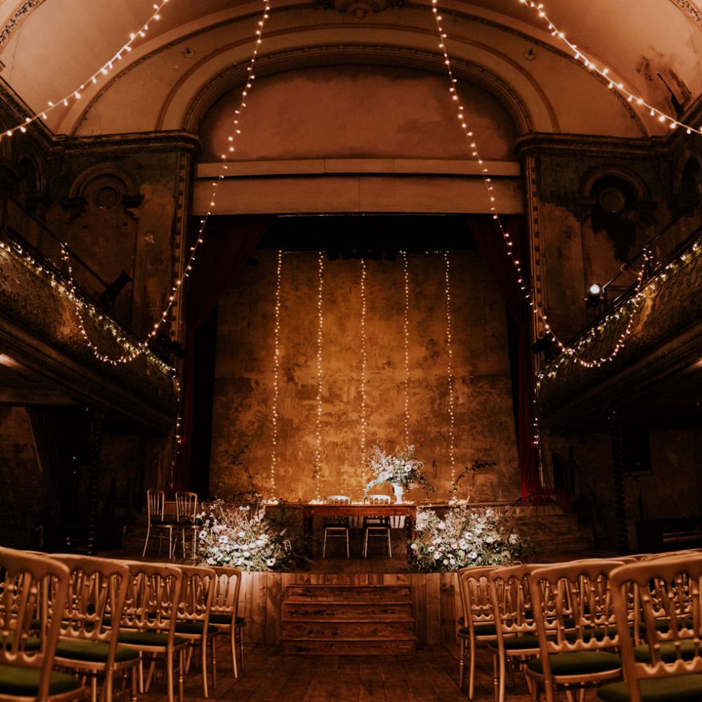 We started out intending to do something very low key and wanted to make it as easy as possible for our guests to come without travelling huge distances or spending an arm and a leg. As soon as we went to see Wilton's though, the low key thing went out the window - the ceremony itself had to be conducted with us on the stage! But the building is so old and atmospheric that it ultimately spoke for itself - we had some foliage, dried flowers here and there but the lighting did much of the work and really it needed very little styling.