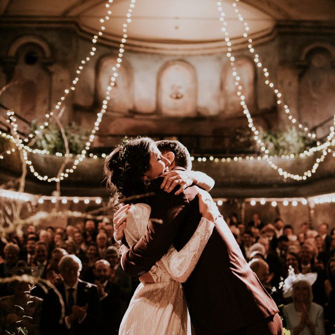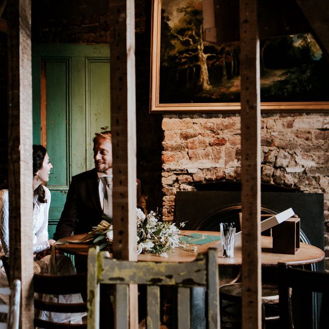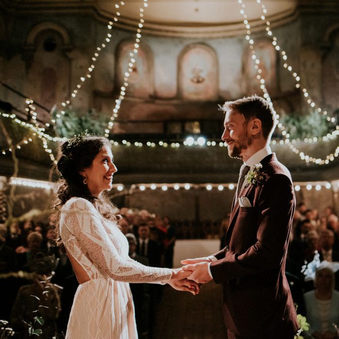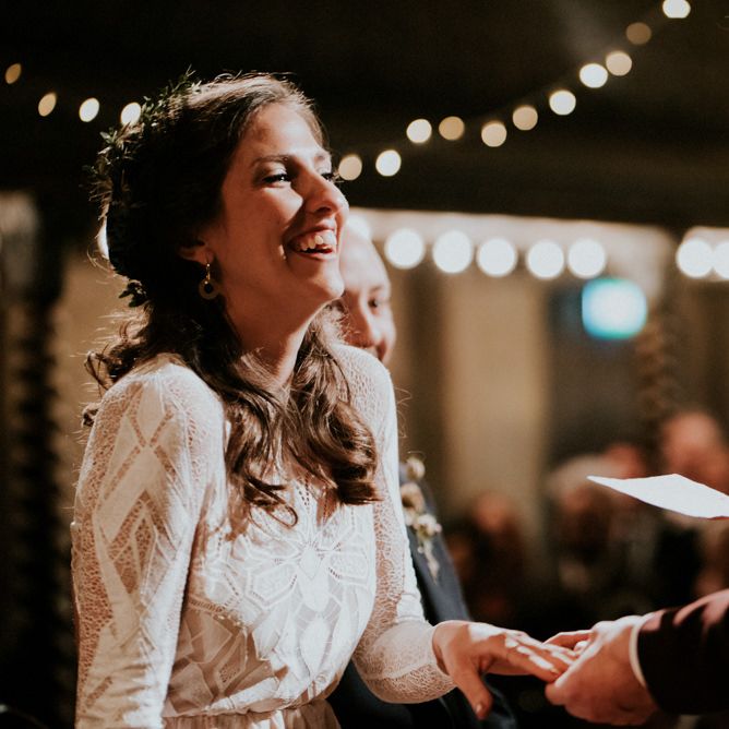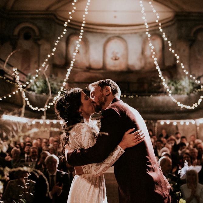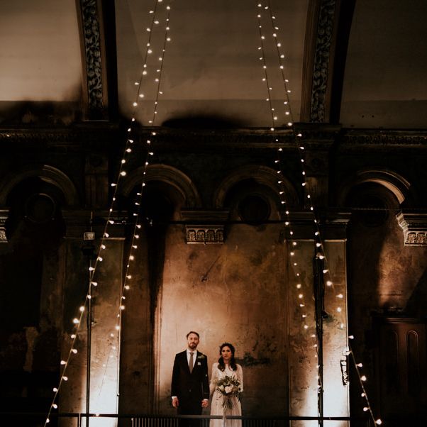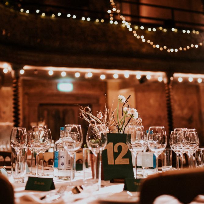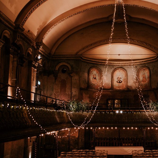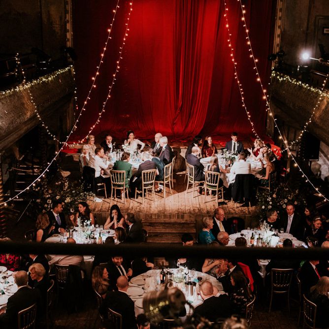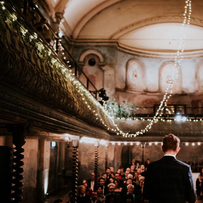 We started out intending to do something very low key and wanted to make it as easy as possible for our guests to come without travelling huge distances or spending an arm and a leg. As soon as we went to see Wilton's though, the low key thing went out the window - the ceremony itself had to be conducted with us on the stage! But the building is so old and atmospheric that it ultimately spoke for itself - we had some foliage, dried flowers here and there but the lighting did much of the work and really it needed very little styling.