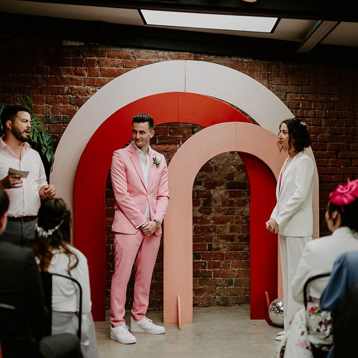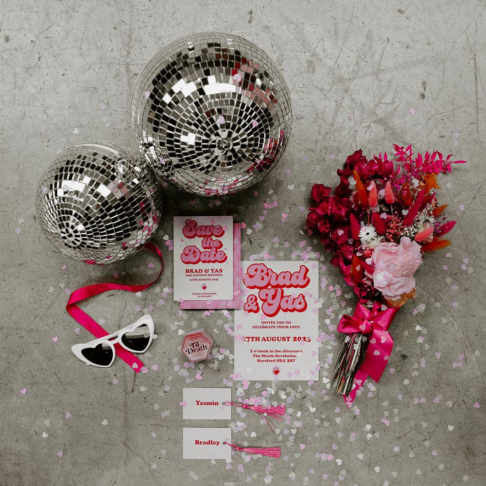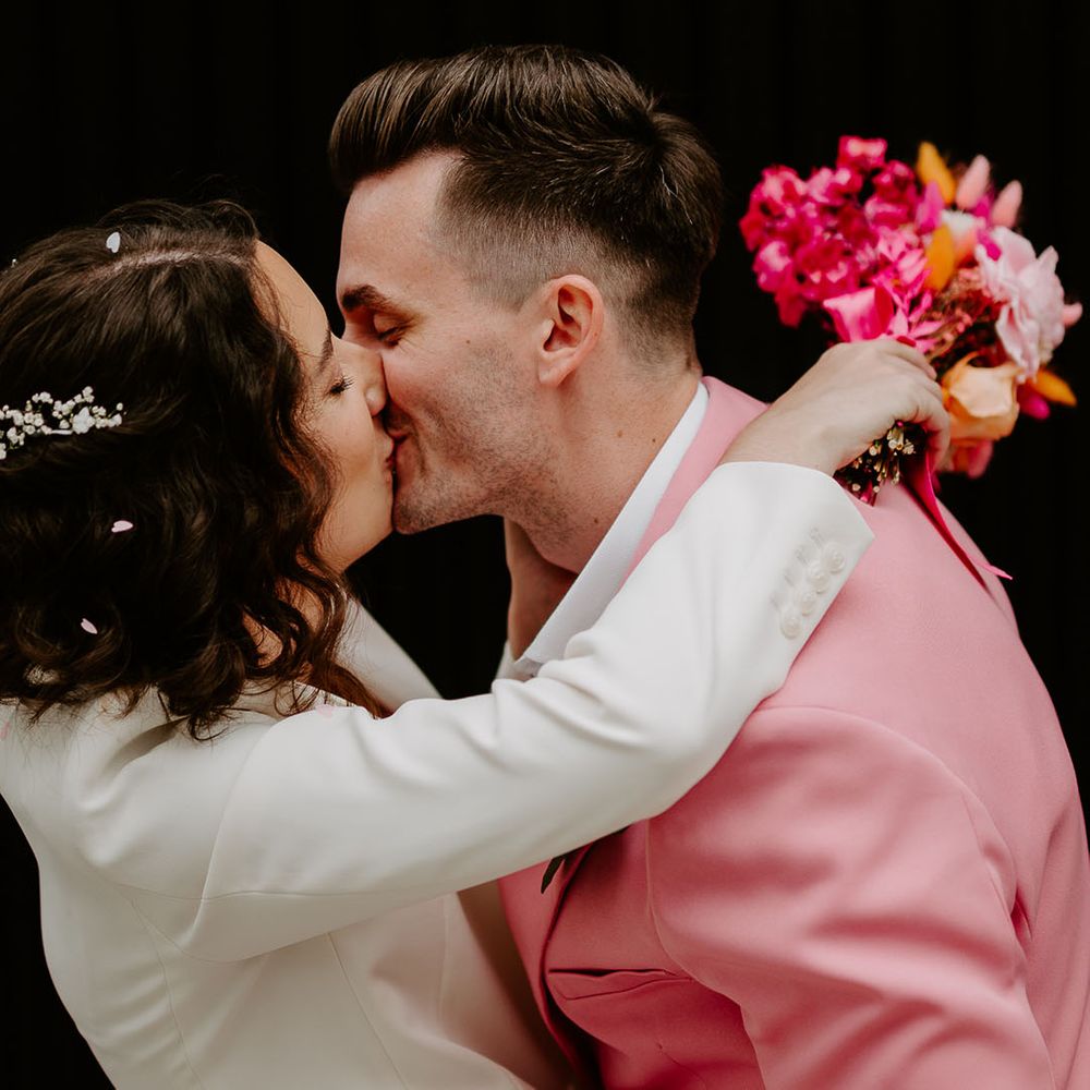 bride in short wedding dress with groom in pink suit at pink retro disco theme wedding