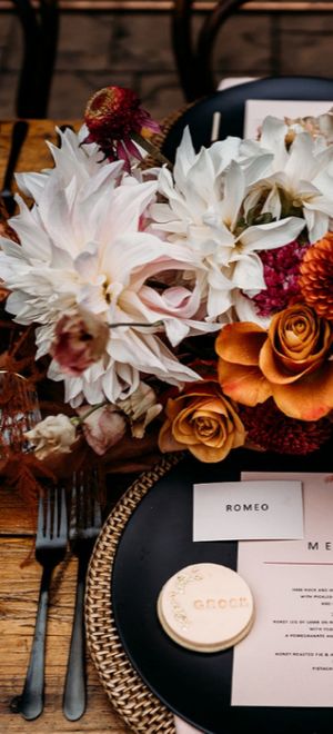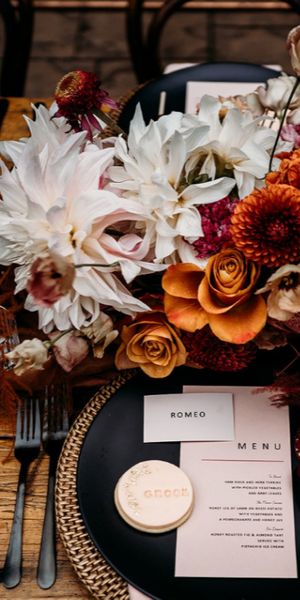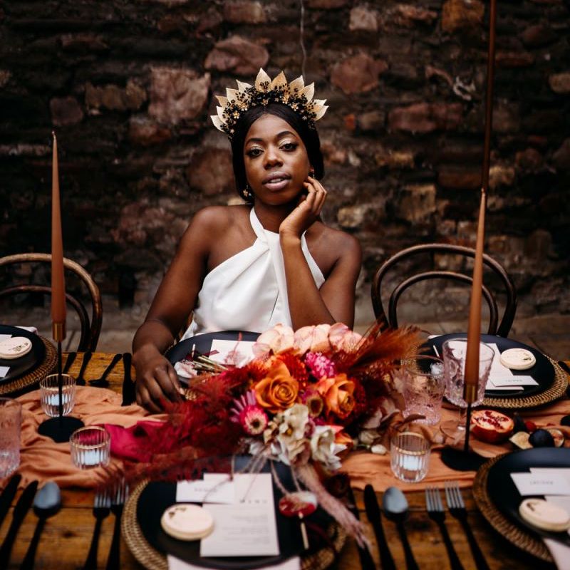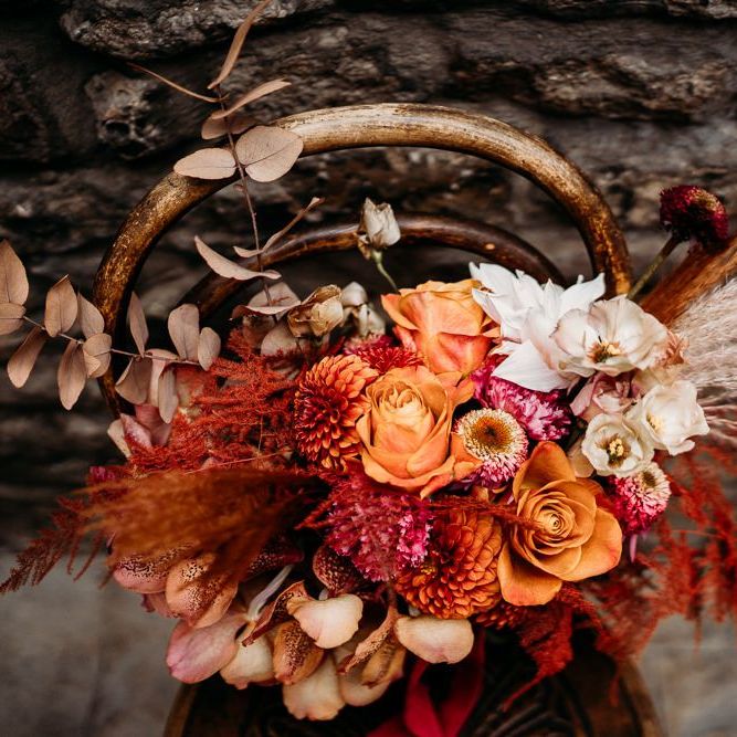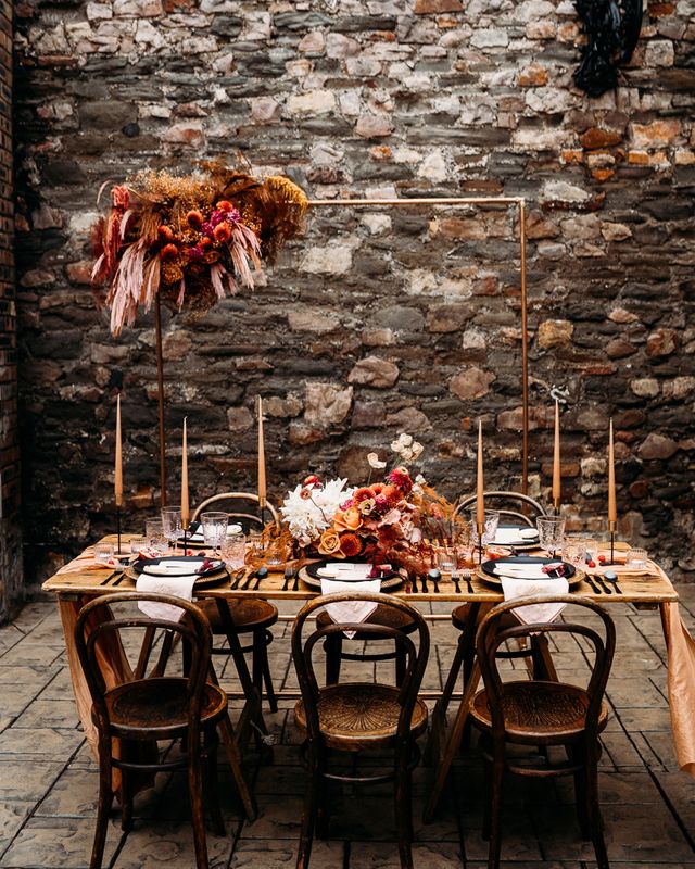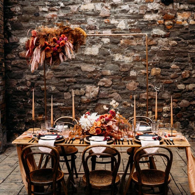 We wanted to create a romantic, bohemian, luxe and relaxed/wild themed wedding styled shoot. We chose a colour palette of rust, caramel and pink and used both fresh and dried flowers and foliage with touches of raspberry colour, black and gold.