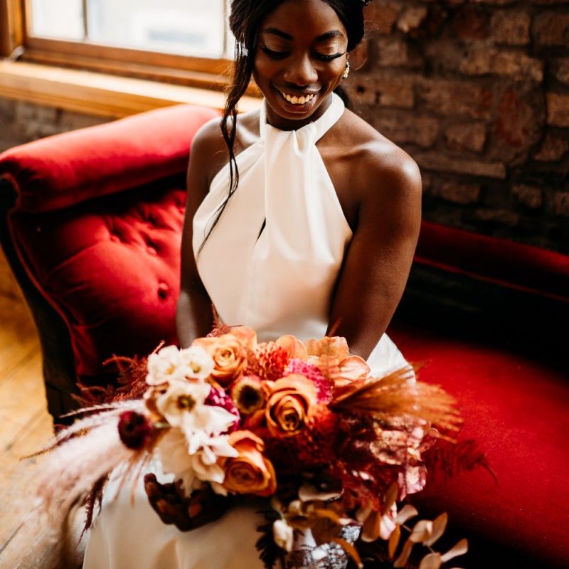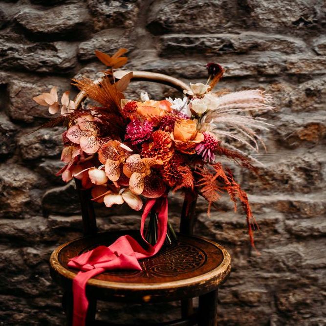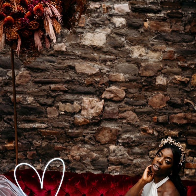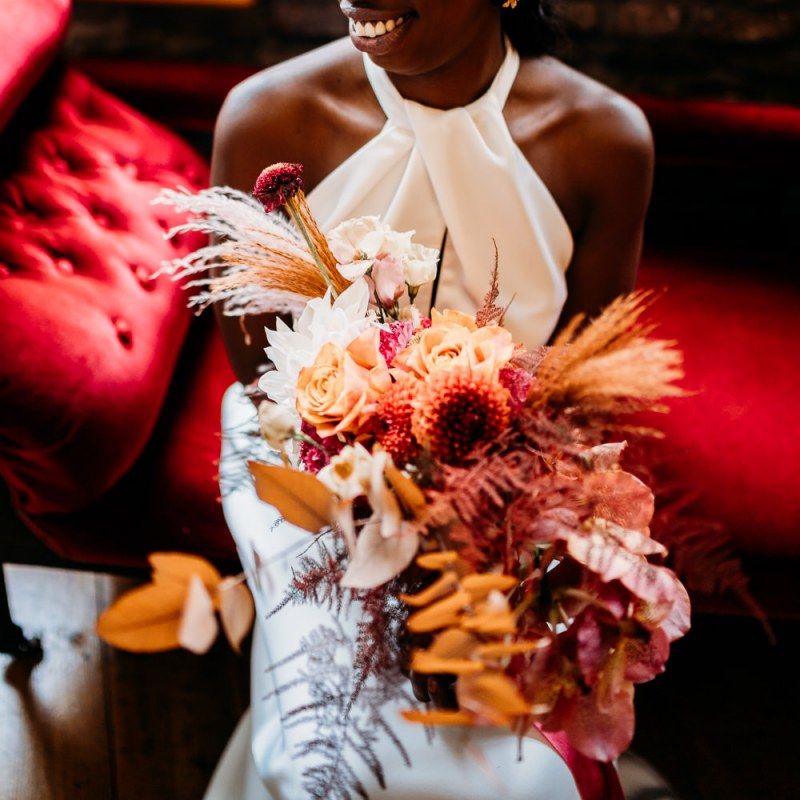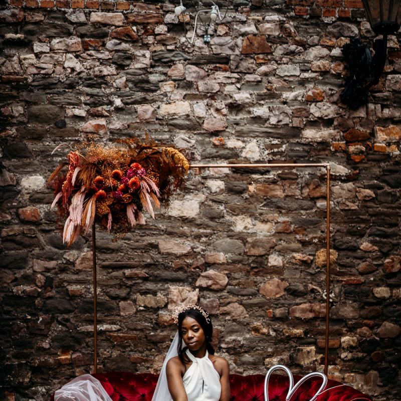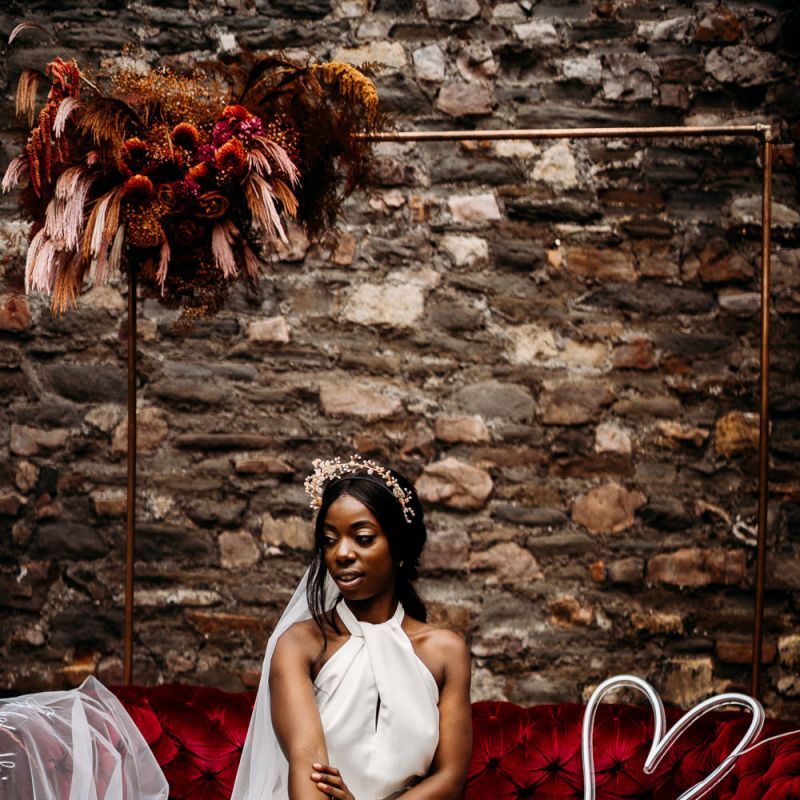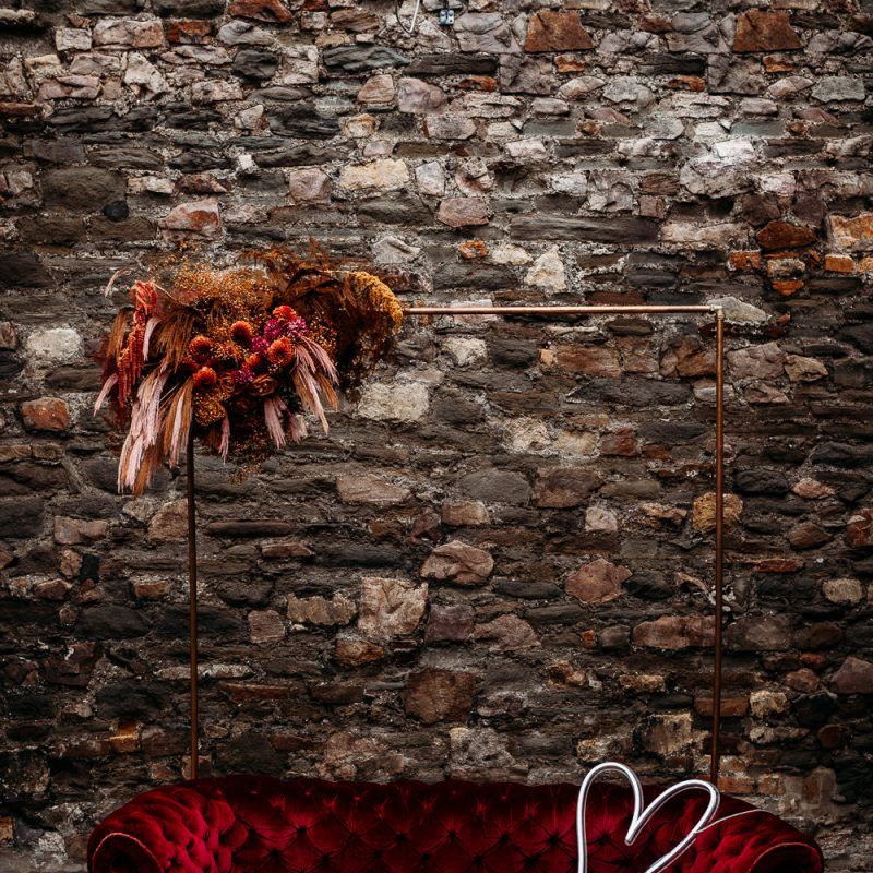 Using structured shaped flowers such as roses this added formality and structure, creating a more luxury appearance. We combined this with a cloud-like texture to create a relaxed look for a much more soft and romantic feel. Our concept was formed from wanting to create something luxurious but with a bohemian twist. Using a lot of the caramel, rust and raspberry colours made the shoot really rich in tones, creating the most beautiful autumnal vibe. We chose Radnor Rooms as our venue because we wanted a venue that was bit stripped back, with bare bricks and exposed walls. An added bonus was that the venue already had the perfect coloured raspberry sofa and chaise longue to tie in with our theme.